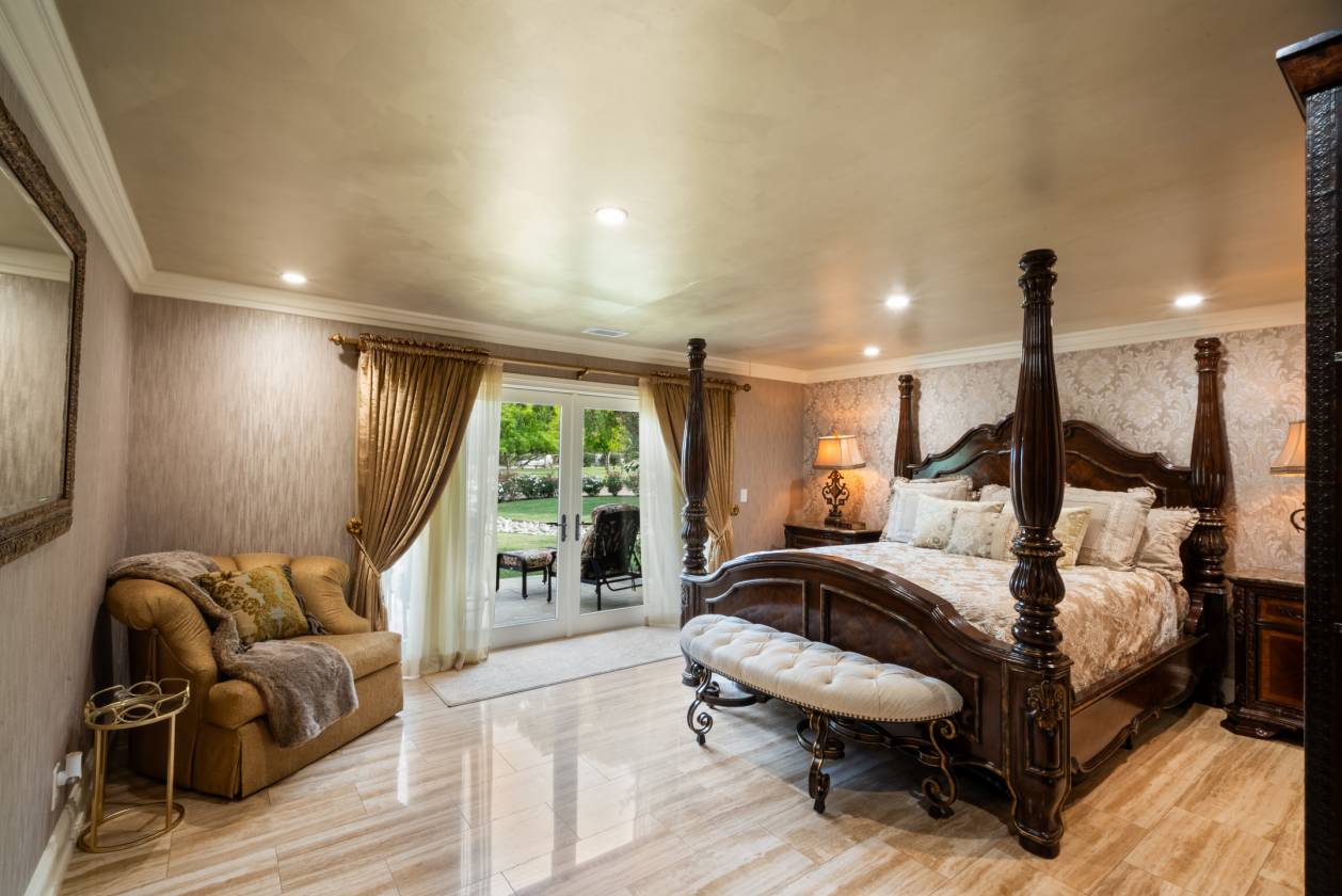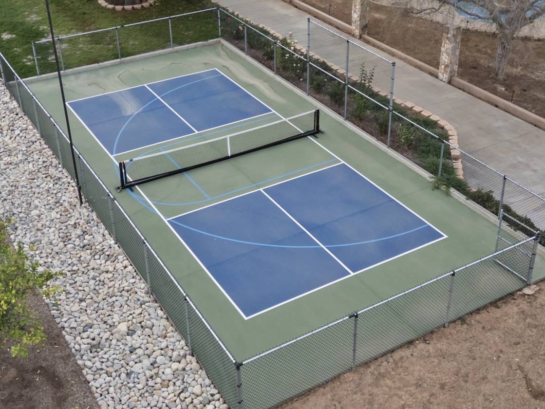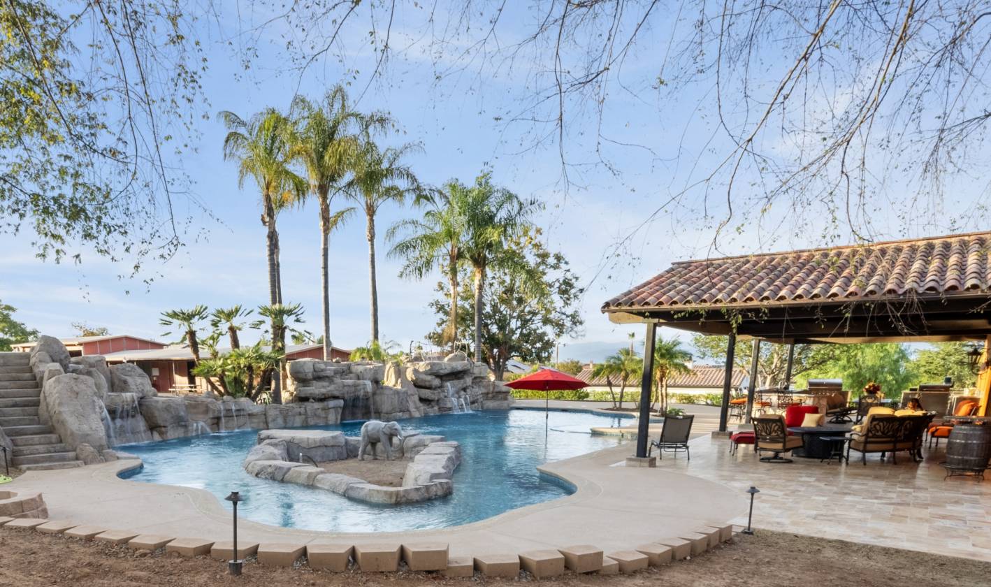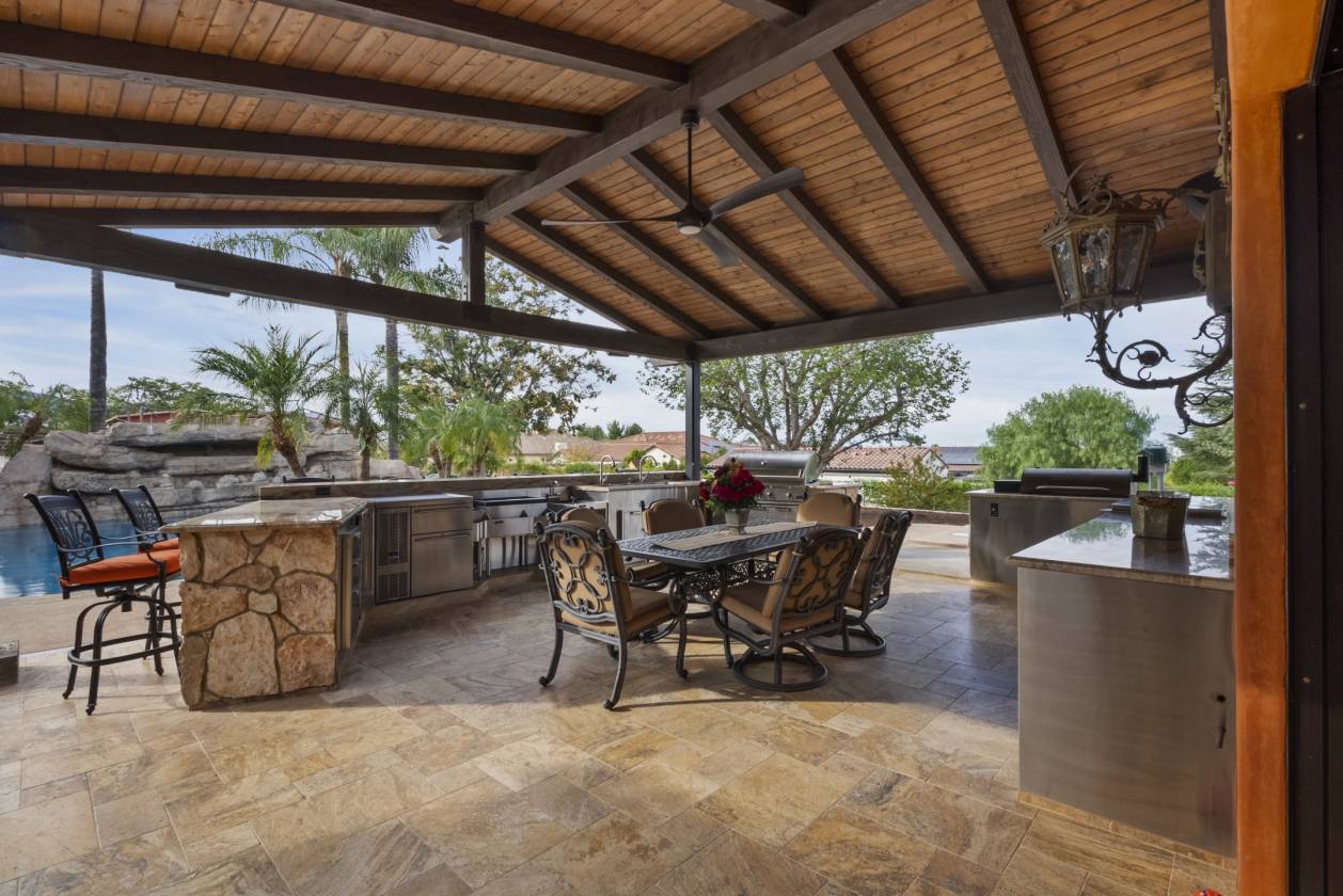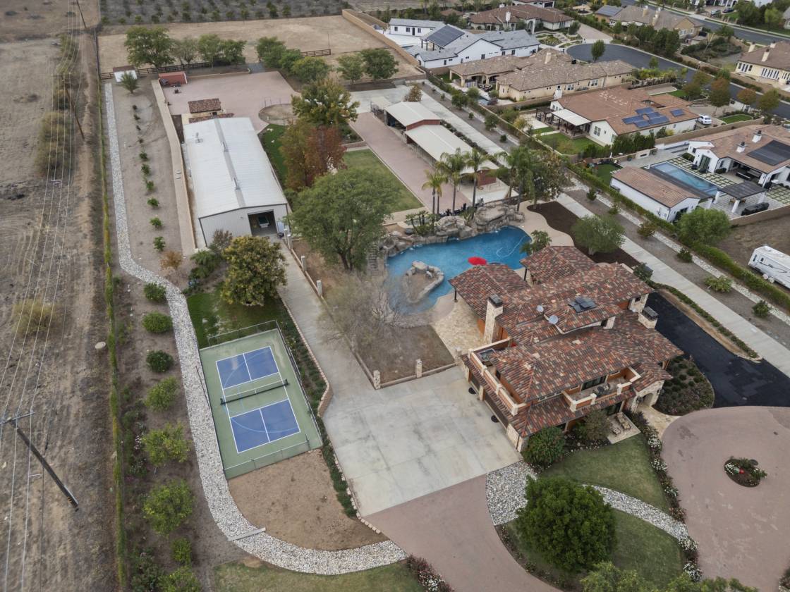 - The backyard is a private waterpark and entertainment delight. At its heart lies the stunning 90,000 gallon salt water pool, complete with a winding lazy river surrounded by luminous glow stones for magical evening swims. The extensive outdoor kitchen is ready to host grand events, complimented by a professionally installed sound system throughout the entire property and thoughtfully placed outlets throughout the landscape for lighting and events. The fully landscaped grounds feature a diverse collection of mature fruit trees creating a truly idyllic setting. The property includes a detached Guest House/ADU complete with its own living quarters, privacy, and dedicated two-car garage. All with the same sophisticated comfort as the main house, making it perfect for multi-generational living.