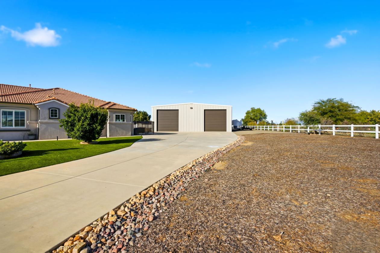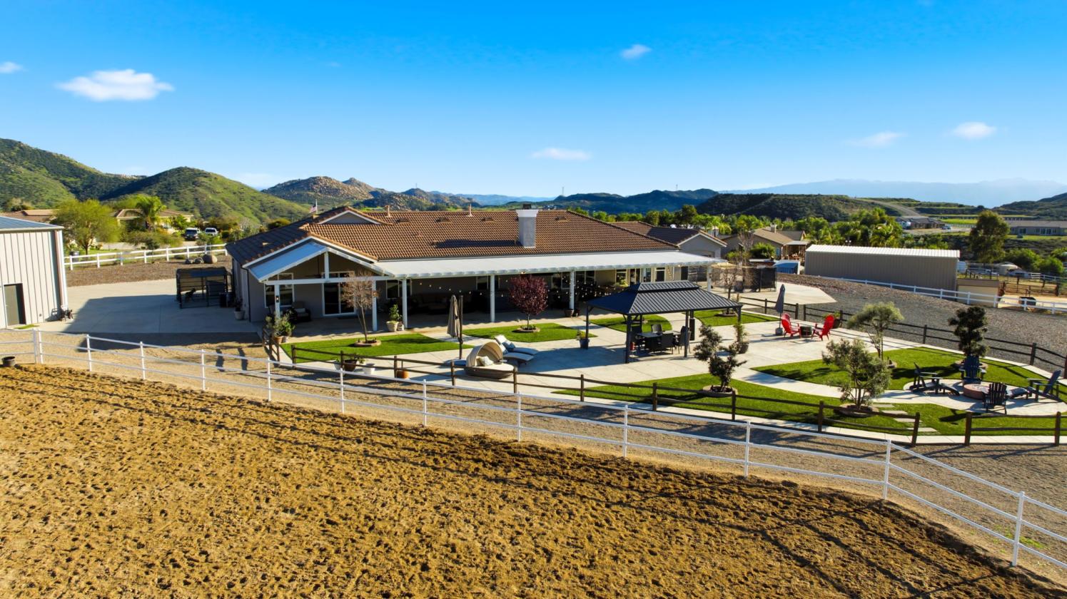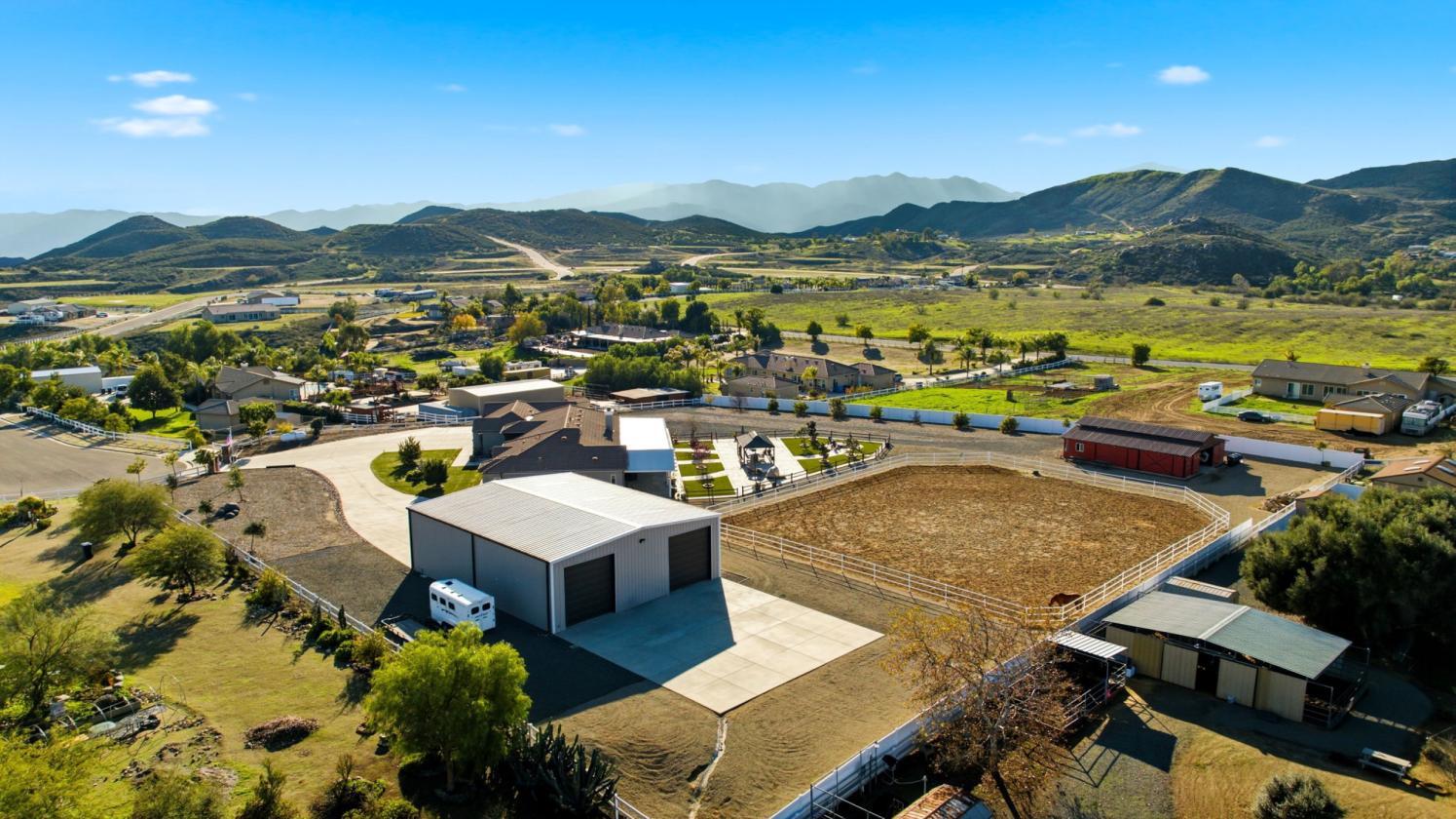 Tucked away in the highly desired community of Gavilan Hills at the end of a private cul-de-sac, this extraordinary custom built equestrian estate offers a rare blend of refined luxury, expansive grounds, and purposeful design across 2.46 scenic acres with panoramic views. Pulling up, you reach a private automatic gate to lead you up the expansive driveway and straight ahead is the property and to the right is the oversized RV garage with all the bells and whistles. The 3,596 square foot residence has been thoughtfully remodeled to elevate both comfort and sophistication, highlighted by luxury vinyl flooring throughout the home, a designer kitchen adorned with marble countertops and a giant island, ambient under-shelf and toe-kick lighting, and a curated wine nook that invites effortless entertaining. There are ample windows in the kitchen, dining, living, and bonus room for natural light and beautiful views of the grounds. Motorized window shades in the back of the home integrated with the security system and classic California shutters in the front add a layer of modern convenience and timeless appeal. There is a convenient bedroom/office towards the left wing of the home as well as a connected 4 car garage with epoxy flooring (single bay is a double with convenient pull-through) complete with an EV plug and Transfer switch on the electrical panel to protect against power outages for multiple breakers. The right wing of the home offers 4 additional guest bedrooms with 2 jack and jill bathrooms and the primary en-suite is at the end of the hall with sliding door to the backyard, dual closets and massive bathroom. Beyond the home, the estate truly distinguishes itself. A striking 3,000 sq ft double RV garage with 10,000 load capacity vehicle lift, full bathroom and dual RV 50 amp/septic/water hookups inside AND outside the building. The equestrian facilities are equally impressive, featuring a generous arena approximately 120' x 105' with decomposed granite footing and top quality 440 fencing, along with a dedicated Castlebrook barn offering three stalls, tack and feed rooms, and a complete wash station. The outdoor living experience is completed by manicured quality turf, an expansive Alumawood-covered patio with integrated lighting and fans, a spa, BBQ area, and multiple gathering spaces perfectly positioned to take in dramatic sunset views. This is a rare opportunity to own a turnkey ranch estate where luxury, lifestyle, and land converge seamlessly.