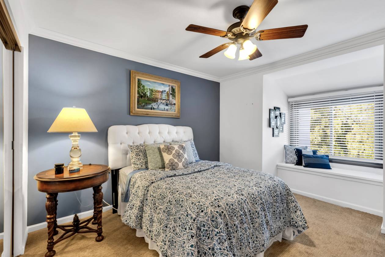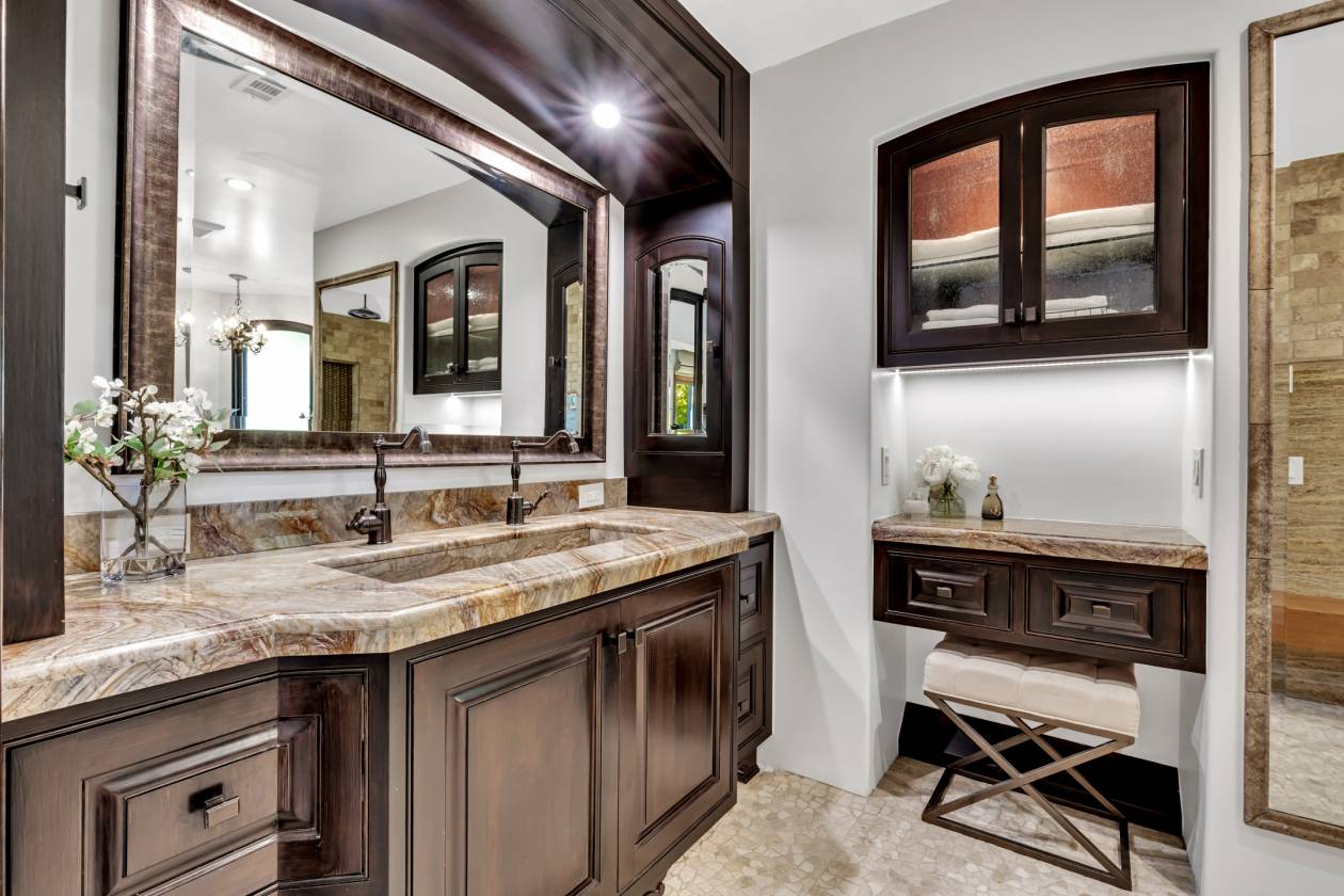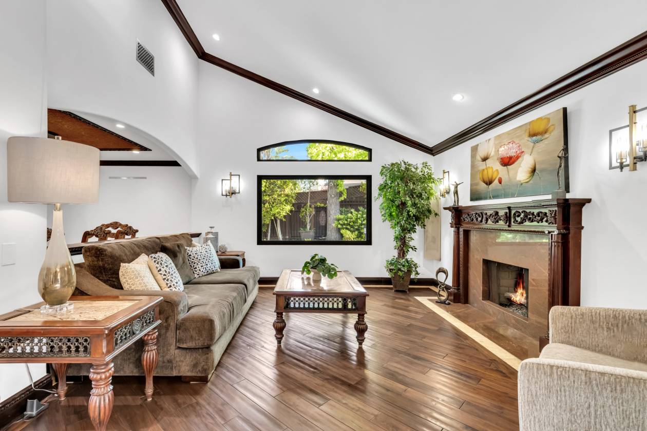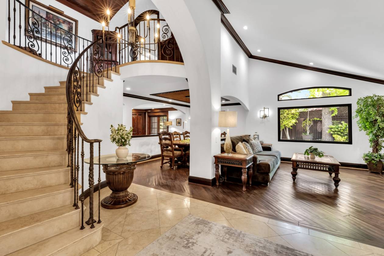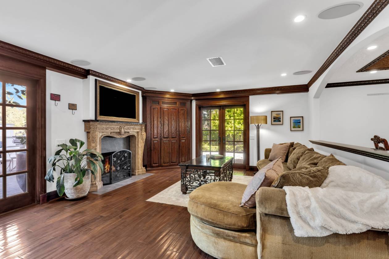 Set in the highly desired Equestrian Hills neighborhood, this stunning 4-bed + office + bonus room, 2.5-bath estate spans 3,047 square feet & sits on nearly 1 acre of gorgeous usable land. With amazing space for horses & an ADU, this one-of-a-kind property is brimming with character, elegance, & future potential. Blending timeless Spanish Revival architecture with modern luxury, the home welcomes you through custom double doors into a dramatic two-story foyer with a sweeping staircase. Warm walnut plank flooring & polished travertine flow through the living spaces, complemented by high-end designer lighting, custom paint treatments, & built-in audio throughout. All interior doors are solid 1 ¾” alder wood, & the entire home is fitted with dual-glazed alder wood windows & French doors for seamless indoor-outdoor flow. The expanded kitchen features custom alder wood cabinetry, slab onyx counters, & chef-grade appliances. Entertain in style with the custom wine closet off the dining room, & gather around either of the 2 fireplaces in the living & family rooms - each with bespoke mantels & surrounds. The downstairs office is finished with custom wainscoting, crown molding, & large windows that flood the space with natural light. The downstairs powder room is a showstopper in its own right, finished in Venetian plaster & a custom vanity. The primary suite is a true retreat with a cedar-lined walk-in closet & remote-controlled window coverings, plus a luxurious ensuite featuring heated floors, copper soaking tub, dual-head walk-in shower, quartzite trough sink & custom teak vanity & bench - all evoking a serene spa experience. The upstairs hall bath offers 2 separate custom vanities & an expansive walk-in storage closet. A bonus/theater room with Sonance speakers offers the perfect escape for movie nights or creative projects. Enjoy views of the hills & trees from the beautifully designed backyard, which includes custom paver hardscape, a built-in BBQ with Taj Mahal stone countertops & a fire pit. The expansive driveway offers parking for 6 or more vehicles & is bordered with stone pavers & designer landscape lighting. A 2nd driveway leads to the upper level of the property - perfect for a future ADU, horse corral, or private retreat area with even more breathtaking views. Just minutes from hiking & riding trails, shopping, dining, & freeway access - all within the highly rated Conejo Valley School District - this is more than just a home, this is a masterpiece!
