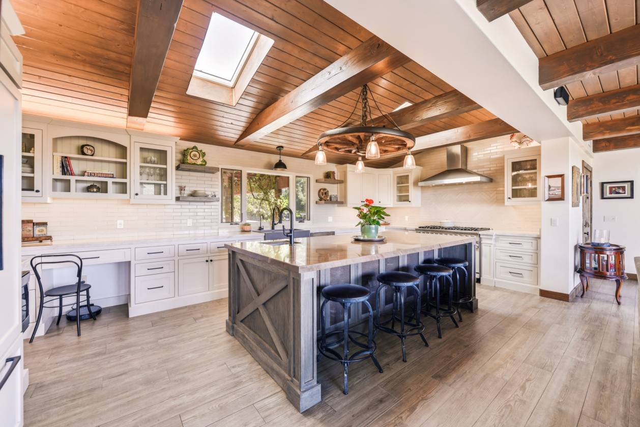 • Vaulted wood-beam ceilings with skylights and a stone-hearth fireplace built from rock harvested from the property