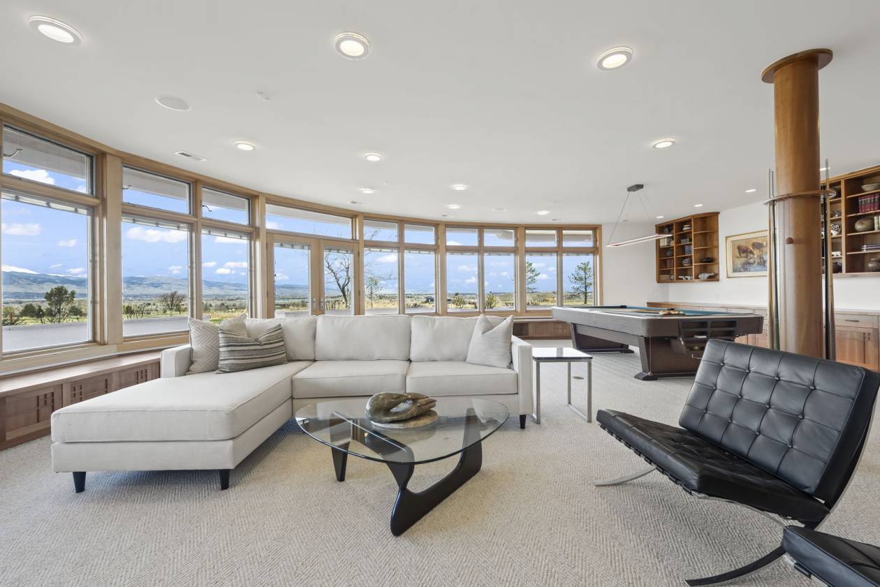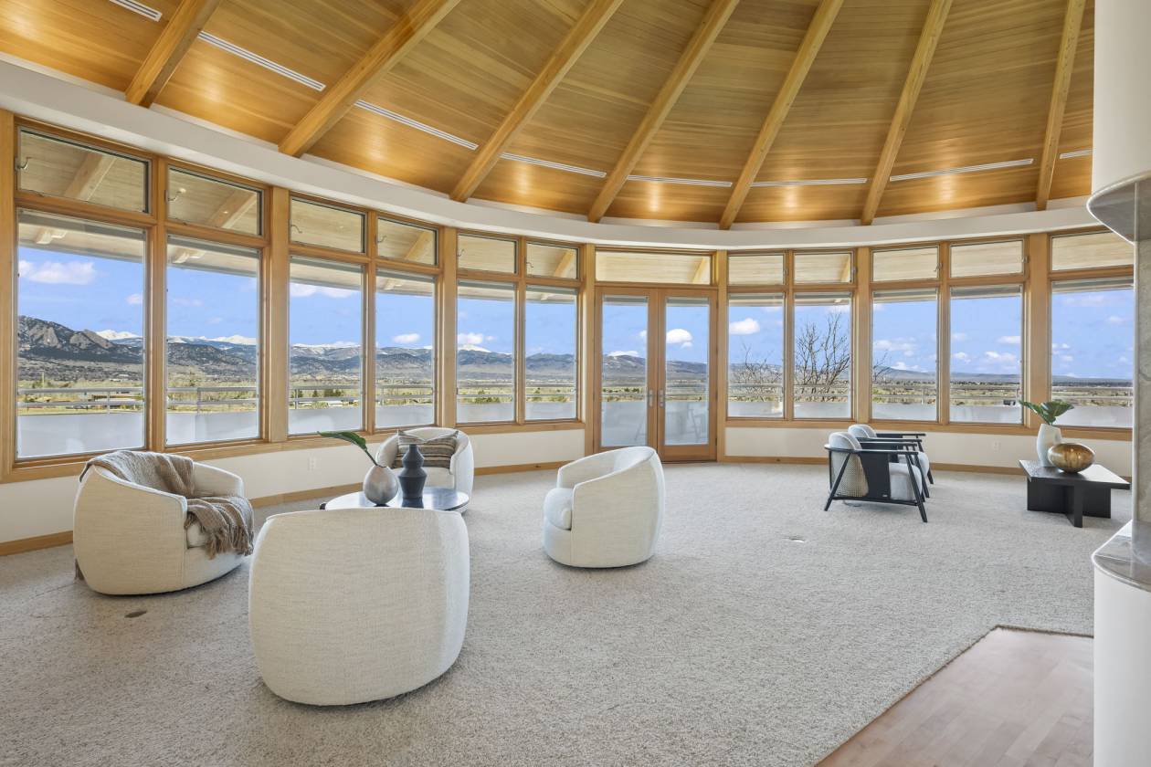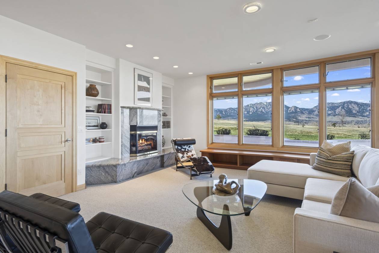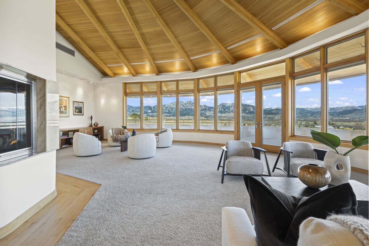 - Entryway and Great Room – custom designed maple wood floor designed to suggest an arrow pointing toward the apex of the home’s curve, which is directed to Long’s Peak; 365 degree gas fireplace; soaring cathedral ceiling rich with wood beams and wood slats. A wall of windows affording a panoramic view from Eldorado Canyon to the Flatirons to Downtown Boulder to the Continental Divide. Carpeted social area; custom built ins; custom lighting; French door access to the main level balcony.