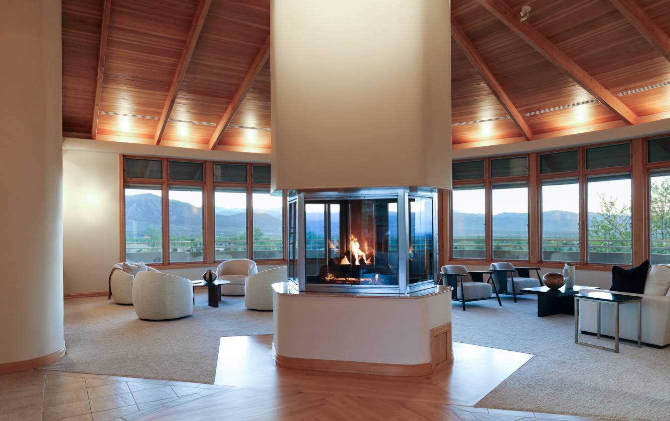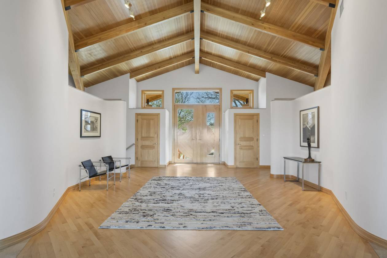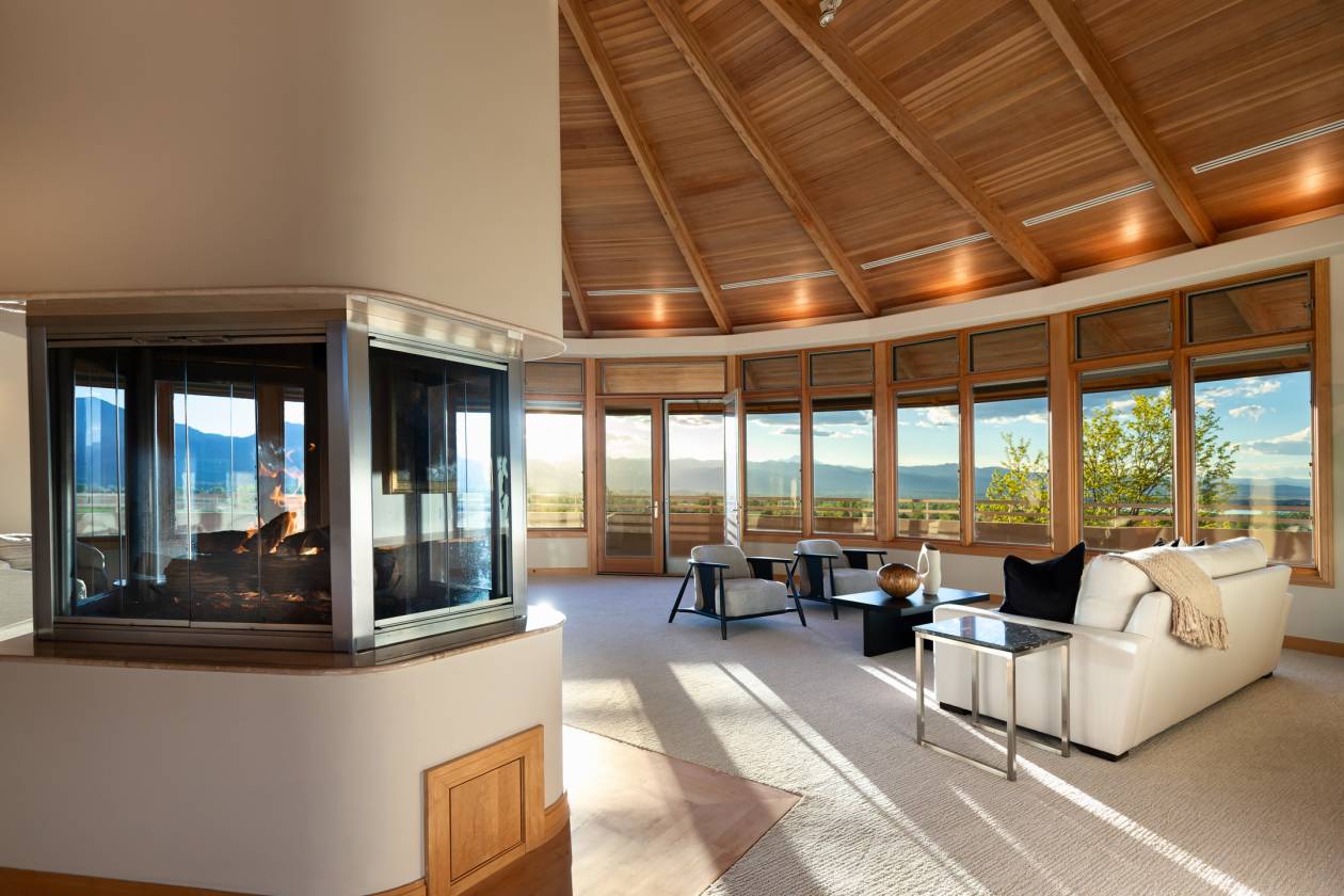 - Entryway and Great Room – custom designed maple wood floor designed to suggest an arrow pointing toward the apex of the home’s curve, which is directed to Long’s Peak; 365 degree gas fireplace; soaring cathedral ceiling rich with wood beams and wood slats. A wall of windows affording a panoramic view from Eldorado Canyon to the Flatirons to Downtown Boulder to the Continental Divide. Carpeted social area; custom built ins; custom lighting; French door access to the main level balcony.