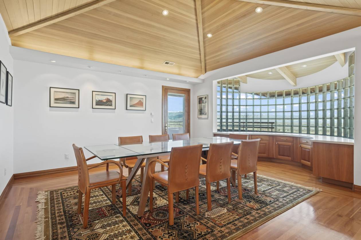 - Dining Room – custom cherry wood floors and ceiling; rotunda; direct access to mail level balcony; wood tray ceiling