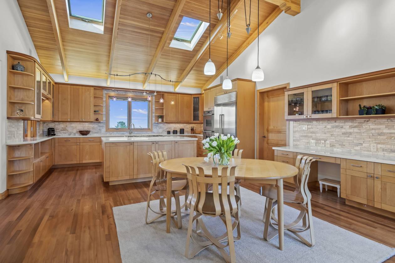 - Kitchen – SubZero refrigerator/freezer; Dacor stainless steel double ovens; Thermador gas cooktop with retractable down-draft vent; rich white quartz counter tops; multi-hued marble subway tile back splash; custom cabinetry throughout the house from Kamtz Custom Cabinetry in Loveland, CO. Eat-in area with casual seating area.