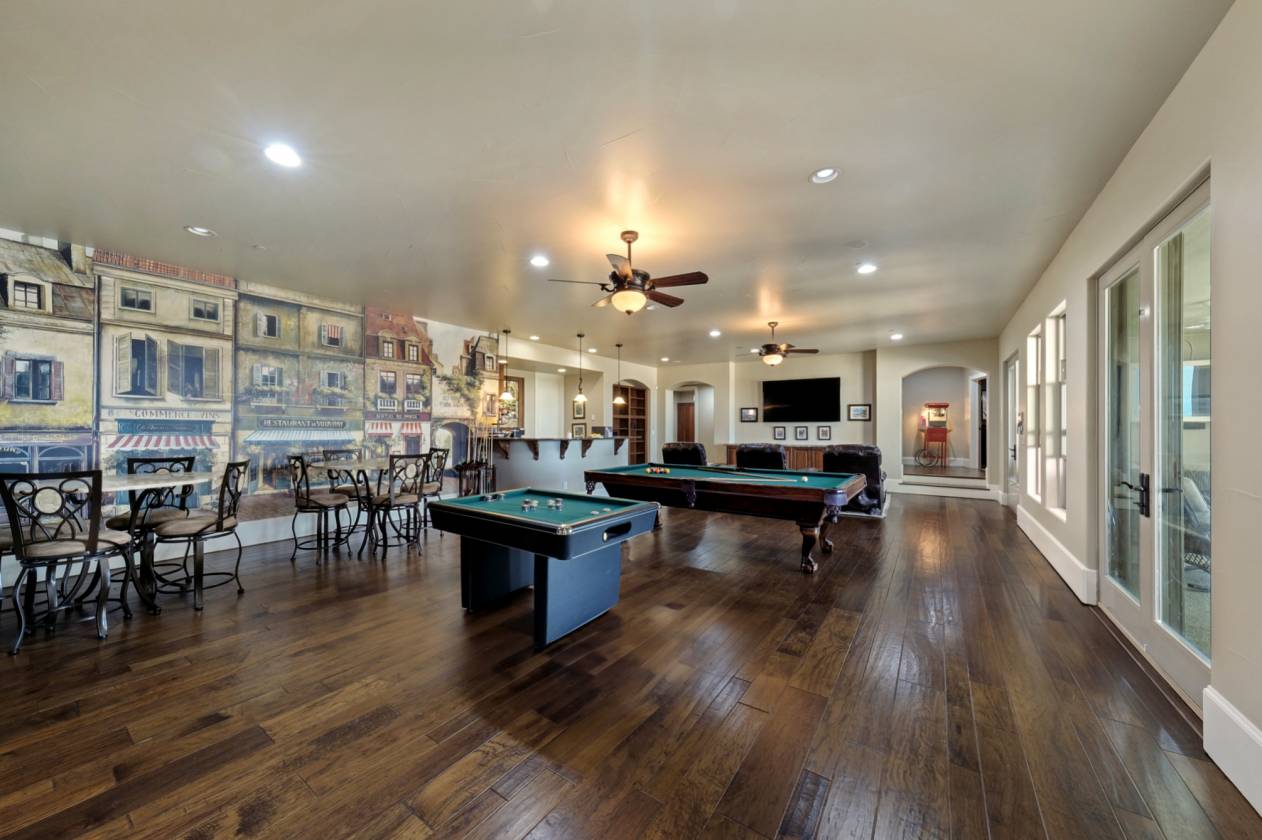 - ● Recreation Room: Game tables, Italian mural, walk-out access
