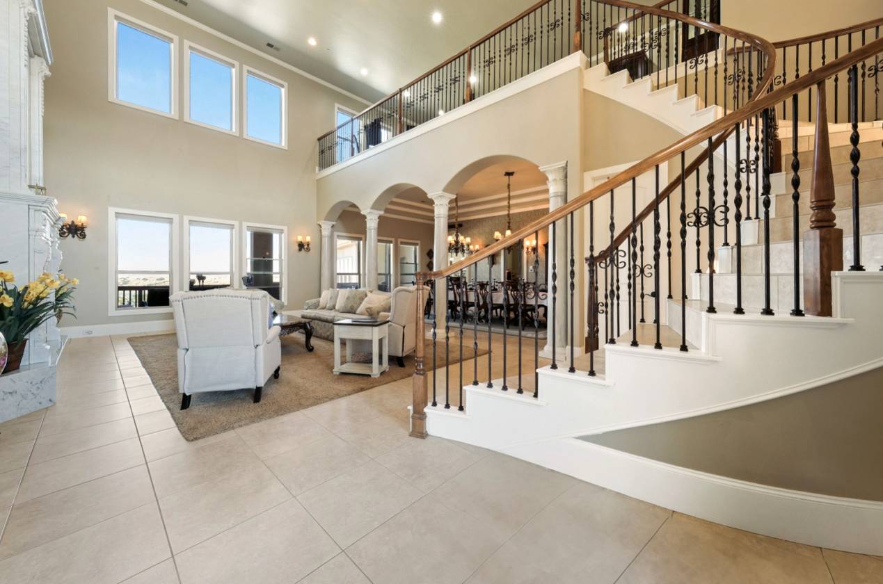 - ● Entry: Double-door wood/iron/glass, 2-story foyer with antique chandelier