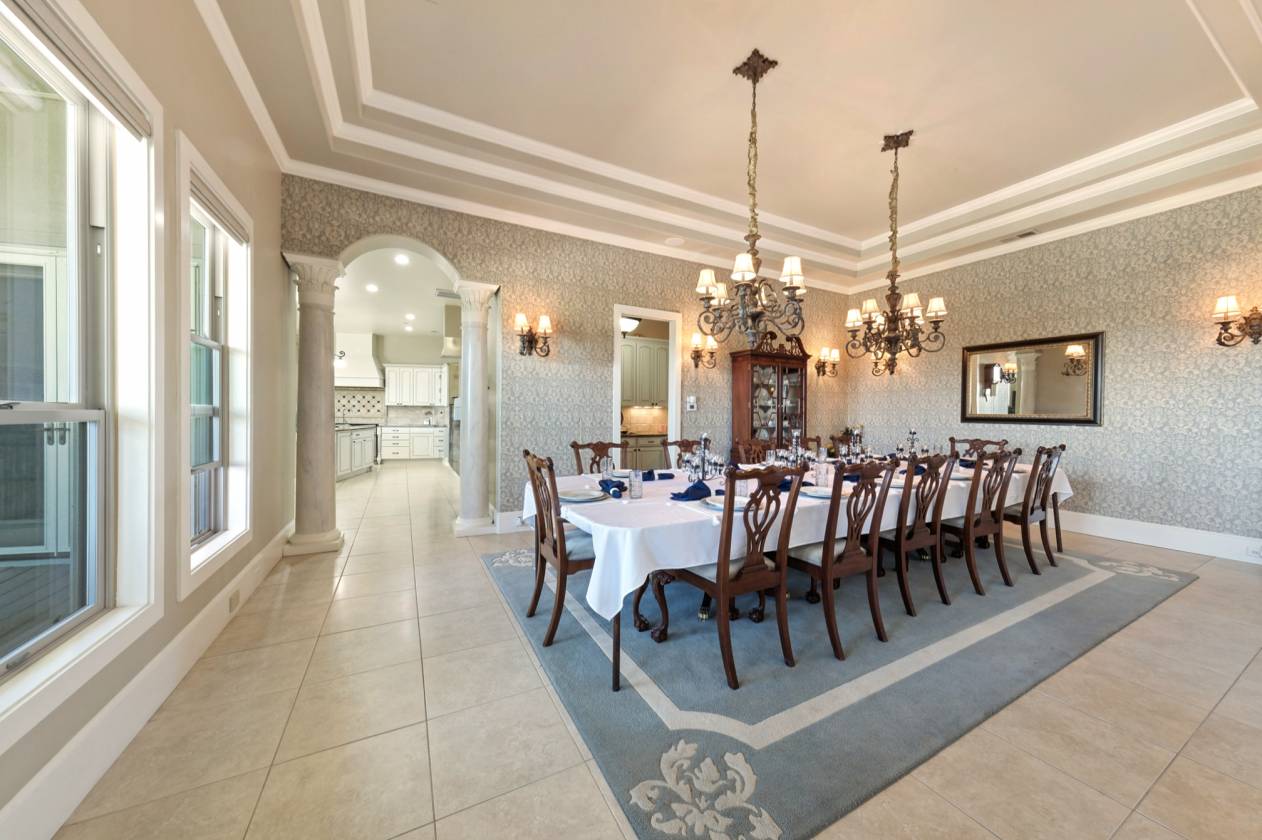 - ● Dining Room: Tray ceiling, chandeliers, sconces, built for gatherings