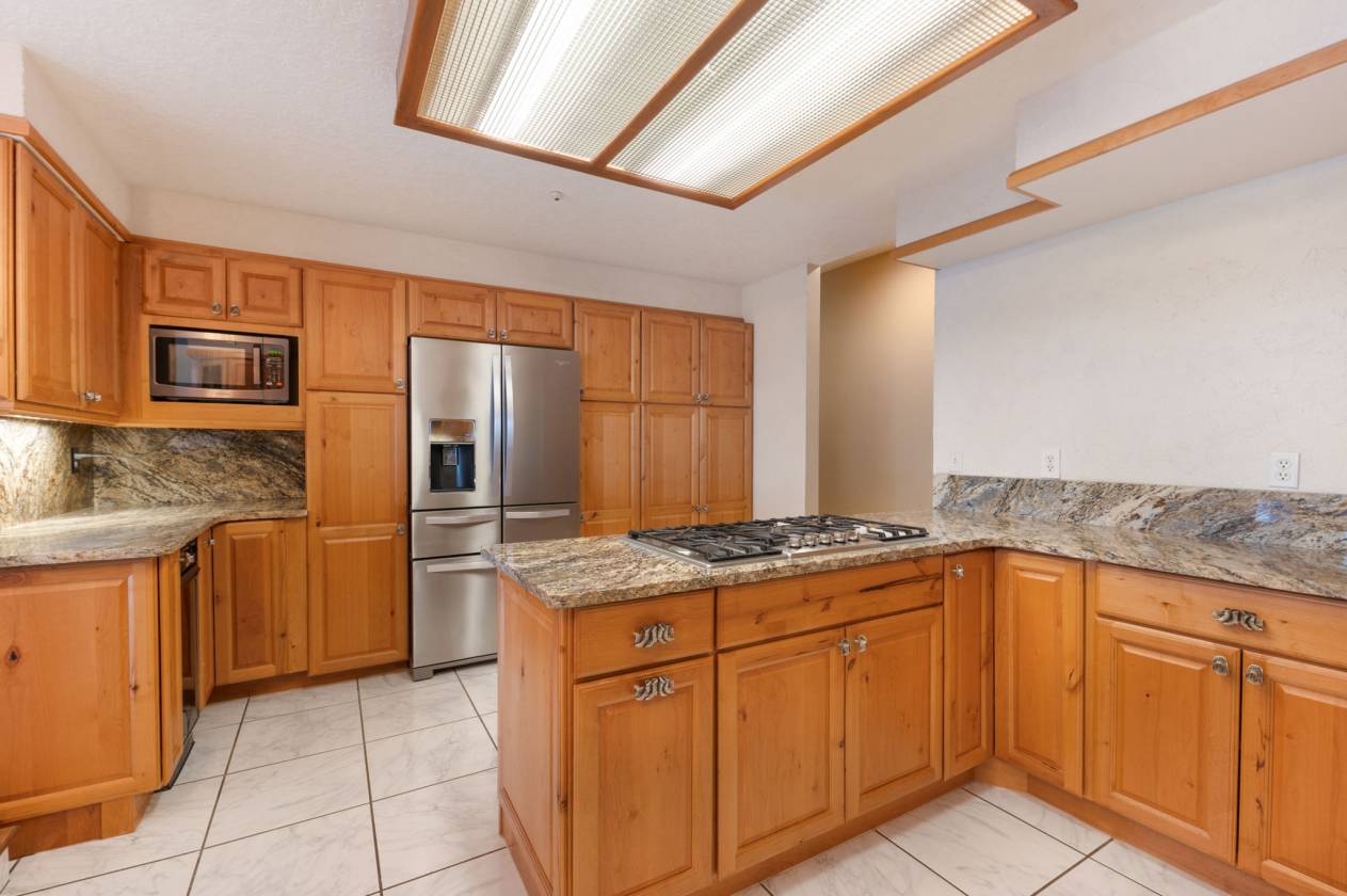 - - Kitchen features a center island, granite countertops, backsplash, 6 burner gas countertop range