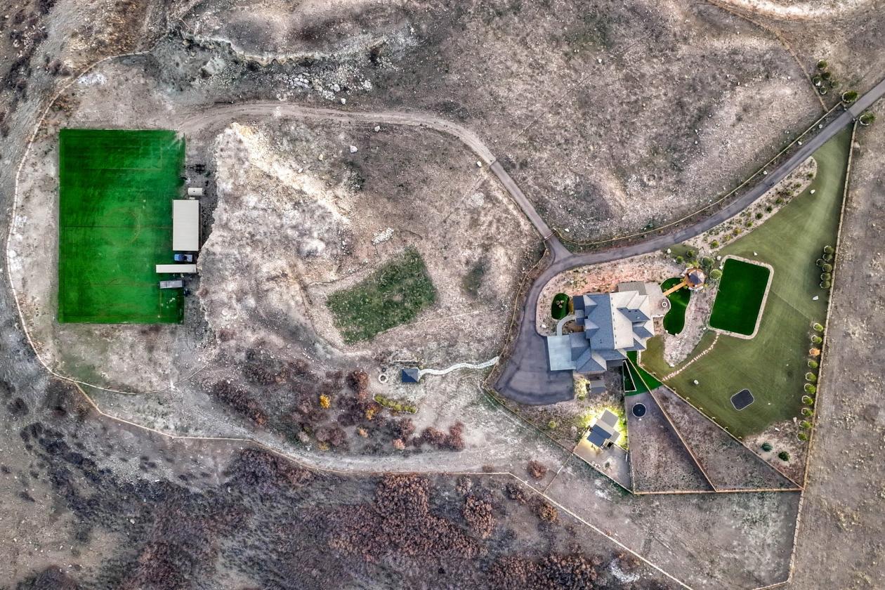 - NO MAINTENANCE YARD-Grass is artificial turf, professional size soccer field, security gates and cameras, fully fenced, 2 gazebos-one with a hot tub, one with a stone fire pit, heated & fenced chicken coops & dog houses, 2 auxiliary garages w/electric for off road vehicles, covered outdoor kitchen, beautiful brick paver patio, putting green, 15x20 built-in yoga mat, steel storage container, diesel fuel tank, & awe inspiring rock formations.