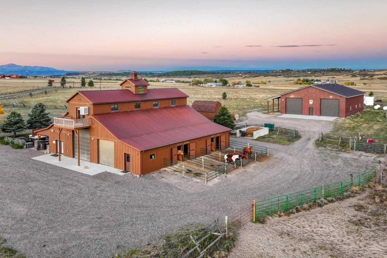Huge Pikes Peak views and sophisticated Colorado ranch luxury come together in a property purpose-built for entertaining and elevated country living. This exceptional property blends high-end finishes with fully equipped equestrian and ranch infrastructure, creating a rare offering for those seeking both beauty and functionality. The land has four fenced and cross-fenced pastures, with auto-waterers and run-in sheds. Seasonal pond, 150' x 200' arena, 4-stall barn with individual runs and auto-waters, dedicated tack room, and outdoor wash area support a true equestrian working ranch. Fueling and equipment needs are met with above-ground diesel and gas tanks, plus a full RV hookup with water, sewer, and electric for guests or ranch hands. The main home balances true ranch character with upscale sophistication. Hickory floors, alder cabinetry, natural stone accents, five fireplaces, and dramatic Australian waterfall granite set a warm, refined tone throughout. A grand custom entry door with etched glass opens to a spacious living room defined by soaring ceilings and hand-carved Douglas fir beams. The inviting eat-in kitchen features custom cabinetry and exquisite granite, with a walkout to the covered dining patio and its double-sided fireplace. A sweeping spiral staircase leads to the walk-out family room and bar, while the light-filled hot tub room—wrapped in windows and skylights—offers a serene, spa-inspired retreat. The primary suite has a wood-burning fireplace, coffered ceiling, walk-in closet, bidet, and spa-style bath with etched-glass shower, freestanding tub, and his-and-her’s vanities. Additional features include ambient lighting, lighted cabinets, whole-house filtration with softener, cement vault, Ubiquiti commercial Starlink system (120–140 Mbps), and multiple walk-out spaces including a deck with a double-sided fireplace overlooking the mountains. Head outside to the party section of the barn and outdoor living space which are equally extraordinary. Host gatherings at the barn’s commercial kitchen featuring custom cabinetry, leathered granite, Sub-Zero refrigerator, Viking range with stainless hood, and a massive granite island designed for entertaining. An additional gaming space leads to the outdoor kitchen that compliments with concrete countertops, built-in bar seating with a fire feature, stainless built-ins, sink, refrigerator, all-weather TV, paver patio, and a dedicated stone firepit—all set against sweeping Front Range views. Don’t miss the bunk house upstairs with a living room, bathroom, four wooden bunk beds, and access to the widow’s peak cupola. A spectacular vantage point where you can see for miles. For storage, projects, and serious equipment, the property includes an impressive 50' x 72' heated and insulated 12-car shop, complete with water, electricity, and your own car lift. With a gated entry, high-capacity utilities, and every detail crafted for both ranch life and luxury living, this property delivers the full Colorado ranch experience without compromise. Schedule your exclusive viewing today!