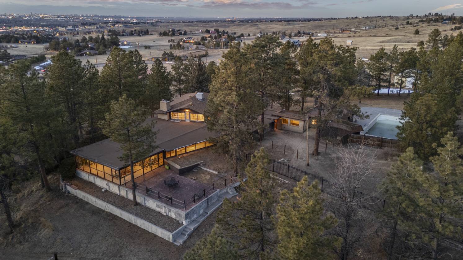 Whether you're seeking a private sanctuary, a multi-generational retreat, or a strategic investment property, Heritage Ranch offers it all—just minutes from downtown Parker This extraordinary 17-acre property provides income on day one, as the 3,300-square-foot commercial building—constructed in 2019—is already leased and operational. With jaw-dropping mountain views stretching from Pikes Peak to downtown Denver, this A-1 zoned property sits outside city limits in unincorporated Douglas County, with no HOA and no covenants—offering unmatched freedom and flexibility. Use the property as a private estate, rent the home and apartment, board or train horses, build a greenhouse or a church, start a hobby farm, or subdivide and develop—there are countless ways to capitalize on this land. Properties like this don’t come around often, and they’re not making more. This is the kind of property you’ll look back on and say, “I should have.” The main residence spans 5,562 square feet and includes a three-bedroom, three-bathroom home attached to a private two-bedroom, two-bathroom apartment with its own entrance—ideal for multi-generational living, hosting guests or rental use. Additional improvements include a 1,760-square-foot barn with six stalls, power, and water; a 30' x 48' Cleary-built shop with a 10-foot RV door; and a 16,000-square-foot riding arena. Infrastructure includes both a residential and a commercial well (with water rights), a newer septic system with three leach fields, and a fire cistern. The land is partially fenced and enhanced by mature pines, a natural draw, and abundant wildlife. There are endless ways to maximize value—or simply hold and enjoy the land and income. This property is just minutes from town, yet offers a world of opportunity.