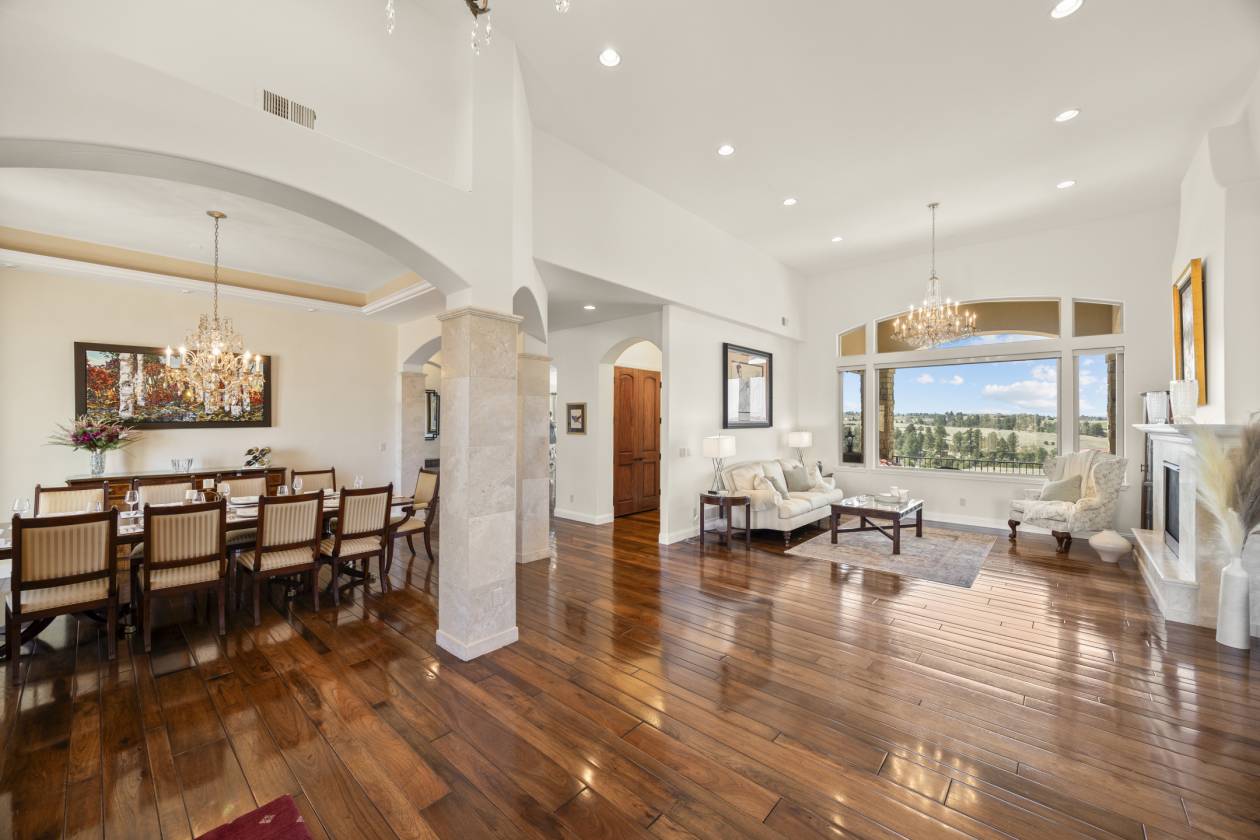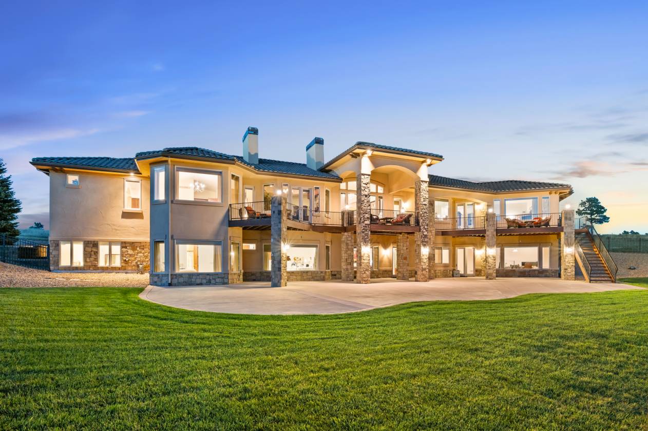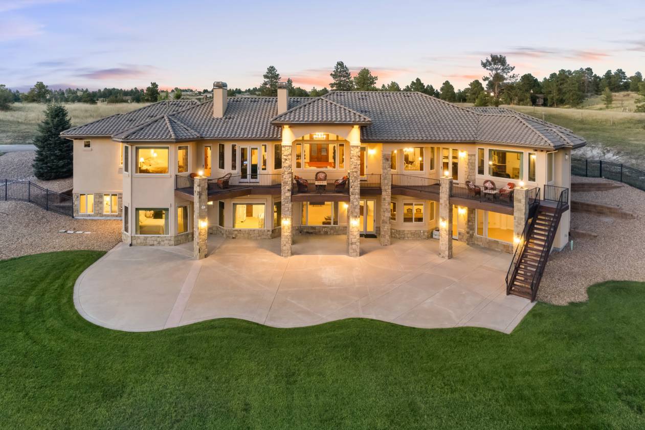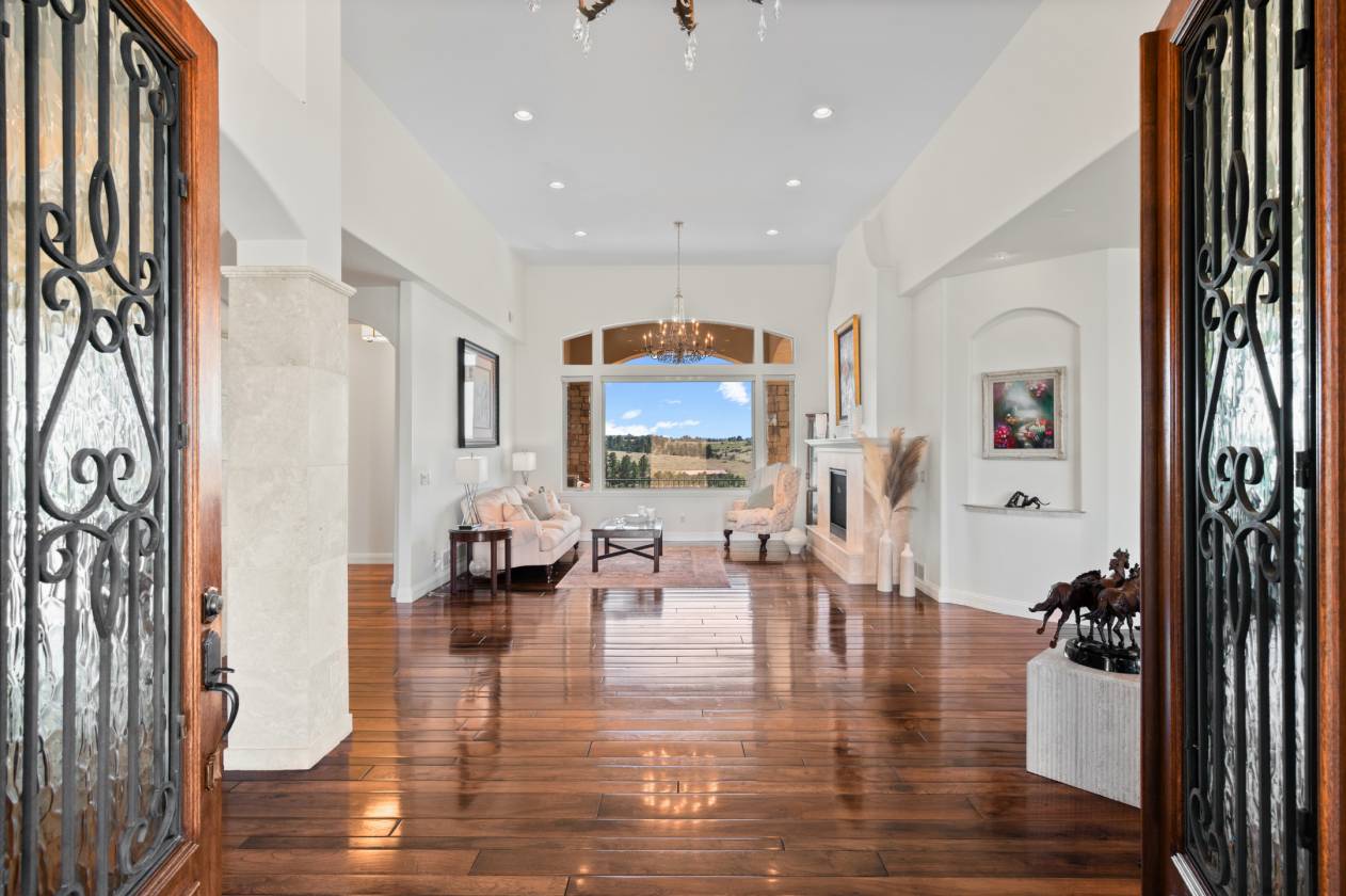 A masterpiece of luxury living in the exclusive enclave of Rancho Montecito. Set on 3.26 private acres, this Tuscan-inspired villa offers timeless elegance, serene privacy, and exquisite design in every detail. One of just 11 custom estates in this coveted, equestrian-friendly community, the property offers a rare combination of seclusion and sophistication—just minutes from downtown Parker. Inside, soaring ceilings, hand-troweled walls, and intricate architectural details define over 8,400 SF of refined living. A grand entrance sets the tone with custom solid mahogany arched French doors that lead into a foyer where Brazilian pecan hardwood floors flow throughout the main level—highlighted by Swarovski crystal chandeliers and anchored by one of many dramatic 95-inch picture windows framing Colorado’s iconic Pikes Peak. The main level also includes a handsome executive office, offering the perfect blend of privacy, natural light, and architectural refinement—ideal for remote work, creative pursuits, or quiet retreat. A chef’s kitchen worthy of any culinary enthusiast features custom Habersham cabinetry, Chantilly Quartzite countertops and backsplash, a Wolf 6-burner range, an integrated Sub-Zero refrigerator, and a walk-in pantry. Beyond a wrought-iron gate, a private vestibule sets the tone for the home’s most intimate wing—where architectural lighting and artful wall insets create a gallery-like transition to serenity. Thoughtfully paired with an adjacent ensuite bedroom ideal for a nursery or live-in care, the primary suite is a retreat unto itself. Vaulted ceilings, a travertine fireplace, and a sitting area invite rest, while a built-in coffee bar, beverage fridge, and spa-level bath complete the experience—all framed by a breathtaking 95-inch window overlooking Pikes Peak. The walk-out lower level offers three additional spacious bedrooms, each with private ensuites and walk-in closets, a full wet bar, recreation room, gym, additional office, and a private guest suite with its own living area and coffee bar—ideal for hosting or multi-generational living. A 3,000 SF patio opens to peaceful, open surroundings. Additional features include a heated driveway, an oversized 4-car garage, and a 1-acre fenced backyard. This isn’t just a home—it’s a legacy property for those who appreciate the finer things in life. Every space, finish, and view reflects exceptional craftsmanship and enduring beauty.