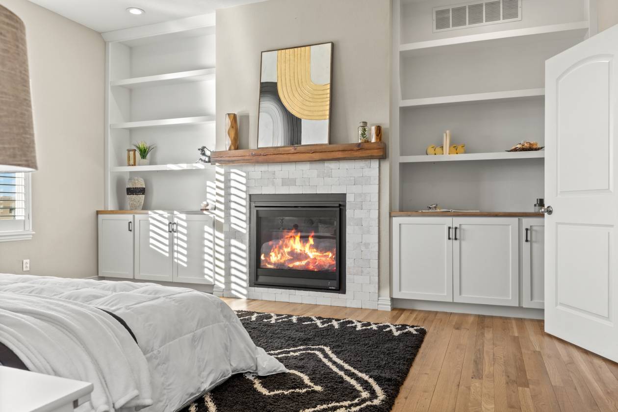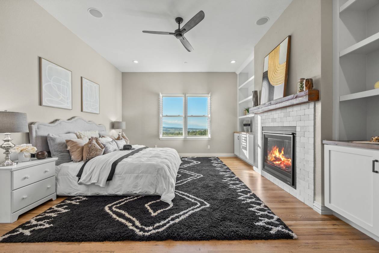 - Main-level primary suite with spa-like 5-piece bath and fireplace