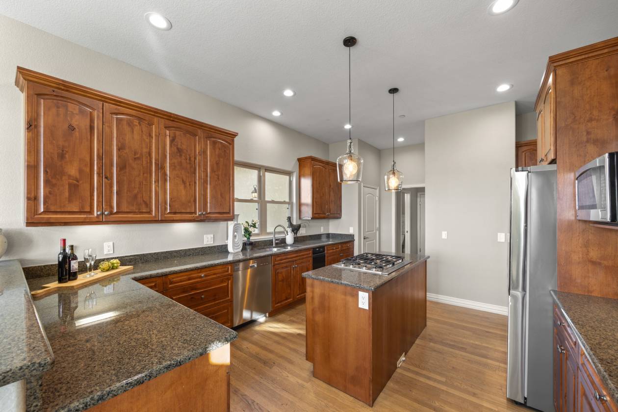 - Chef’s kitchen with granite countertops and gas range