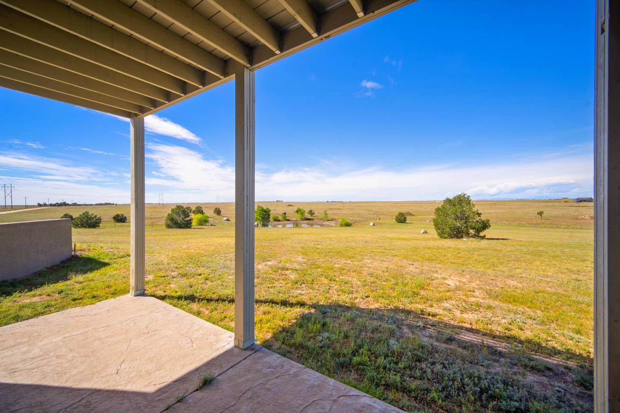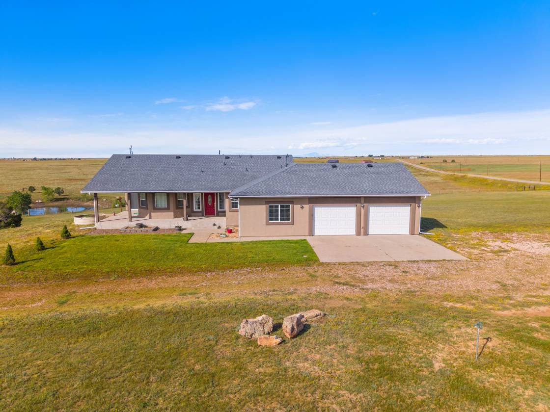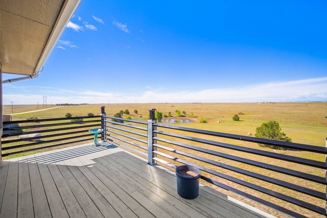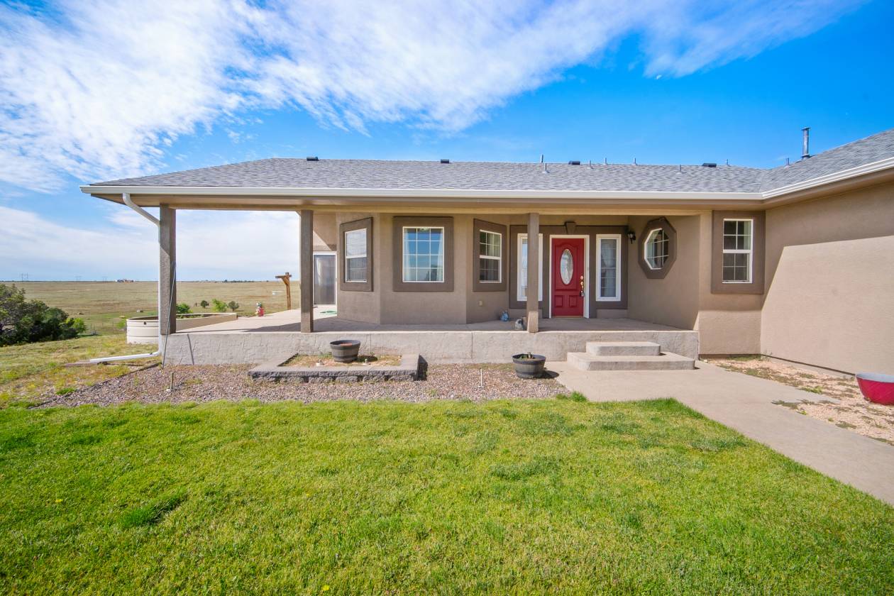 Relaxing country life in Calhan on more than 35 acres of groomed land with mineral rights. Easy access right off the highway on a paved road over 35 acres is fenced, and all livestock is welcome. The 60X40 barn/workshop has a brand-new roof and two stalls with Stall mats and a double, automatic waterer for animals. The home has been completely re-painted, w/ new gutters & downspouts, new insulated garage doors, new screens on windows, and a new roof on 60" X 40" barn and workshop that is insulated. This custom home has everything you could want main level living, move-in ready, 4 bedrooms, 3 bath, Dedicated office or could be used as another bedroom. 871sf 2-car oversized attached garage. Enjoy the amenities of this country estate including prepared pond, 50 X 100-, and 285-yard developed shooting range. The main level in the house has a great room with kitchen, dining, and living area with architectural 10'+ ceilings and ledges, master retreat with attached 5-piece bathroom, office, powder room, laundry, drop zone off of the garage, and al brand new multiple sliding doors walking out to the wrap around covered front porch and back deck with lower patio w/ amazing expansive views overlooking the property & Pikes Peak. Watch the sunrise to the east and the sunset to the west every day. The walkout basement features built-in architectural shelving, 9' ceilings, 2 more bedrooms, bathroom, huge recreation area, and sliding door walkout to the stamped concrete covered patio. All together there are 656sf of outdoor stamped concrete patios, porches, and decks, for peaceful enjoyment or entertainment. This stunning home has many custom features, built in whole house vacuum system, including a beautiful multi-level staircase with custom railings designed just for this home! New furnace in 2023. Domestic Well for your animals. This home does have cell signal, high speed internet, & digital TV services! This amazing country estate will not disappoint, come see this home today.