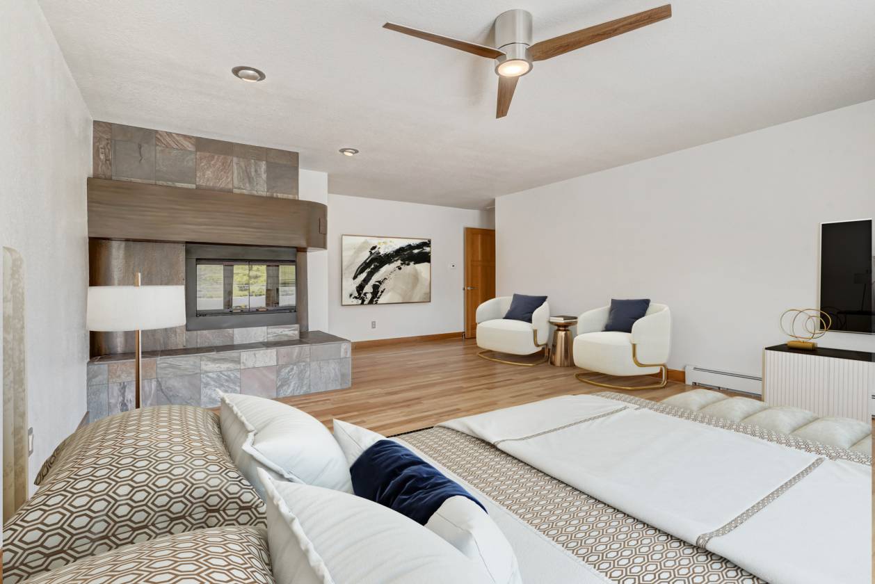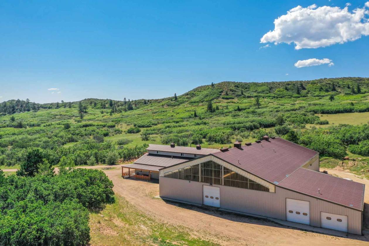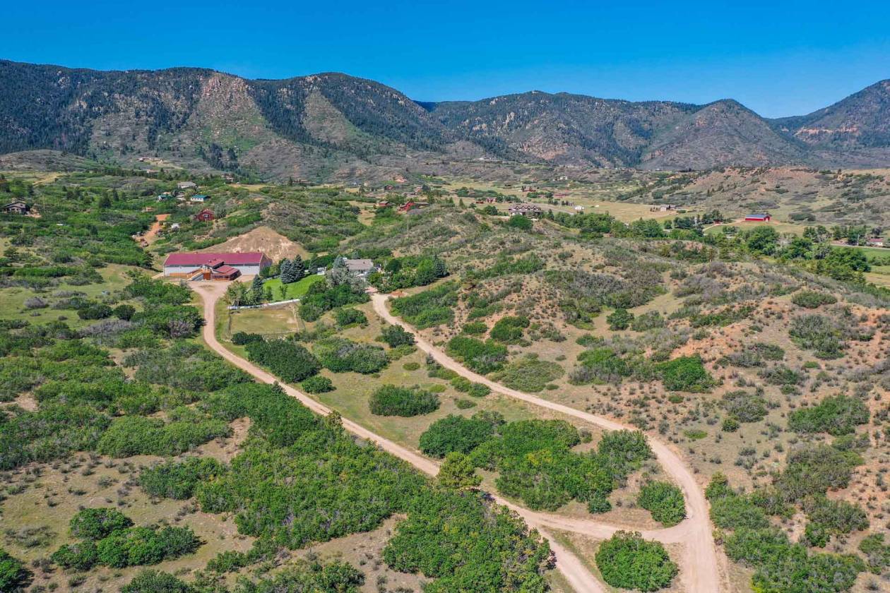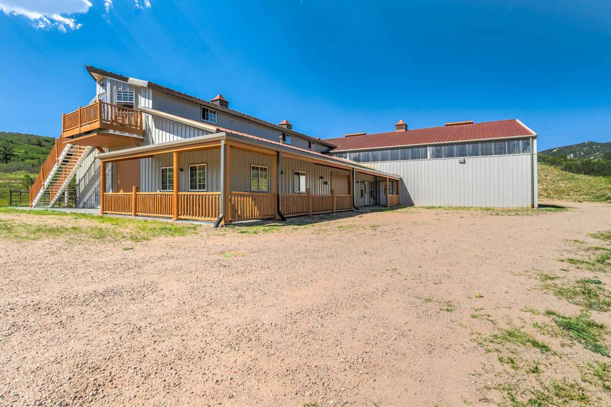 Luxury equestrian modern home on 13+ acres w/indoor riding arena, & barn w/studio. As you enter natural slate & solid hardwd flrs lead you to the great rm. Large bay window captures views of the valley. The light & bright great rm features a wd burning FP w/flr to ceiling slate & granite surround, built-ins & entertainment cabinet. The views & natural light continue in the chefs dream kitchen. Designer glass countertop island w/breakfast bar, craftsman-built cabinets, subway tile, commercial SS appliances, LED lighting, dumb waiter, pantry w/ pull out drawers & more! Walk out to the backyard oasis w/expansive multi-tier flagstone patio incl a covered/heated area w/built-in kitchen grill/smoker, 2 beverage taps, bar, & stream/waterfall features on either side. Lighted/fenced sports court perfect for pickle ball in the beautiful private setting. Back inside the formal dining rm features chandelier & wd flrs. The main lvl primary suite is loaded w/amenities; walk-out access, panoramic views, FP, sitting area, lux 5pc bath w/standalone jetted tub w/great mtn views, spa shower w/steam, radiant heat flr, separate glass vanities w/ floor to ceiling glass tile walls, custom luxury closet, & adj laundry rm w/cabinets & 2 sinks. 2nd main level bedrm has built in shelving & in-wall bed, offering a flexible guest rm w/nearby full bath. The walk-out bsmnt offers a large wd bar w/plenty of seating, space for pool table & sitting area w/wd burning stove. Lower-lvl office captures mtn views & has wall of built-in shelving & desk. 1 of the 2 bsmnt bedrms has sitting area while the other bedrm is setup as a workout rm. Both have easy access to hall bath w/steam shower. Quick walk to the heated/irrigated 140x80 riding arena, 60x40 shop w/concrete floor, 5 stall barn w/tongue & groove walls/ceiling, multiple large entries/exits, tack rm, handicap accessible bath, spacious 1bd 1ba barndominium w/full kitchen above, & more. Must see CO luxury ranch w/great access.