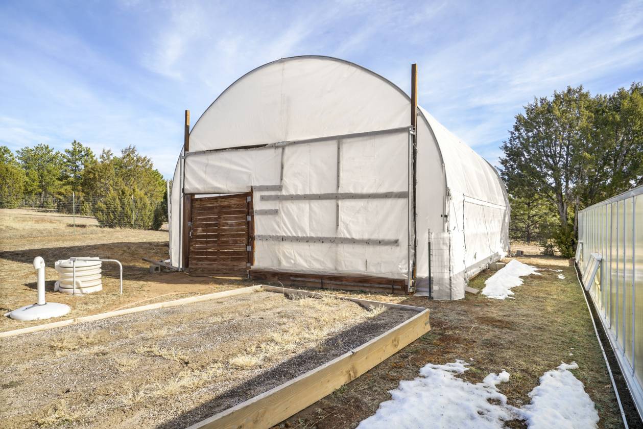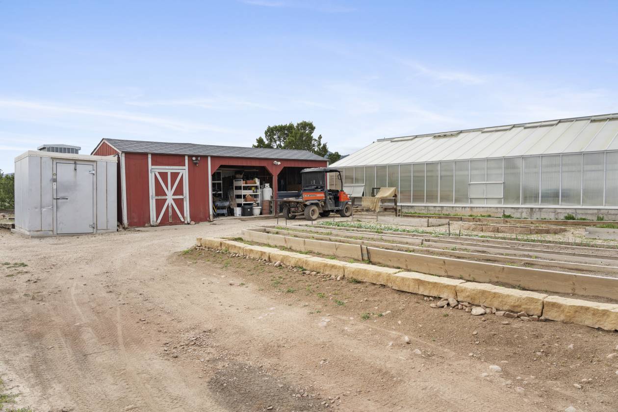 - Outdoor amenities are a hallmark of this property, designed to support a range of agricultural and recreational activities. The property includes three predator-deterrent fenced chicken coops, four storage sheds, one loafing shed, two large greenhouses (a 1,325-square-foot greenhouse and an 850-square-foot Hoop House), and a walk-in freezer for produce. A standout feature is the 50x40-foot metal outbuilding/equipment garage, which has two bays and 20-foot garage doors with automatic door openers, capable of accommodating a tractor and multiple truck-sized vehicles. Security and privacy are paramount, with two automatic metal and weight-controlled access gates ensuring controlled entry.