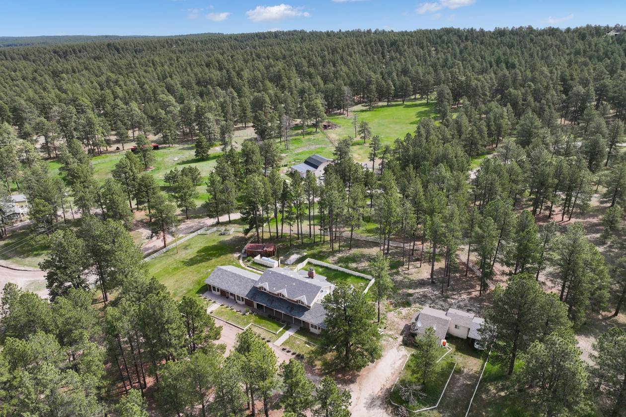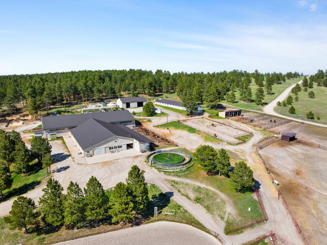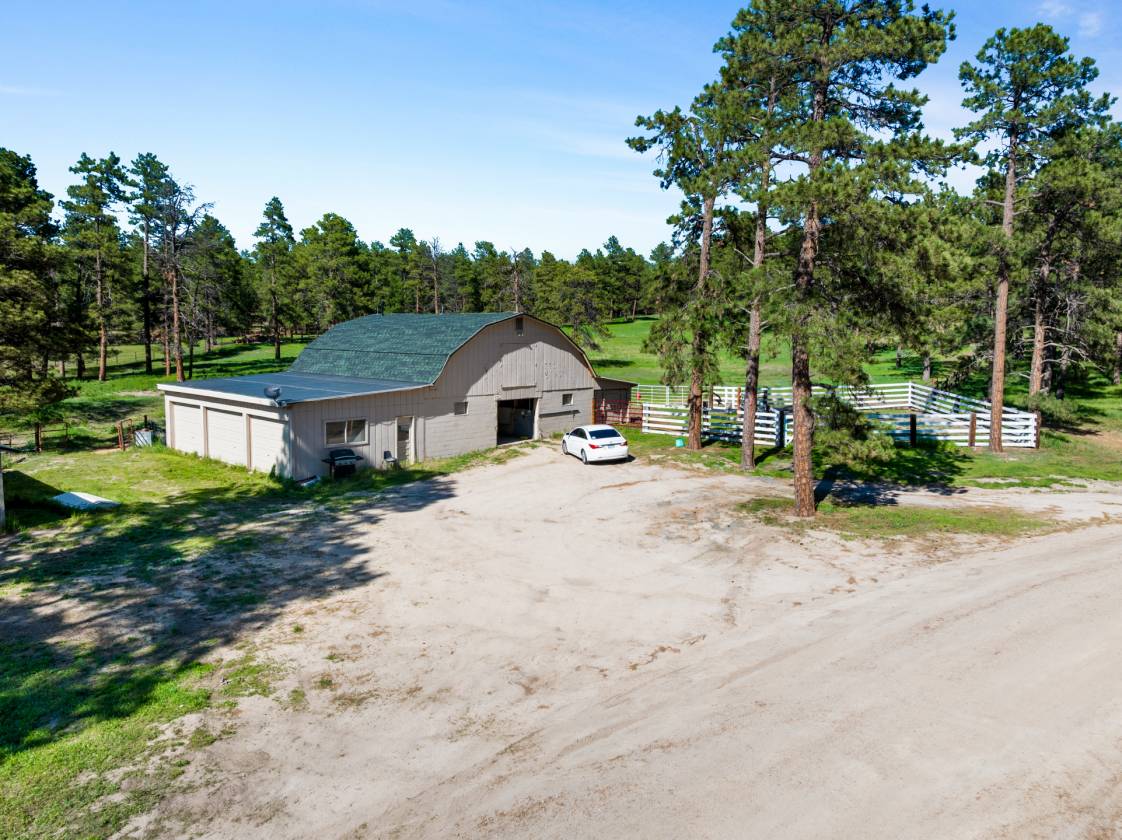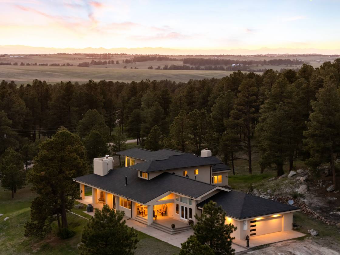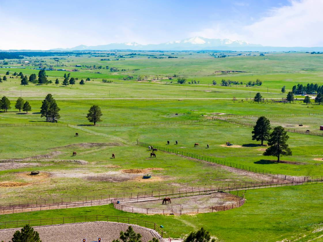 Most people go their whole lives searching for that ‘one thing.’ Out here, you just step outside and find it—157 acres of open sky, rolling pasture, and the mountain majesty of Pikes Peak. Welcome to Discovery Farm, where life balances between peaceful retreat and fully functioning ranch. Two commanding barns anchor the equestrian facilities, while guest houses, caretaker quarters, and utility buildings expand the possibilities for multigenerational living or retreat-style use, all tucked securely behind a gated entry. The main residence captures the essence of Colorado living, with mountain views that never grow old and comfort that becomes a way of life. Inside, the home blends mid-century character with modern refinement. Vaulted ceilings and walls of glass bring scale and light, while details like the open-riser staircase, stone fireplace, and wide-plank wood floors ground the space in warmth. The kitchen is a true centerpiece, with a massive marble waterfall island and peninsula with breakfast bar seating, Wolf and Sub-Zero appliances, a bright windowed dining nook, and a separate scullery with commercial-grade refrigeration. The main-floor primary suite enjoys its own fireplace, a private patio, and spa-like bath with refined finishes. Upstairs, two ensuite bedrooms and a loft with built-in beds provide exceptional guest accommodations, while a main-floor den offers flexibility for work or quiet retreat. Purpose-built equestrian amenities elevate the property to professional standards, with two commercial barns offering 20+ stalls, tack rooms, and wash bays, alongside an 11,000-square-foot indoor arena, utility building, and multiple sheds. An outdoor arena, trails, and fenced pastures stretch across the landscape, supported by conveyed water rights that sustain pasture and livestock. Located just five minutes from Elizabeth, 25 minutes from Castle Rock, and under an hour from DIA or Colorado Springs Airport, Discovery Farm delivers rare seclusion with ease of access. Paved roads bring you to the gate—beyond it, every sunrise and sunset is yours to claim.