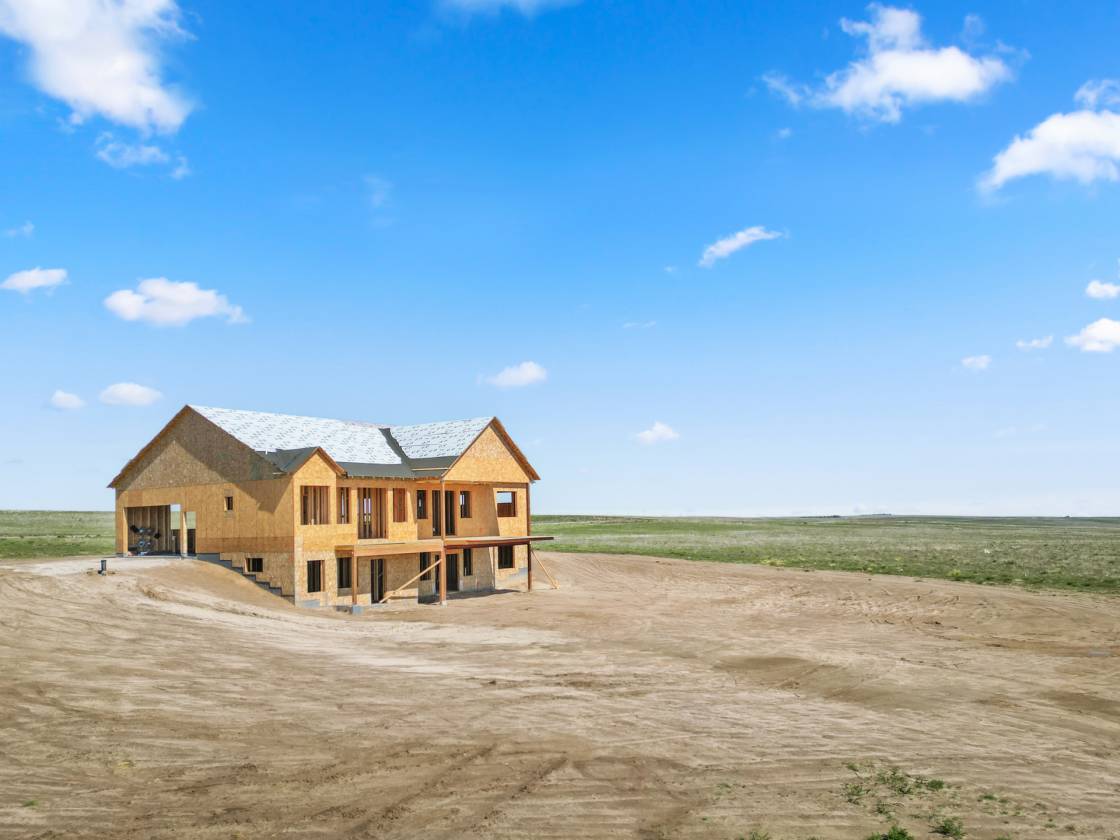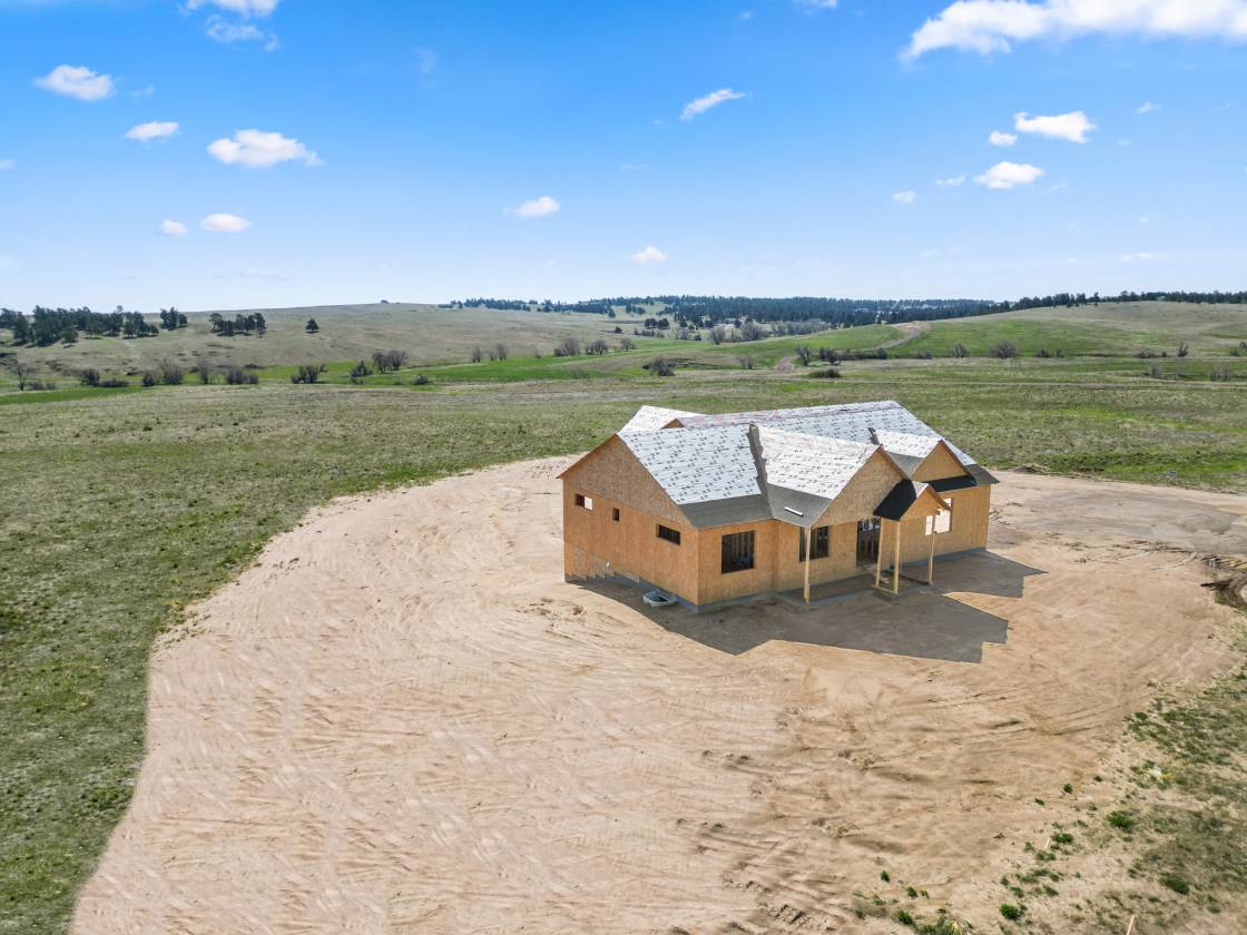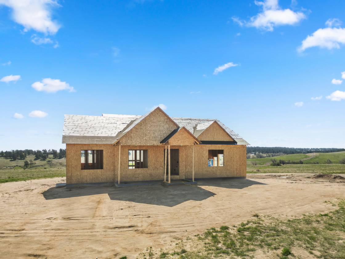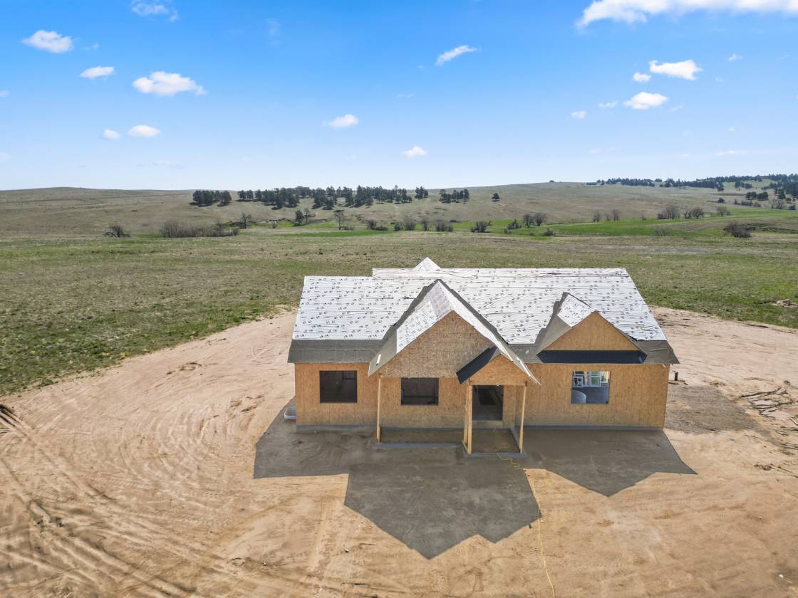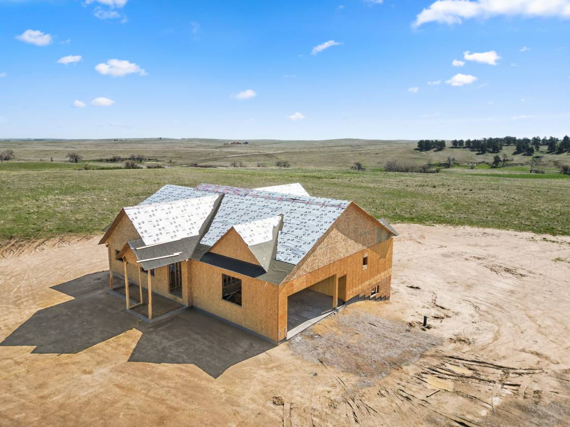 Own a brand-new custom walk-out ranch on 35 wide-open acres in the sought-after Serenity at Wolf Creek Ranch community. Built by local craftsman Colorado By Design, this modern farmhouse blends quality construction with sweeping prairie views. With no HOA, and A1 zoning, the property is a canvas for barns, horses, livestock, or your dream rural retreat—just five minutes from Kiowa and within easy reach of the Denver Metro area. The open floor plan is anchored by vaulted ceilings, oversized windows, and wide-open living spaces designed to maximize natural light, views, and comfort. The spacious living room—framed by built-ins and a fireplace—connects seamlessly to the gourmet kitchen and covered deck, creating an ideal setting for entertaining or simply watching the sunrise as wildlife roams the pasture. The primary suite is a true retreat, featuring a spa-like five-piece bath, an oversized walk-in closet, and private access to the covered deck—where tranquil views stretch for miles. A secondary bedroom with its own ensuite, a dedicated office, laundry room, and cozy sitting area with 9’ ceilings complete the main-level layout. Downstairs, the finished walk-out basement offers 9’ ceilings, two additional bedrooms, a full bath, a spacious rec room, a bonus room (perfect for a gym or theater), and a fully appointed kitchenette—ideal for guests or future in-law quarters. Guest houses and garage apartments are permitted with county approval, and RVs or temporary housing are allowed during construction. Construction is actively underway with completion anticipated by September 2025. This is your chance to secure a one-of-a-kind home on a legacy lot—where modern comfort meets Colorado countryside, and every sunrise feels like it’s yours alone. Please note: Renderings are for illustrative purposes only and do not represent the final finishes, or colors. Blueprints are for reference and may not reflect all changes. Contact the listing agent for more details