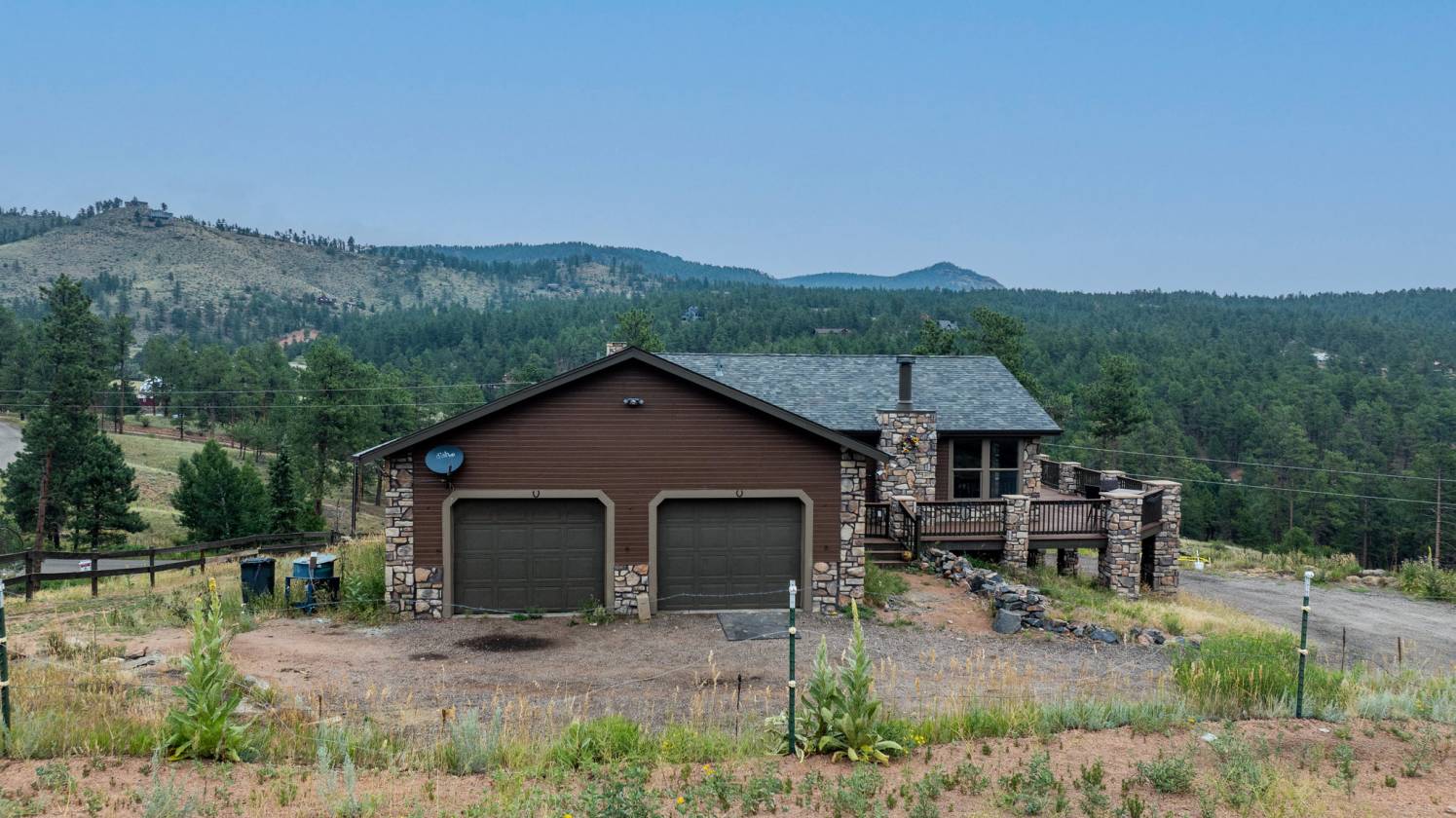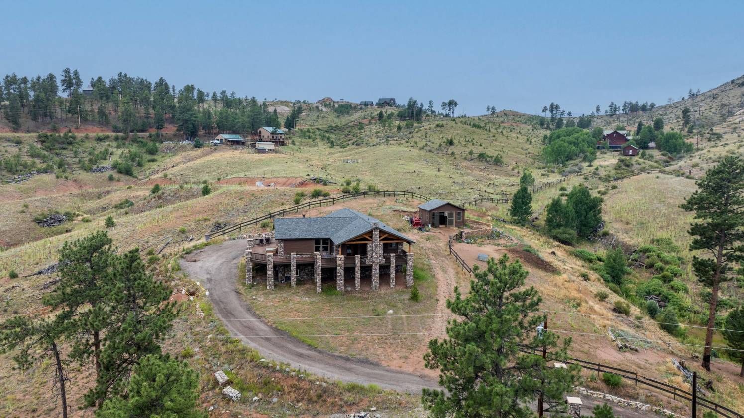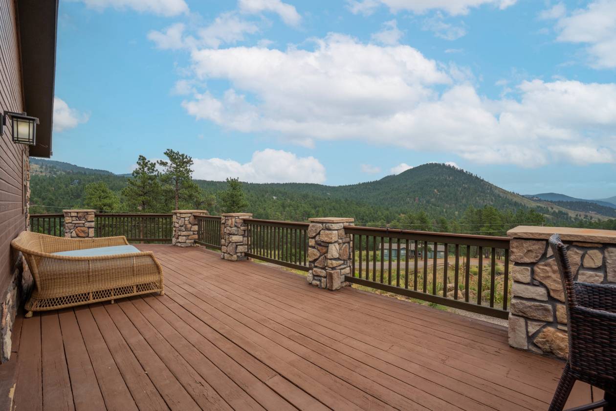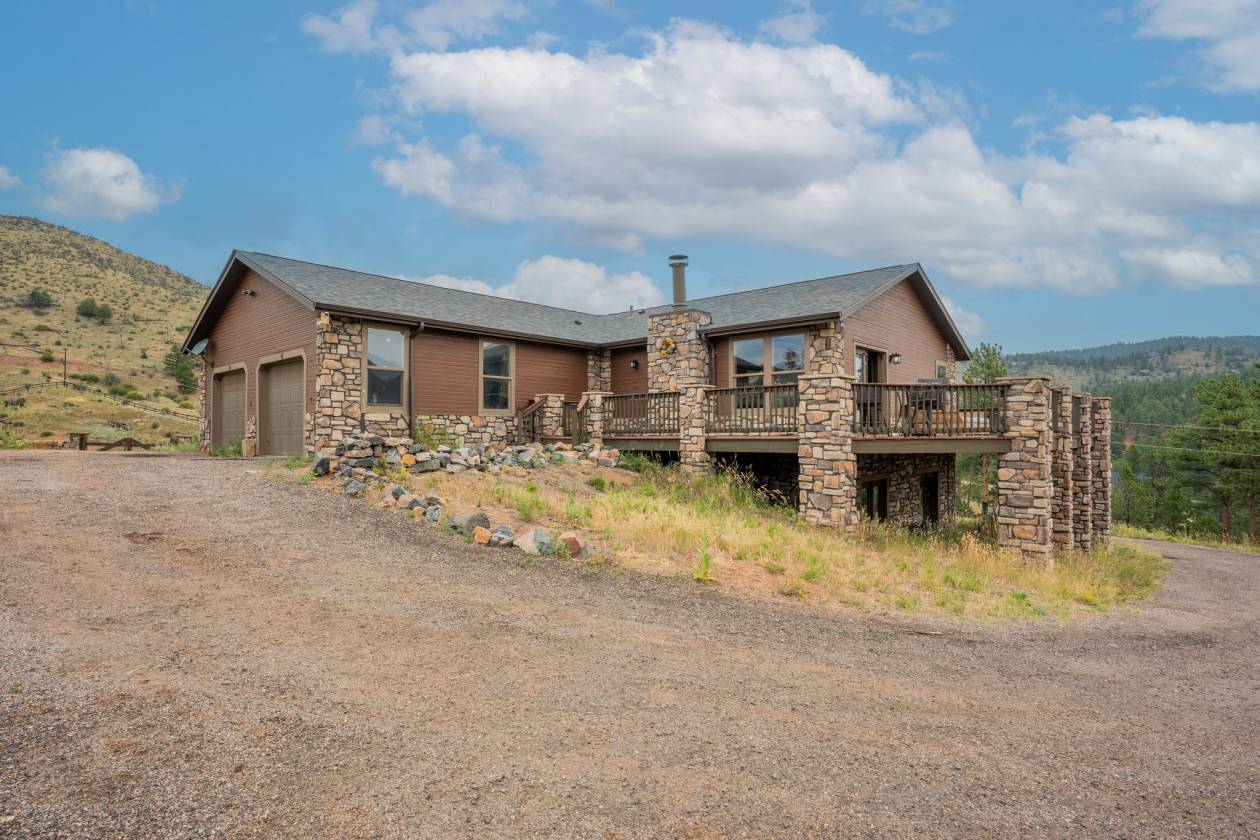 Imagine pulling in through the front entry gate, greeted by breathtaking mountain views that stretch endlessly in every direction. No need to imaging anymore – situated in a million dollar neighborhood and on almost 6 acres, this wonderful home features an open floor plan, old barn wood floors, unique fireplace, coffered ceilings & huge wrap-around deck featuring an outdoor stone fireplace. The open kitchen features a newer oven & microwave, canned lighting and an island w/higher seating & pendant lighting. The spacious main floor primary BR has coffered ceilings, built-ins shelves, walk-in CL, en-suite bath & double glass doors leading to the deck, perfect for relaxing after a long day. There are 2 additional BRs on the main level & a remodeled hallway bathroom. Main floor laundry features a utility sink, cabinets & shelves. Additional highlights include a tankless water heater, radon mitigation system, water filtration system, humidifier, structural floor with steel joists and a new roof (2024). The walk-out basement provides high ceilings, solid wood doors, a walk-out entry, non-conforming BR & plenty of potential for expansion. The oversized garage offers ample storage, cabinets & counters for workshop projects. Plenty of room for guest parking, RV parking and/or horse trailer. This fabulous horse property is fully fenced with cross fencing for separate pastures, a 2-stall barn and a professionally engineered & permitted retaining wall. Pine is well-known for 'Banana belt' weather conditions and outdoor activities including hiking, horseback riding, mountain biking, fishing, kayaking, camping, rock climbing & 4-wheeling. Close access to US Hwy 285, Pine Valley Ranch Park & Open Space, Buffalo Creek, Wellington Lake, Lost Creek Wilderness, Staunton State Park & Gold Medal Fishing at the south Platte. This unique property combines rustic charm with Colorado beauty — a perfect retreat for nature lovers and those seeking a peaceful mountain lifestyle.