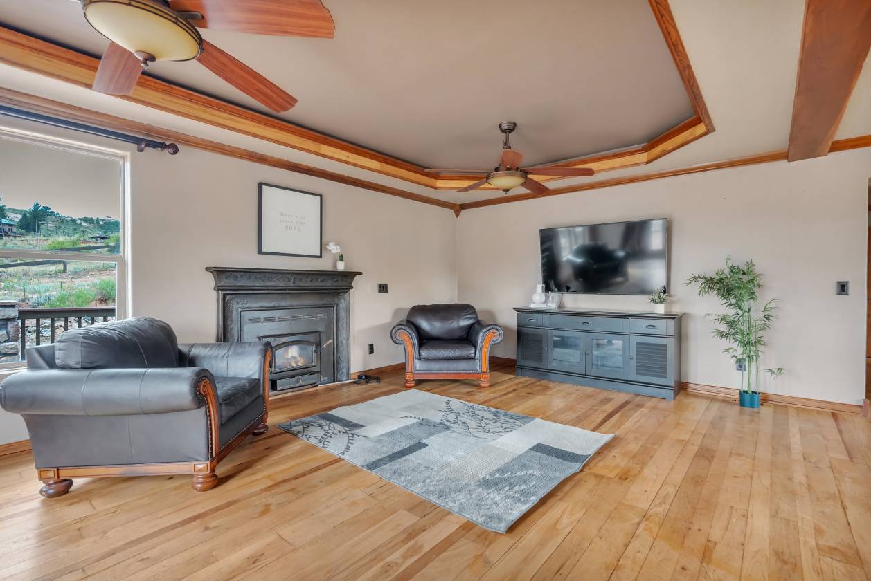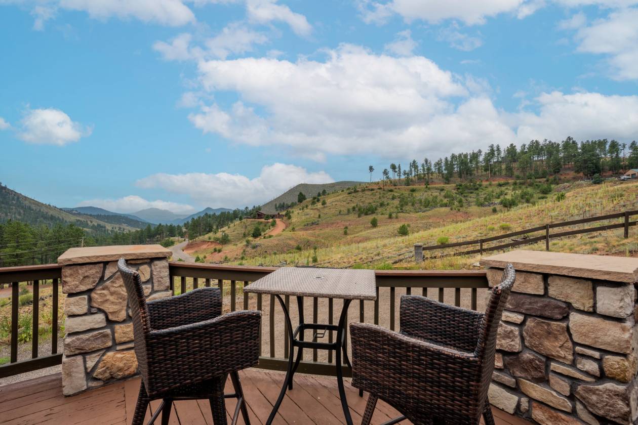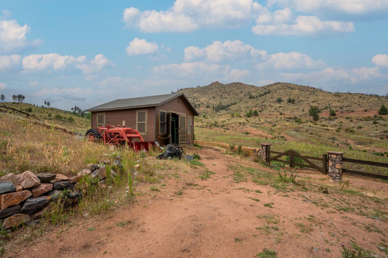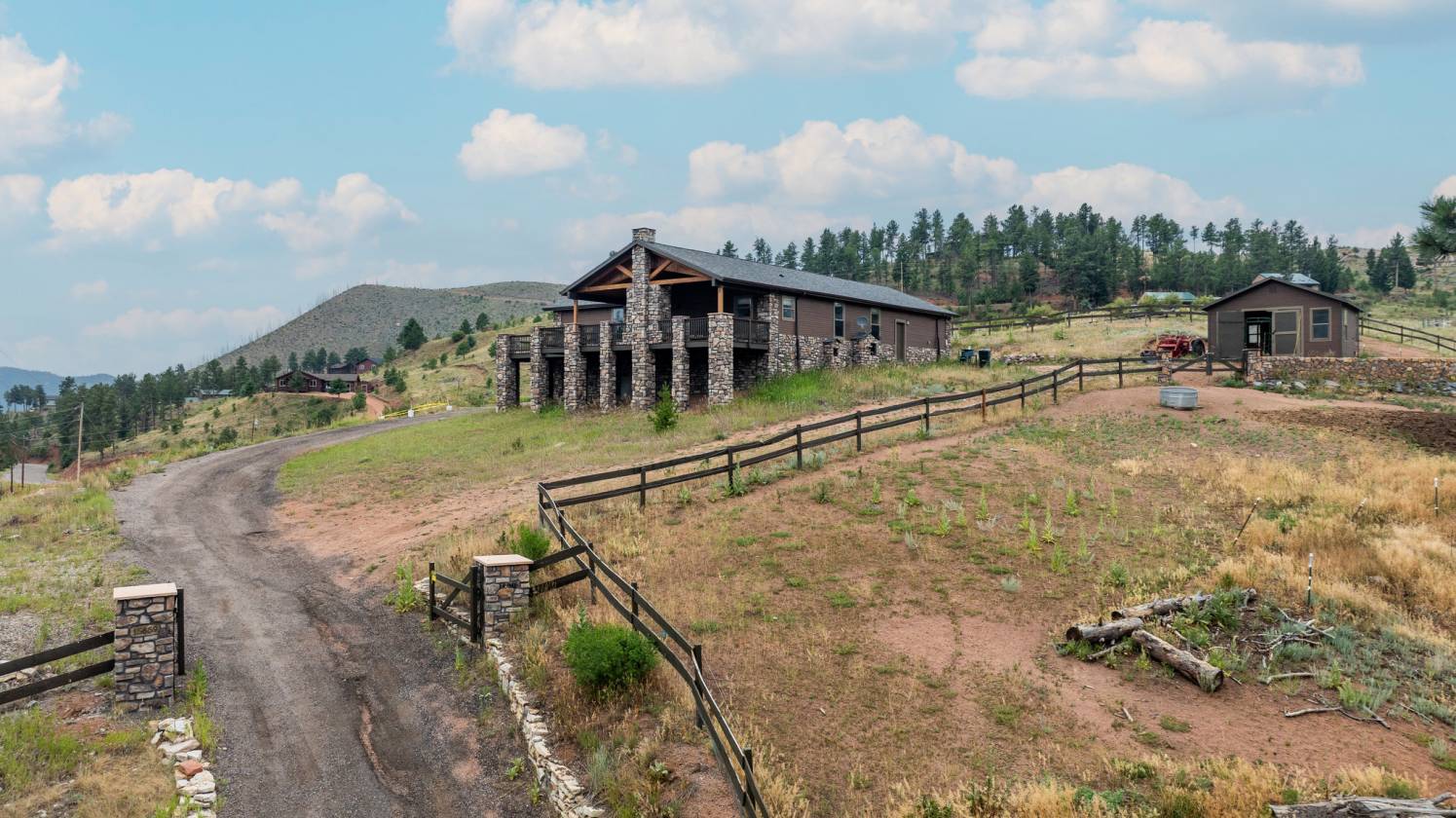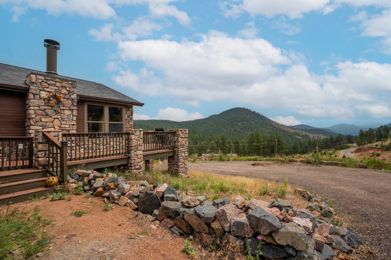 Imagine pulling in through the front entry gate, greeted by breathtaking mountain views that stretch endlessly in every direction. No need to imaging anymore – situated in a million dollar neighborhood and on almost 6 acres, this wonderful home features an open floor plan, old barn wood floors, unique fireplace, coffered ceilings & huge wrap-around deck featuring an outdoor stone fireplace. The open kitchen features a newer oven & microwave, canned lighting and an island w/higher seating & pendant lighting. The spacious main floor primary BR has coffered ceilings, built-ins shelves, walk-in CL, en-suite bath & double glass doors leading to the deck, perfect for relaxing after a long day. There are 2 additional BRs on the main level & a remodeled hallway bathroom. Main floor laundry features a utility sink, cabinets & shelves. Additional highlights include a tankless water heater, radon mitigation system, water filtration system, humidifier, structural floor with steel joists and a new roof (2024). The walk-out basement provides high ceilings, solid wood doors, a walk-out entry, non-conforming BR & plenty of potential for expansion. The oversized garage offers ample storage, cabinets & counters for workshop projects. Plenty of room for guest parking, RV parking and/or horse trailer. This fabulous horse property is fully fenced with cross fencing for separate pastures, a 2-stall barn and a professionally engineered & permitted retaining wall. Pine is well-known for 'Banana belt' weather conditions and outdoor activities including hiking, horseback riding, mountain biking, fishing, kayaking, camping, rock climbing & 4-wheeling. Close access to US Hwy 285, Pine Valley Ranch Park & Open Space, Buffalo Creek, Wellington Lake, Lost Creek Wilderness, Staunton State Park & Gold Medal Fishing at the south Platte. This unique property combines rustic charm with Colorado beauty — a perfect retreat for nature lovers and those seeking a peaceful mountain lifestyle.