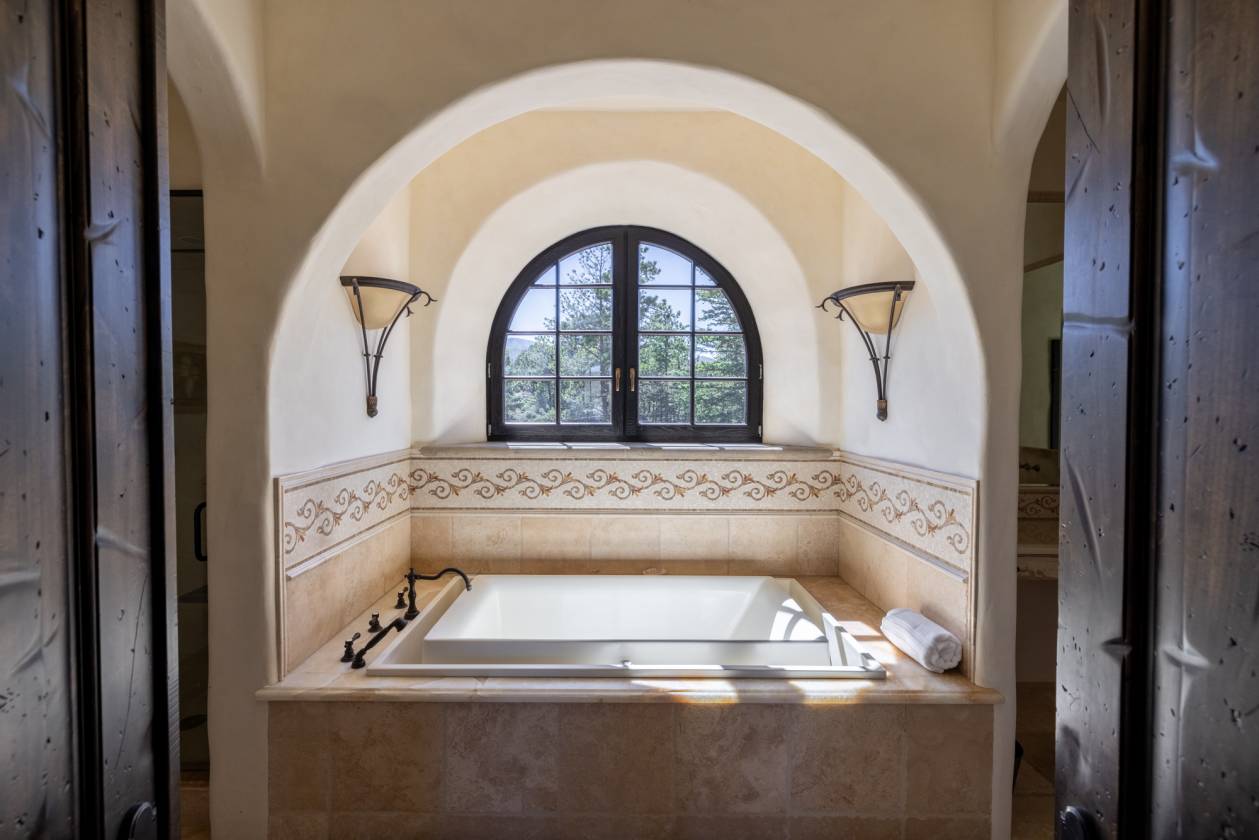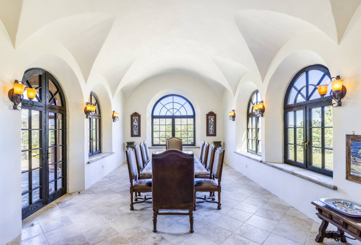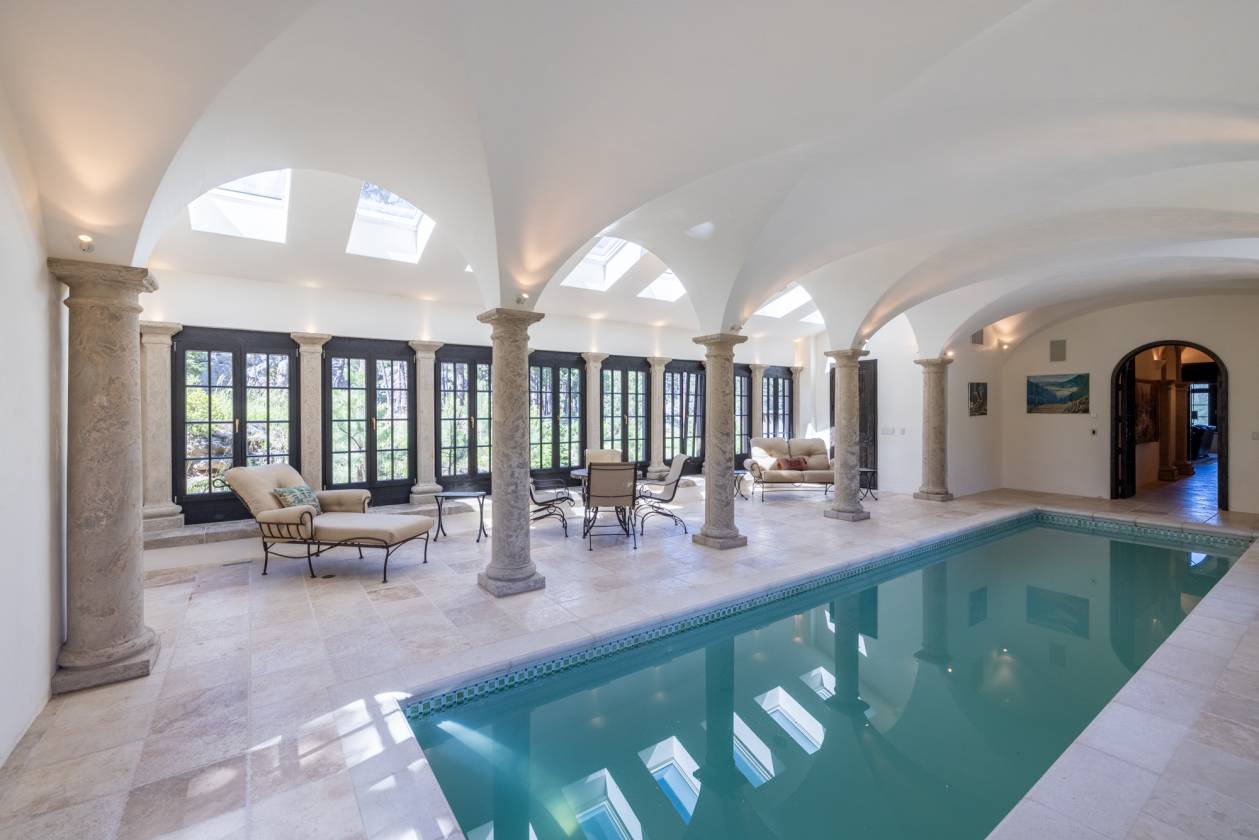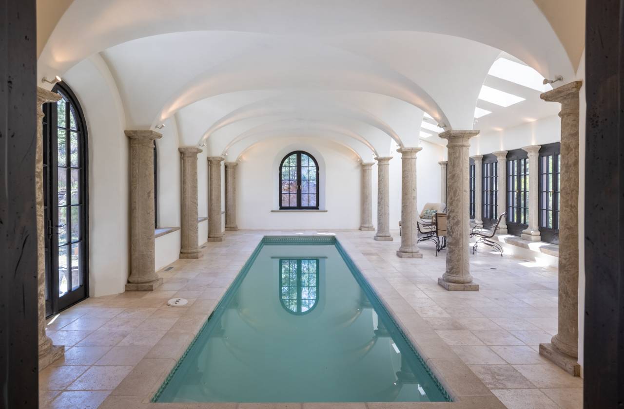 - It is luxury at its finest, blending art and function with two elevators, 14-foot-tall arched ceilings, and German wood-framed windows that swing open and tilt with dual hinges. A 32-foot-long indoor saltwater pool and lounge area offer spaces to relax and recharge, while the private office and library with a wet bar inspire creativity and productivity. A formal dining room invites guests to stay awhile, with a separate serving entrance from the kitchen through the bottle room. Off of the main gourmet kitchen is an auxiliary kitchen that leads to separate living quarters. Multiple entertaining and living spaces have radiant in-floor heating for optimal comfort.