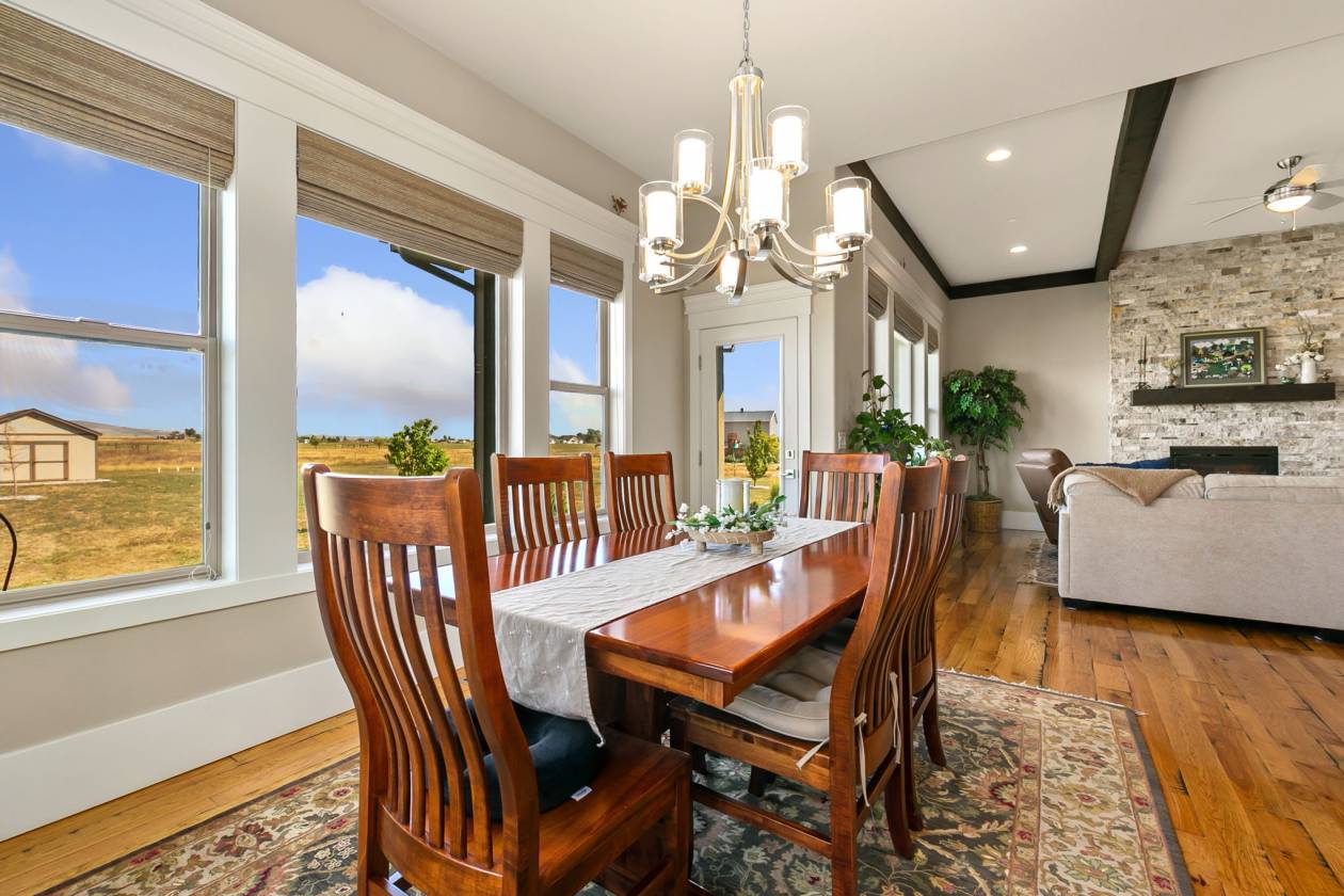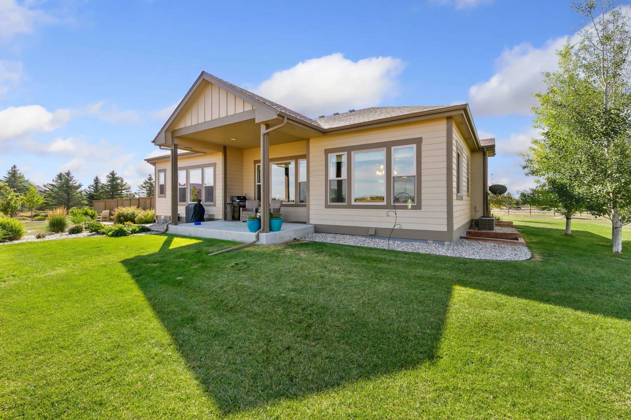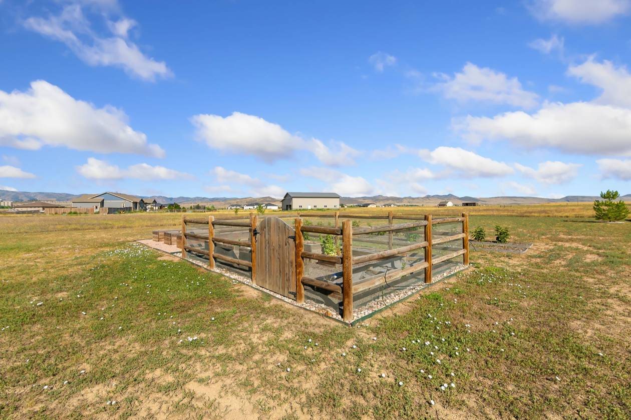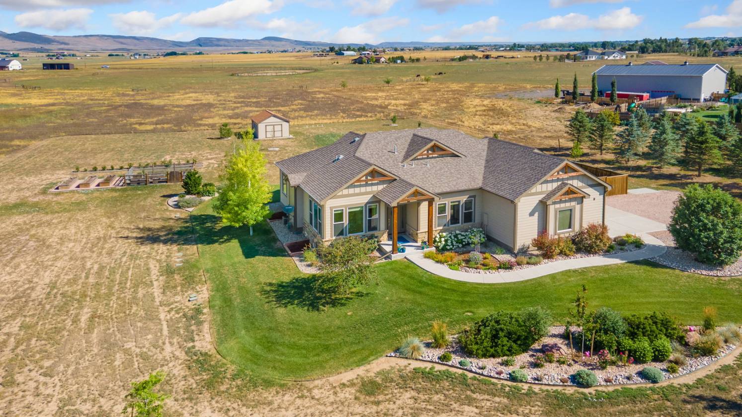This stunning custom ranch combines tranquility, luxury, and convenience—just 10 minutes from Old Town. Nestled on 5 acres in Scenic Ranch Estates, a private 200-acre equestrian community, residents enjoy horse riding trails, a shared arena, and the freedom to add outbuildings or farm animals with an HOA-approved pasture plan. Inside, an inviting open floor plan showcases rich hickory floors with a striking ebonized finish and custom millwork windows that flood the home with natural light while capturing breathtaking mountain views. The gourmet kitchen is a true centerpiece, featuring granite countertops, a large island, 5-burner gas cooktop, double ovens, a professional-grade side-by-side refrigerator and freezer, and a spacious walk-in pantry. The adjoining great room impresses with a beamed ceiling and an eye-catching stone gas fireplace, while the generous dining area flows seamlessly to the backyard, enhancing the indoor-outdoor connection. The expansive primary suite offers a spa-like bath with a floating double vanity, soaking tub, dual-head shower, and private water closet. For added convenience, the large walk-in closet connects directly to the laundry room. Two additional bedrooms, a full bath, and a powder room for guests complete the main level. Outside, the backyard features a covered patio, raised garden beds with full irrigation, and a garden shed. For dog lovers there is an electronic dog fence and RFID controlled door from the laundry room to the spacious fenced dog run. The oversized 3-car garage with epoxy floors offers excellent storage, while the full unfinished basement - complete with four egress windows and a plumbing rough-in - provides endless options for expansion. Property has been Pre-Inspected and includes a one-year First American Home Warranty for added peace of mind.