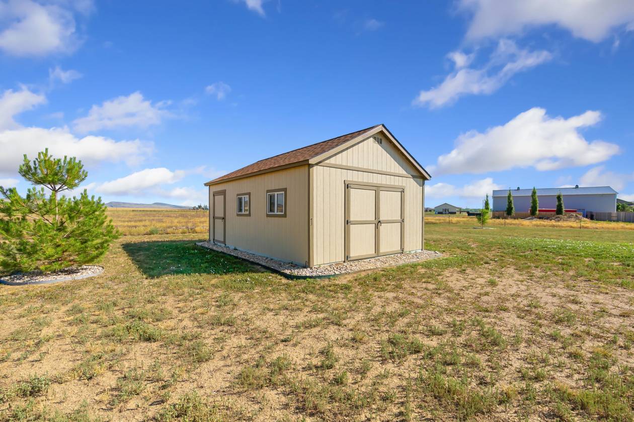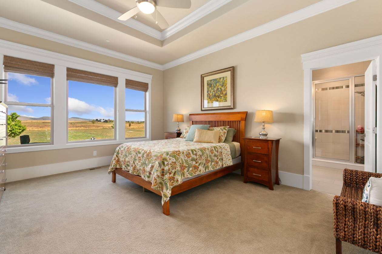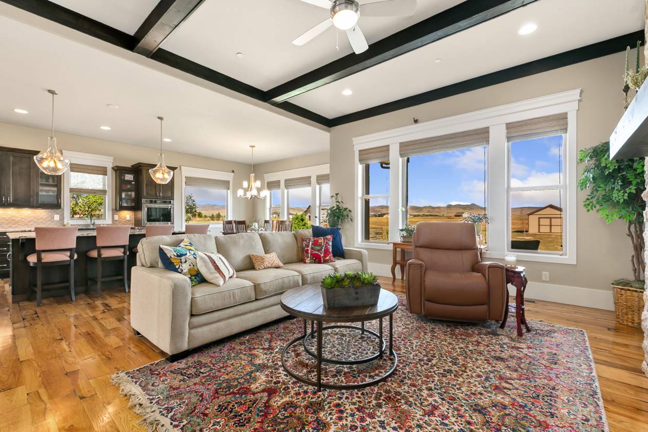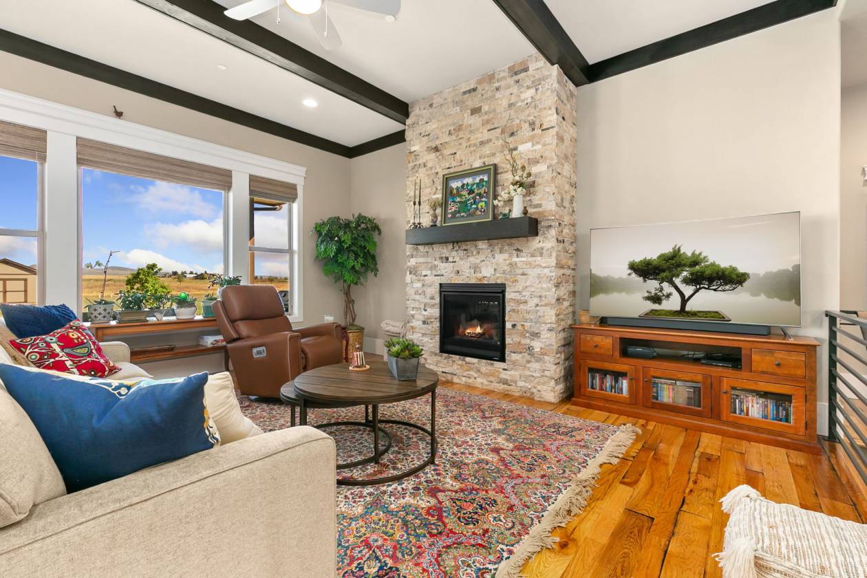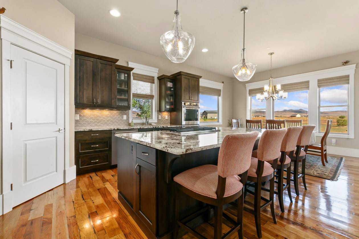 This stunning custom ranch combines tranquility, luxury, and convenience—just 10 minutes from Old Town. Nestled on 5 acres in Scenic Ranch Estates, a private 200-acre equestrian community, residents enjoy horse riding trails, a shared arena, and the freedom to add outbuildings or farm animals with an HOA-approved pasture plan. Inside, an inviting open floor plan showcases rich hickory floors with a striking ebonized finish and custom millwork windows that flood the home with natural light while capturing breathtaking mountain views. The gourmet kitchen is a true centerpiece, featuring granite countertops, a large island, 5-burner gas cooktop, double ovens, a professional-grade side-by-side refrigerator and freezer, and a spacious walk-in pantry. The adjoining great room impresses with a beamed ceiling and an eye-catching stone gas fireplace, while the generous dining area flows seamlessly to the backyard, enhancing the indoor-outdoor connection. The expansive primary suite offers a spa-like bath with a floating double vanity, soaking tub, dual-head shower, and private water closet. For added convenience, the large walk-in closet connects directly to the laundry room. Two additional bedrooms, a full bath, and a powder room for guests complete the main level. Outside, the backyard features a covered patio, raised garden beds with full irrigation, and a garden shed. For dog lovers there is an electronic dog fence and RFID controlled door from the laundry room to the spacious fenced dog run. The oversized 3-car garage with epoxy floors offers excellent storage, while the full unfinished basement - complete with four egress windows and a plumbing rough-in - provides endless options for expansion. Property has been Pre-Inspected and includes a one-year First American Home Warranty for added peace of mind.