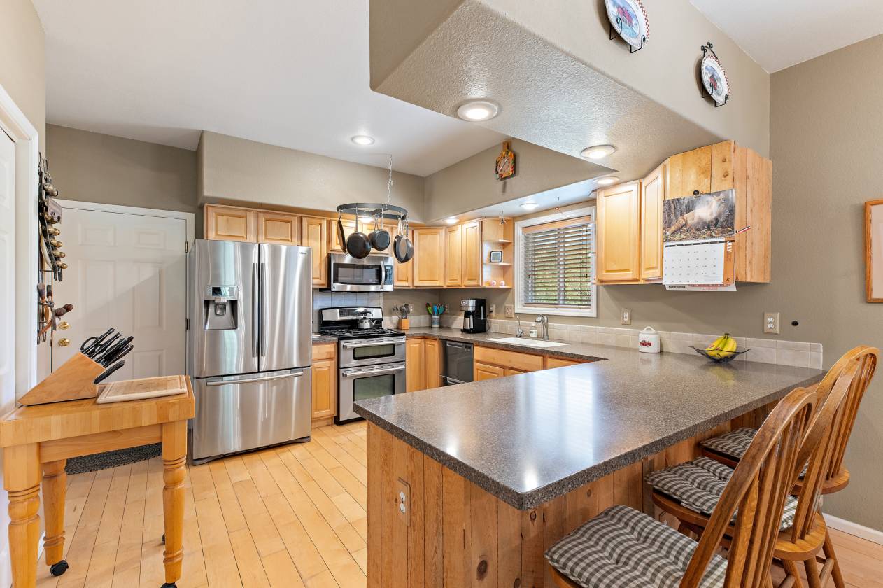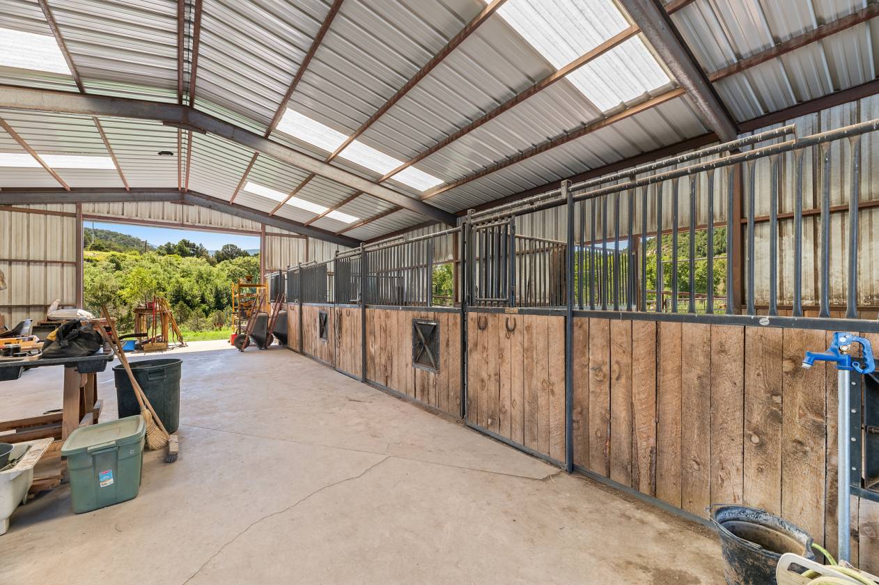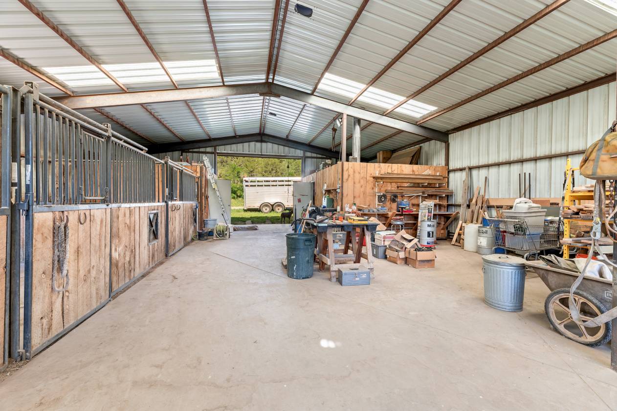 A spacious welded steel barn highlights the equestrian improvements, offering four finished horse stalls with outdoor runs, a heated workshop, a tack room, and a round pen. With wide drive-through doors, water access, power, and heat, the setup is ideal for horses, cattle, or small-scale ranching operations. Additional outbuildings include a greenhouse and a chicken coop, creating opportunities for homesteading or hobby farming.