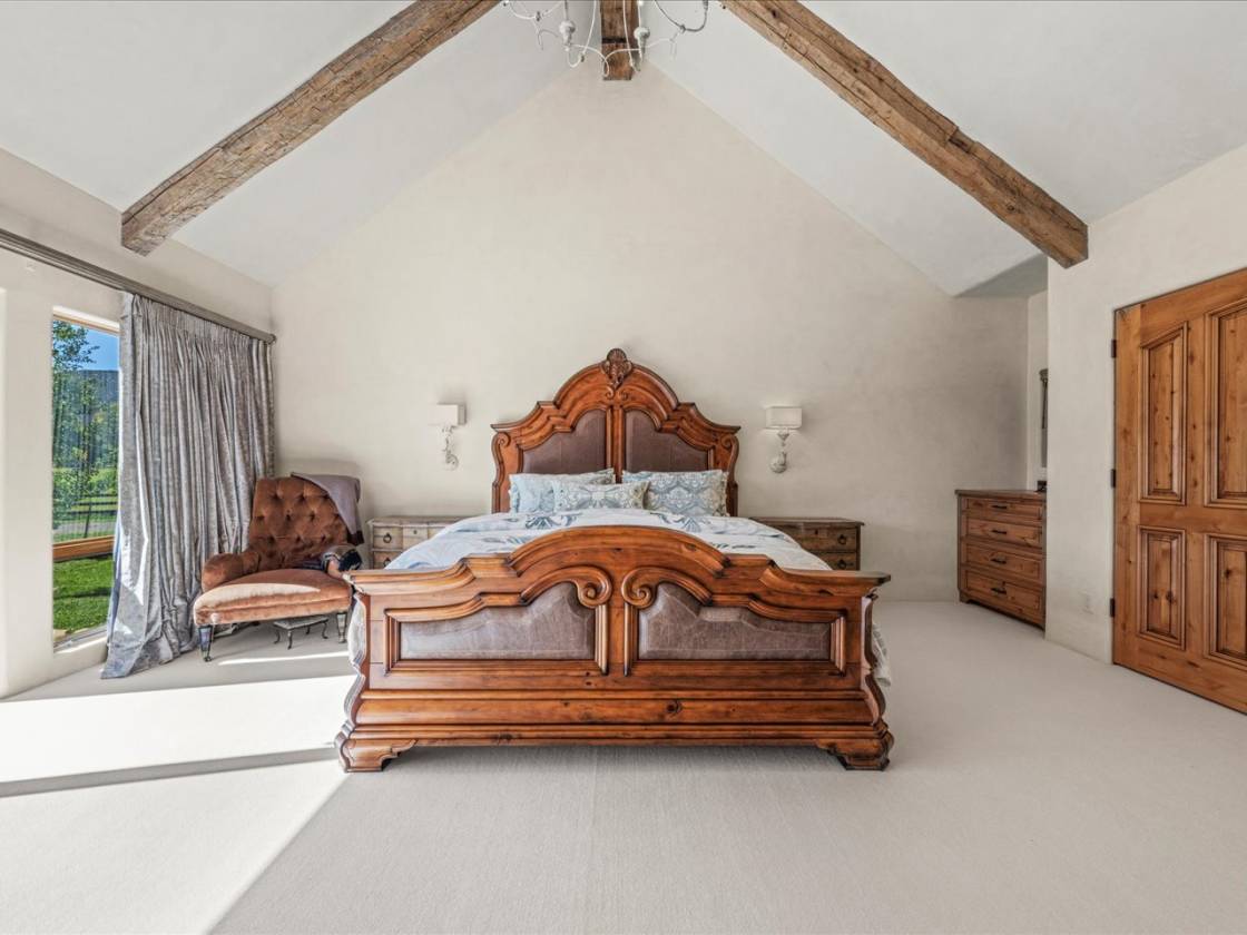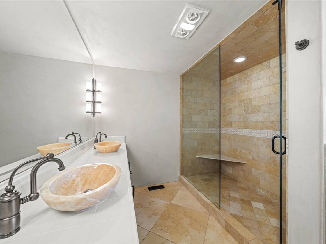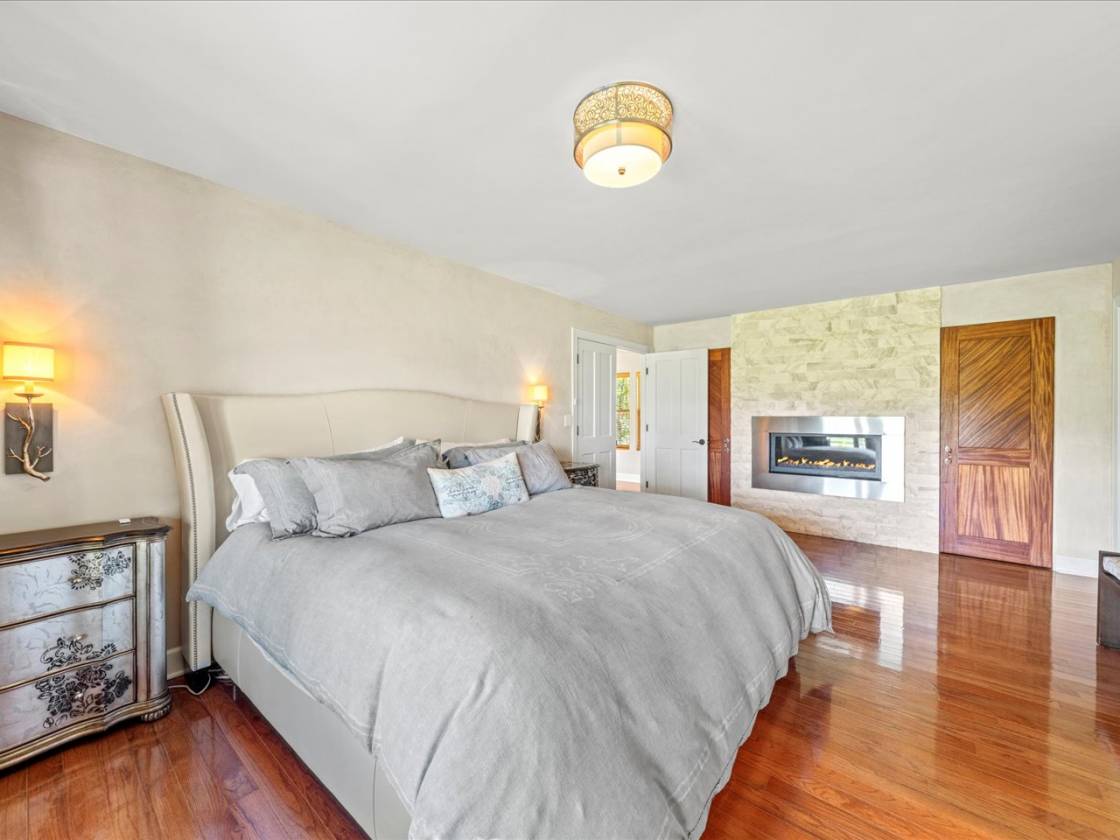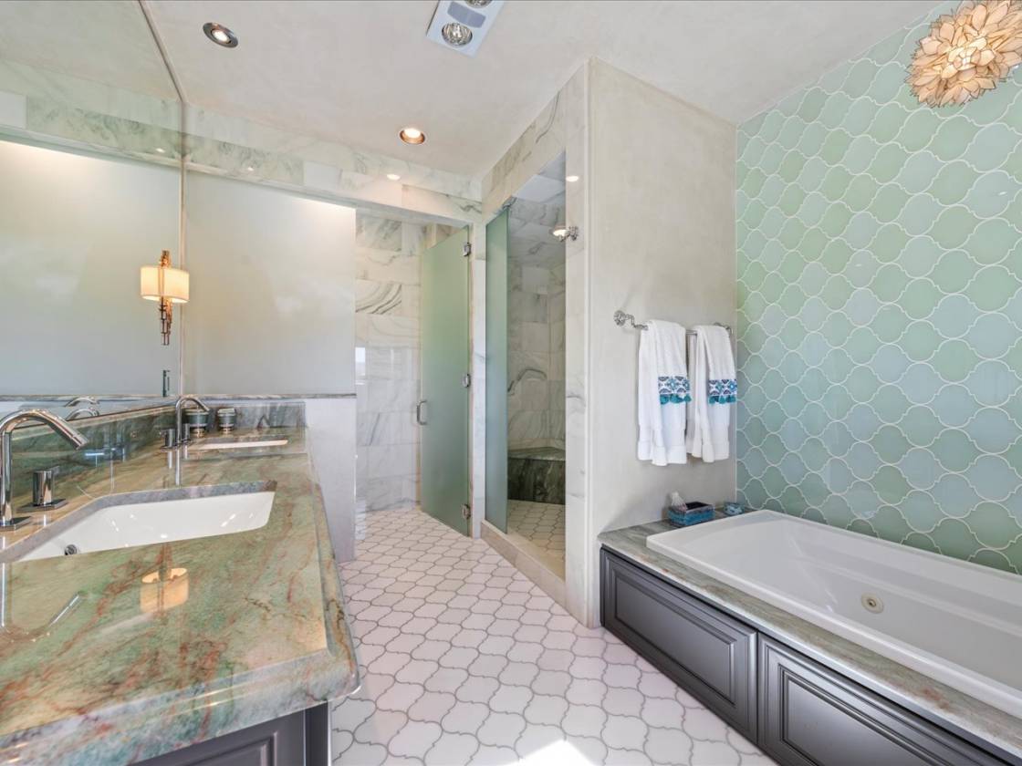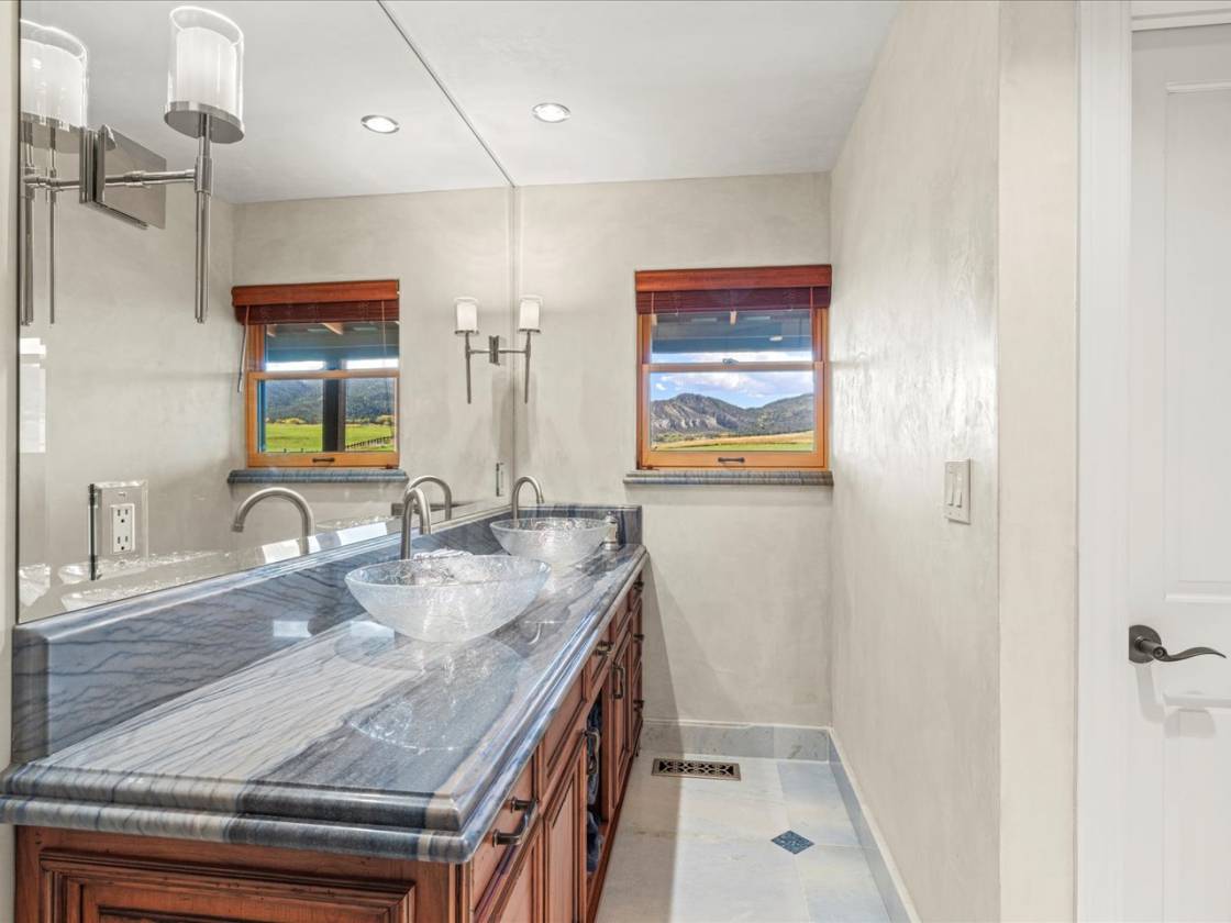 - Three of the four bedrooms are large master suites each with their own magnificent themes. There are a total of four fireplaces throughout the home. Each room is sunlit with oversized windows and 16-foot vaulted ceilings. Each bath has warm floor heating. These elegant spaces are truly distinctive, offering comfort and tranquility. Primary bath is adorned with a Acquiem Quartzite vanity and tub surround, with Glacier White Arabesque Marble tile flooring, Spring Statuary marble shower, TC, walls and lid enclosed with Frosted glass and steamer and a 6’ Kohler jetted tub. An absolute must-see! The two other large guest suites stand alone, each boasting unique design of African Mahogany closet doors, Azul Macauba Quartzite vanity, bench and sills, soaker bathtub with waterfall filler and steam shower. Guest bathroom three has Jerusalem Gold Tumbled Limestone, Italian marble, and honey Onyx vessels supported by a Mahogany vanity. Bedroom three boasts the most amazing honey Onyx Basketweave wall surrounding an arched fireplace.