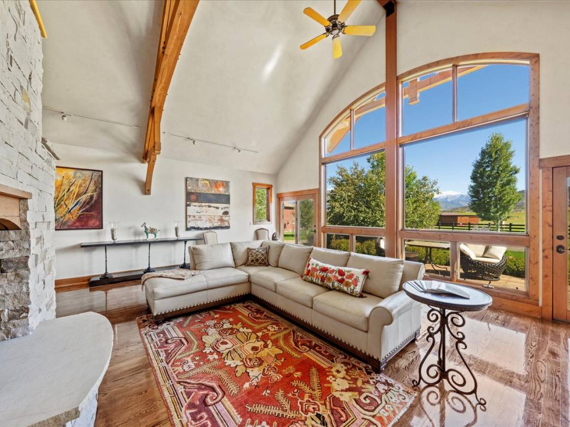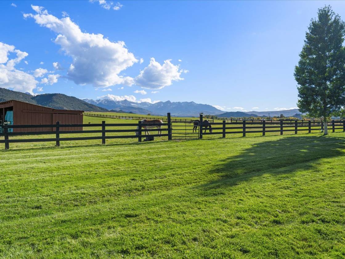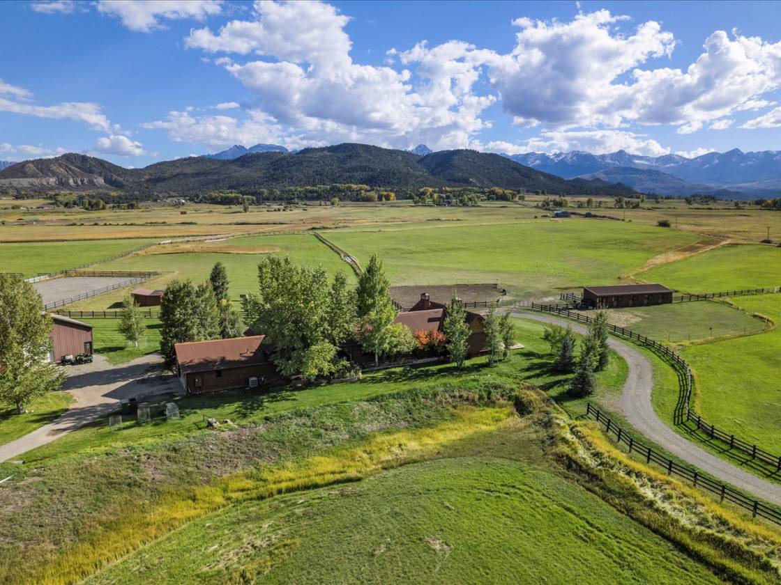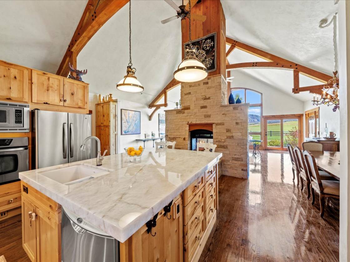Welcome to the coveted Infinity Ranch, located on the spectacular Pleasant Valley floor of Ridgway, Colorado. The setting of this incredible ranch starts with breathtaking views of the San Juan Mountains and Cimarron Range. Imagine living the dream in such a pristine environment, taking in the fresh mountain air, looking out over your horses with lush green pastures in every direction. This amazing retreat is 3,854 sq. ft. of brilliant workmanship. Solid oak floors and Integral Plaster throughout enhance the home's high-end finishes. Massive Douglas Fir Arched beams and windows frame the views from the Great Room with 20-foot vaulted ceilings. Stay warm with a custom 2-sided Aspen Sandstone fireplace. The gourmet kitchen has floor-to-ceiling custom knotty alder cabinets. The exotic South American Crystalo Quartzite slab island is 5’x7’x3” heated and has 2 cold prep areas, and is a brilliant addition. A 6-burner gas Viking range is enhanced with an Onyx backsplash and Commercial Vent Hood. Amana appliances and Fisher Paykel Dishwasher drawers finish the chef’s kitchen.