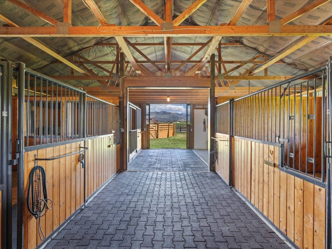 - The 100 x180 foot arena and a 50-foot round pen are just steps away from your 5-stall barn, with a tack room, indoor wash stall with hot and cold running water. Another 5-stall covered turnout, along with hay storage and 2 dry lots, and 3 loafing sheds, completes the picture for all the critters. Ride on your property, taking in the amazing views and breathing the clean mountain air.