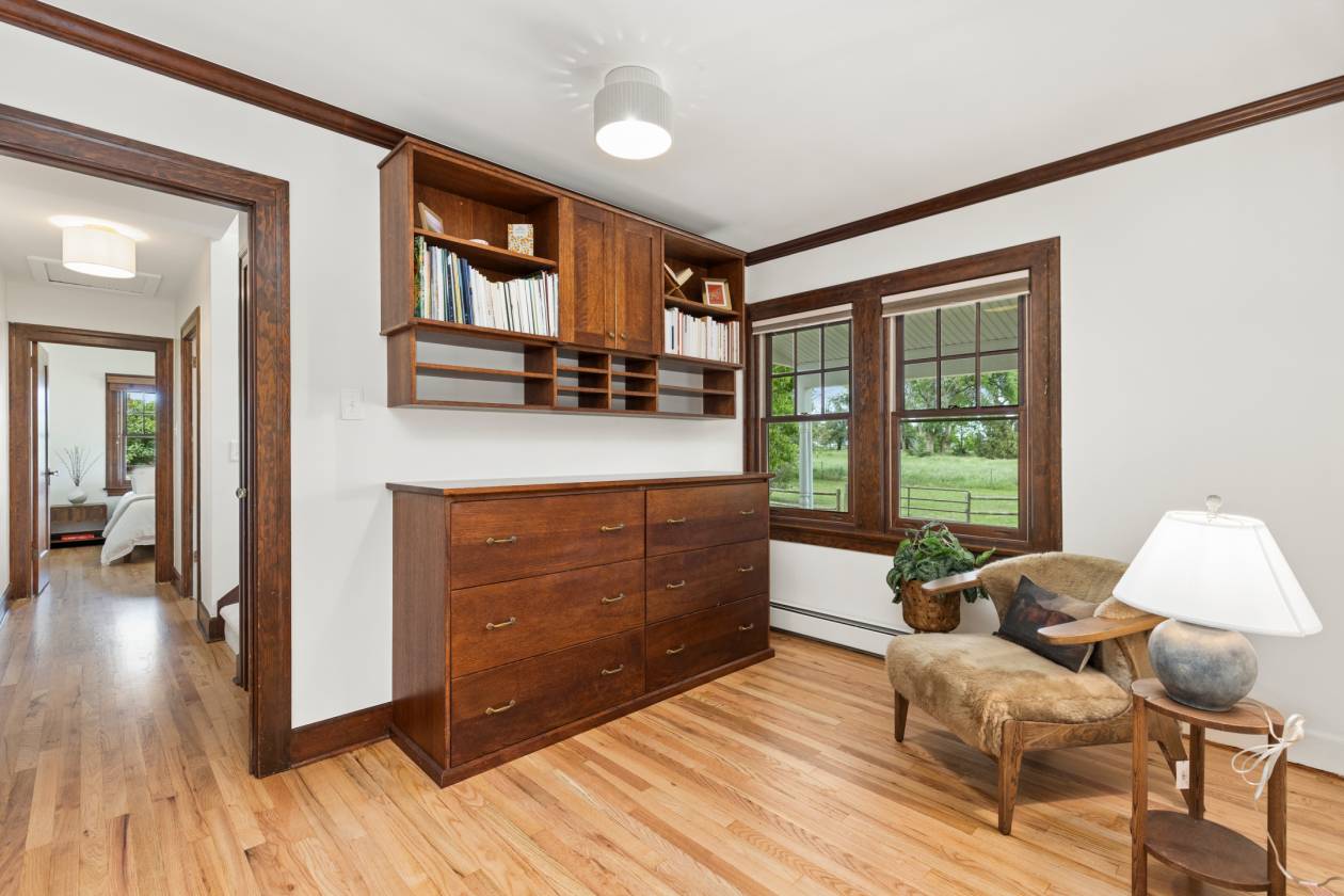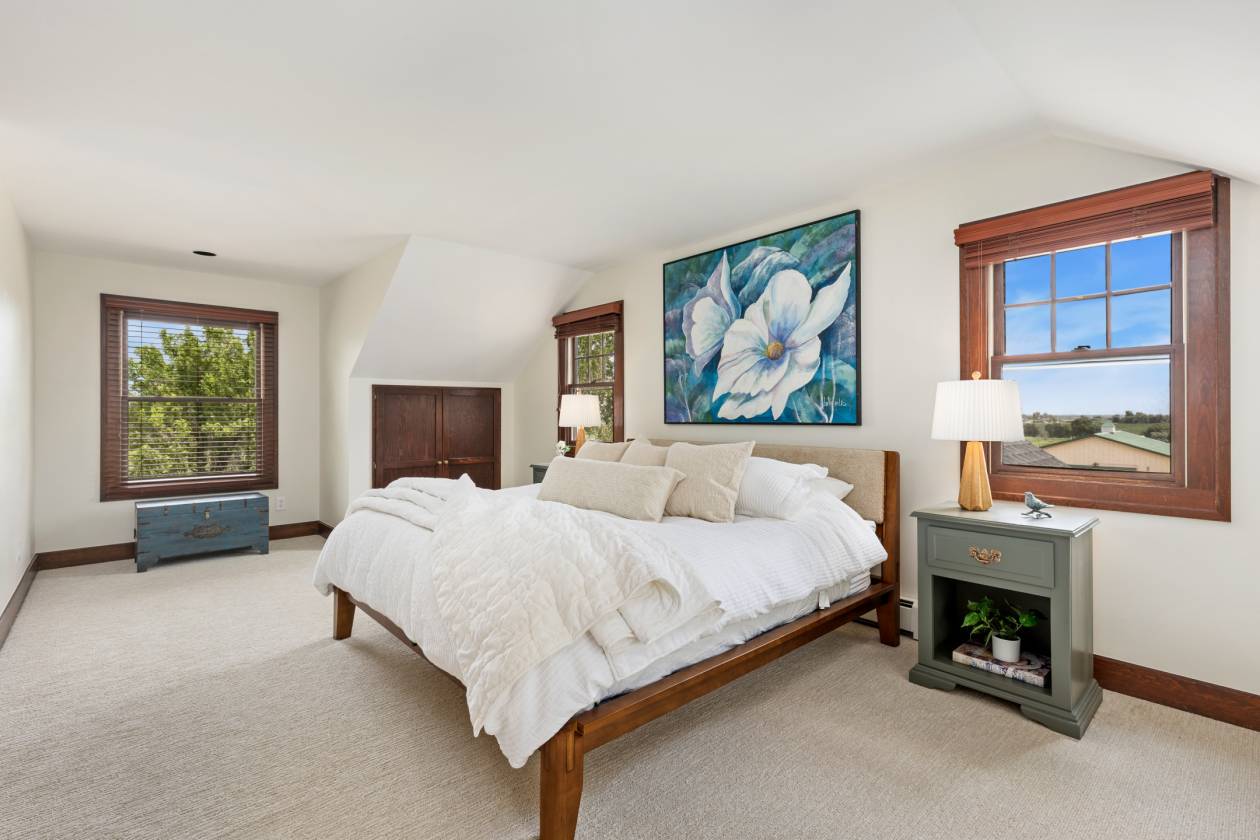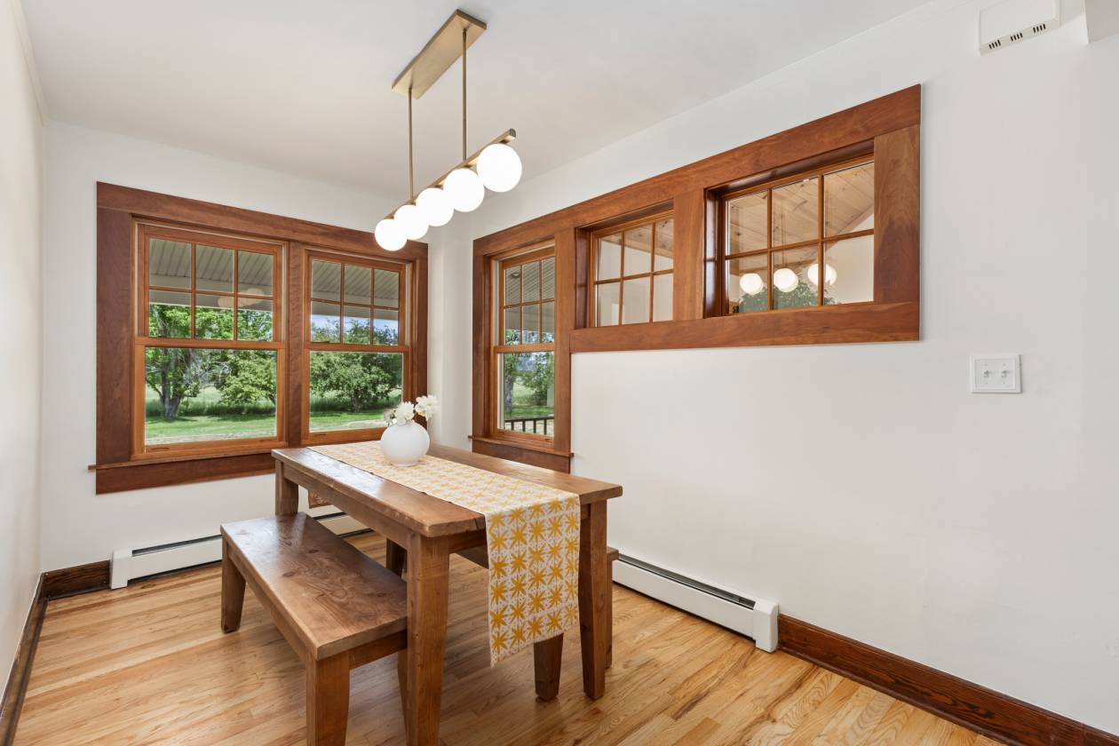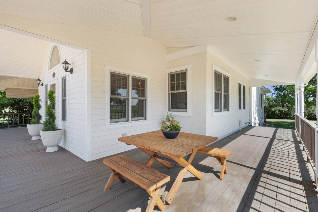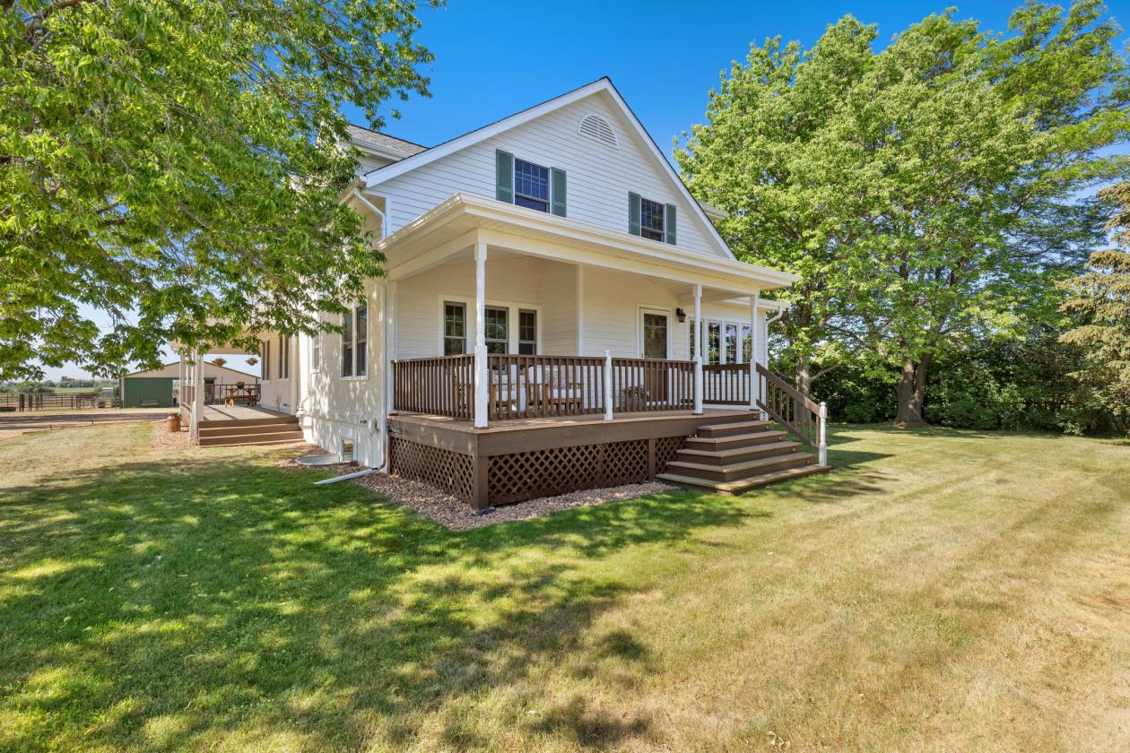 Charming 1934 Craftsman-Style Farmhouse on 11.23 acres with Equestrian amenities and panoramic pasture views. Originally located in Denver's Highlands, relocated and expanded in 2000. 5 bedrooms/3 bath layout with natural light, formal dining, breakfast nook, cook's kitchen and finished basement. Lilac privacy wall, mature trees and flower beds enhance the setting. Long driveway leads to a central square with mudroom entry, barn with 6 stalls and runs, 3-bay shop with tack room, and custom hay shed designed for stack retriever delivery. Approximately 7 acres in hay production yields 200-300 bales per year. Additional features include a chicken coop, 2 dry lots, paddocks, roping arena with cattle chute and jump-friendly footing.