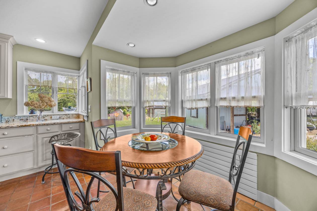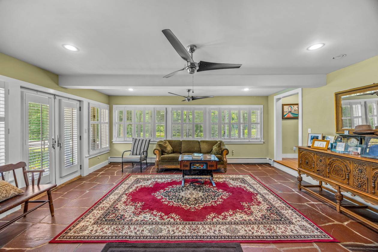 - The adjacent formal dining room features original hardwood flooring, leading to a sun-filled living room with red slate floors and custom shutters that frame the natural light beautifully.