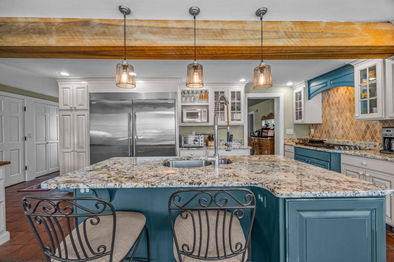- The rear entry of the home includes an attached garage and a practical mudroom, highlighted by a unique banker’s window that opens to a spacious walk-in pantry—both original design features that add charm and functionality. Corrugated metal accent walls lead you into the heart of the home: a stunning chef’s kitchen. This gourmet space boasts granite countertops, high-end stainless-steel appliances, original exposed beams, and a grand center island with bar seating. Culinary features include a Bosch dishwasher, a DCS by Fisher & Paykel cooktop, Electrolux double wall ovens, and an oversized Electrolux French door refrigerator. A cozy breakfast nook completes the space, ideal for morning coffee or casual dining.