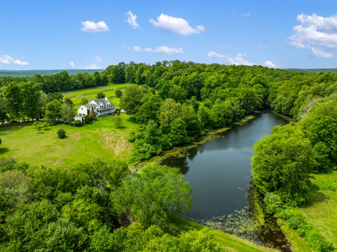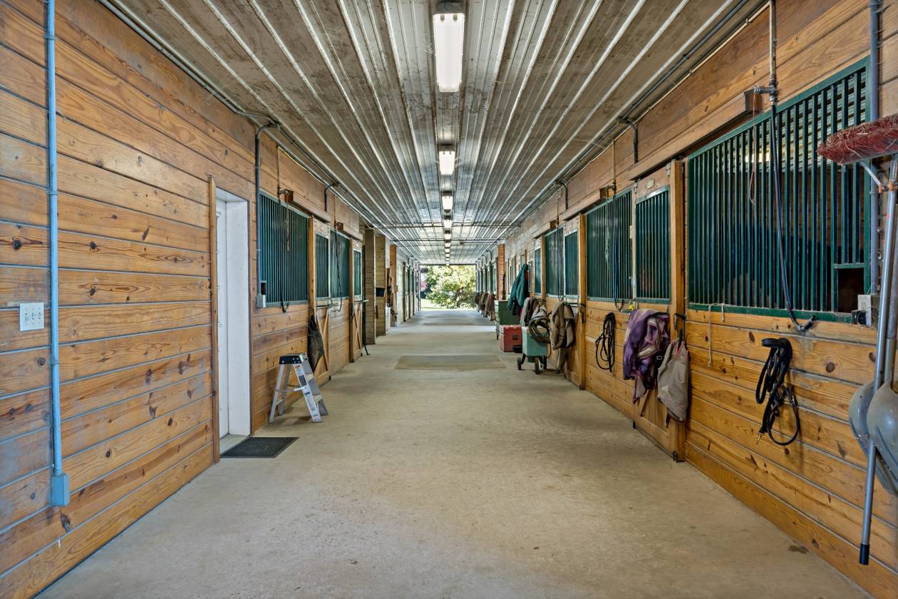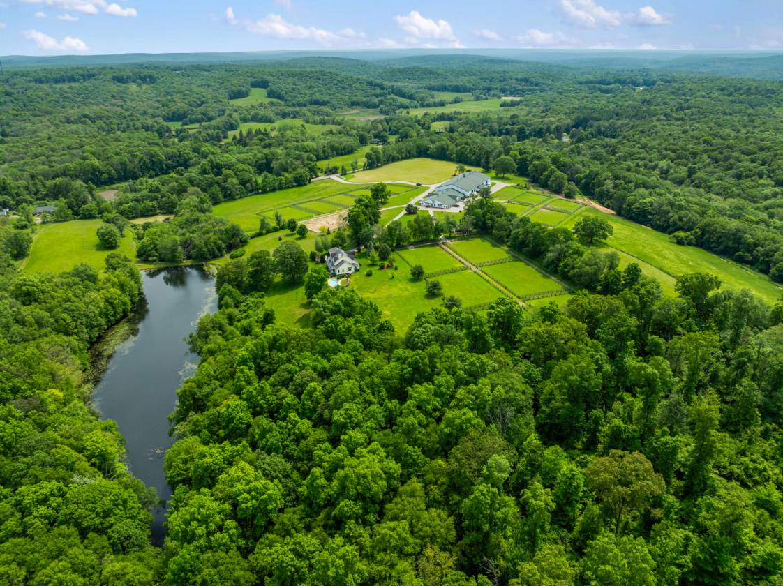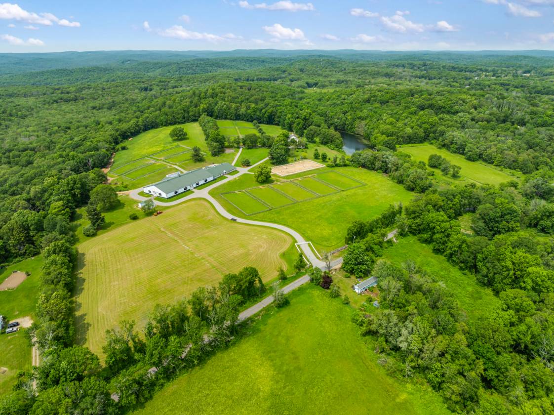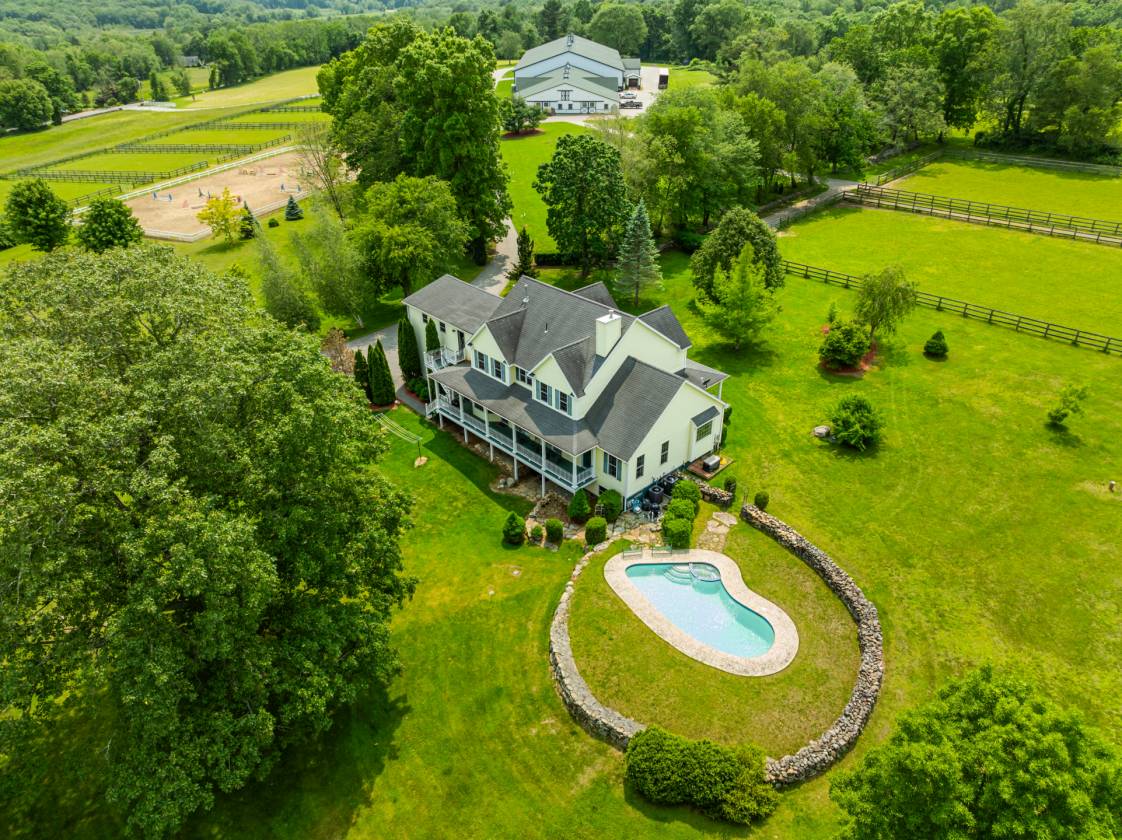 Nestled amid a peaceful countryside, this exceptional horse property presents a rare opportunity to acquire a versatile estate that seamlessly combines elegant residential living with impressive equestrian facilities. This distinguished professional horse farm stands as a turnkey sanctuary for those seeking solitude, sophistication, and functionality in equal measure. A private gated entry welcomes you with both security and a sense of arrival. Refined yet grounded in rural charm, the home beckons you with a timeless wraparound porch, offering the first glimpse of a lifestyle steeped in tranquility and purpose. Stepping inside, you're greated by 9-foot ceilings that amplify light and space. The architectural cadence walks a perfect line between classic character and contemporary comfort. Hardwood floors underfoot lend warmth and continuity to the gracious floorplan. The home is thoughtfully designed for grand scale entertaining as well as a relaxed daily lifestyle. A formal dining room offers an elegant space for hosting dinners and special occasions. Multiple sliding glass doors accentuate an indoor/outdoor flow that ensures the connection to the natural environment is always present. Adjacent living areas provide a cozy retreat for relaxation by the beautiful fireplace, balanced by the surrounding built-ins. The kitchen, featuring an eat-in dining area, is inviting for quick meals to elborate culinary creations. Custom wood cabinetry, generous granite-topped counterspace, and natural light make it a hub everyone will natually gravitate toward. The main level primary bedroom suite is also conveniently situated for wonderful single floor living. Generously proportioned, the primary bedroom offers a welcoming refuse from long days. Fully remodeled, the primary bathroom is well-appointed with a whirlpool tub, glass walk-in shower, double vanity, additional closets, and large picture window that captures the sunbeams. The main level continues with a dedicated home office, powder room, laundry room, and access to the oversized attached 2-car garage. The owner's residence further expands upstairs to 2 additional sizeable bedrooms serviced by another full bathroom. The upper level is also home to the first of 2 fully independent apartments, expanding the versitlity for family use, guest lodging, or operational staff accommodations. Privacy and independence is magnified with stairs leading up to its own entry, also with interior access. Truly another home within the house, the apartment features wide-plank hardwood floors, open-concept floor plan, fieldstone gas fireplace, built-in bookcases, kitchen with island, dining area, 2 bedrooms, and updated marble tile bathroom. The lower level adds over 1,500sf of further finished living space, ideal for recreational room, home gym, media room, and with ample storage throughout unfinished spaces. The second full apartment, with walk-out basement sliding door access, is made efficient with kitchenette, living room, full bathroom, bedroom, and another room that could serve as overflow sleeping or office space. The exterior grounds unfold to quietly celebrate the relationship between land and lifestyle. Relax, entertain, and explore under canopies of trees and the patter of horseshoes. Farm-to-table living is at its best with raised garden beds for growing herbs, vegetables, or seasonal blooms. Soak in summer afternoons with a glimmering heated gunite pool and adjacent hot tub. Endless groomed paths weave along open hay fields and past spring-fed reflection ponds. Flanked by verdant pastures, paddocks, endless stone walls, and professional landscaping, the property’s greatest amenity may be the setting itself. Whether you ride competitively or simply appreciate the daily rhythm of life with horses, this land supports every stride. A standout facility for every level of horsemanship. Rendez-Vous Farm has been as well-established premier boarding and training destination in Connecticut for over 20 years. King Construction built 26-stall heated barn is beautifully designed with wide center aisles, 4 wash stalls with hot water and overhead heat lamps, 2 heated tack rooms, heated viewing lounge, heated locker room, laundry room, and full bathroom. Roomy matted stalls with windows. Barn conveniently connects to 100'x200' indoor arena with premium footing and overhead mist sprinkler system. The phenominal grounds include a 100'x200' outdoor riding ring with automatic sprinkler system, 15+ large grass paddocks, round pen, and grand prix/hunt field. Security system provides extra safety and exclusivity. Altogether, the estate strikes a delicate balance of residential comfort rooted in luxury, rural beauty engineered for real life, and an equestrian facility that brings passion home.