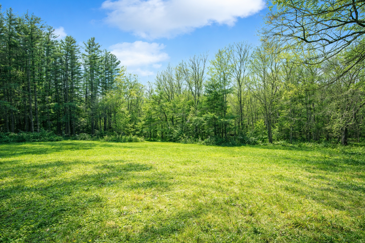 - Scenic landscape with a mix of open field and mature trees