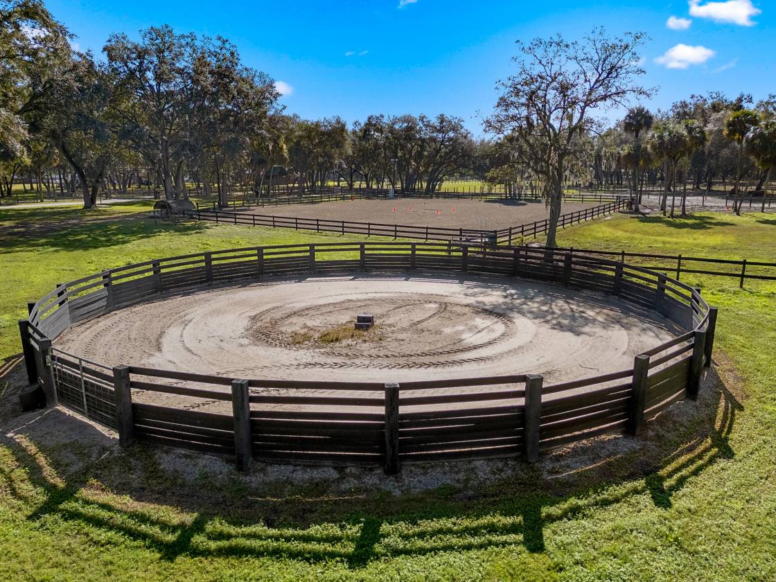 includes a 100’ by 200’ riding arena with stadium lighting, 60’ round pen, and fully fenced