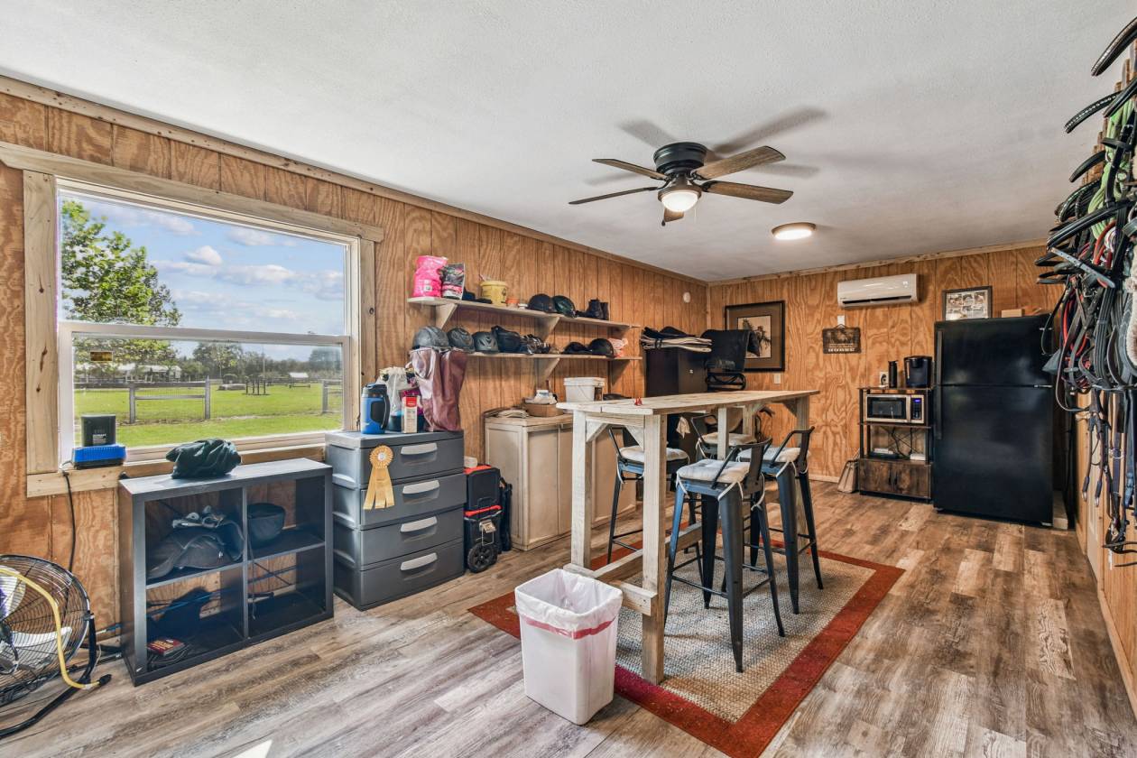 - Air-conditioned 12x24 tack room with full bath, fridge,