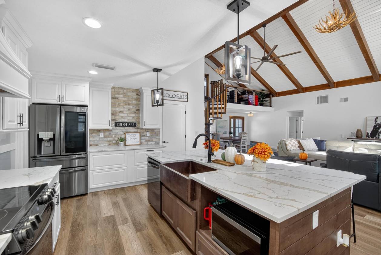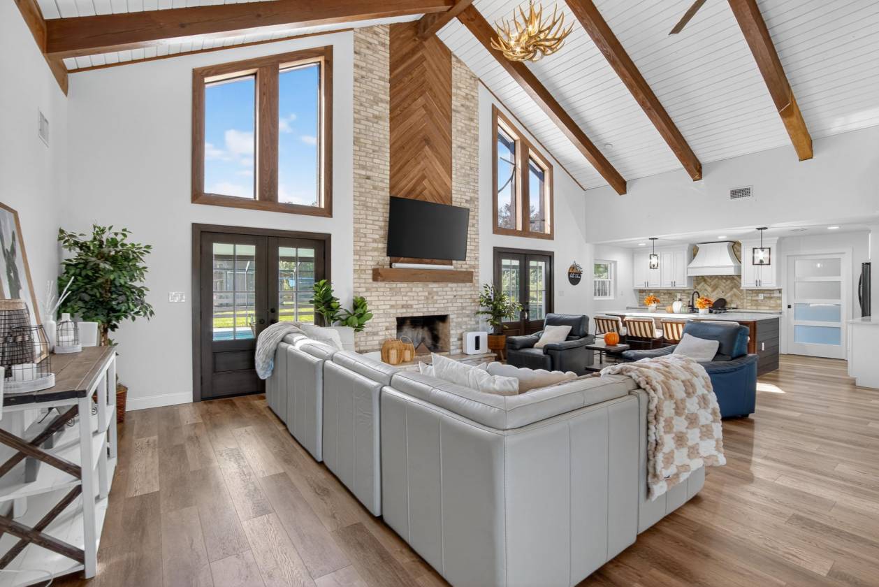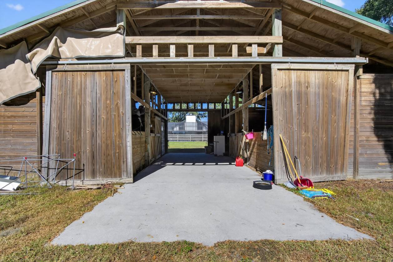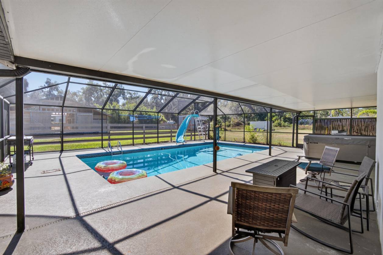 RENOVATED COUNTRY LIVING ON 3 ACRES WITH POOL & BARN!? Enjoy the charm of country living with modern upgrades and everyday convenience — all just minutes from I-4. This inviting 3 BEDROOM, 3 BATH HOME with LOFT, POOL, and 1,500 SF BARN is perfectly situated on 3 FENCED ACRES, thoughtfully divided into separate sections for animals, GREENBELT, and recreation. Inside, the open living area features 20-FOOT CEILINGS, WOOD BEAMS, REAL WALNUT ACCENTS, and a stunning FIREPLACE that serves as a focal point unifying the space. The kitchen blends functionality with timeless style, showcasing a QUARTZ SINGLE-SLAB ISLAND with storage, REAL COPPER SINK, SMART LG APPLIANCES, WALK-IN PANTRY, and custom walnut trim. The PRIMARY SUITE is a true oasis, offering a CUSTOM AMISH-BUILT VANITY, QUARTZ COUNTERTOPS, a 70-SQ-FT WET ROOM, and a HUGE WALK-IN CLOSET. Upstairs, the LOFT with WALKOUT BALCONY overlooks the property and provides a flexible living or office space. Major updates ensure peace of mind with updated energy efficient vinyl windows and IMPACT RATED ENTRY DOORS (with transferable warranty), NEW DUCTWORK, refurbished AC units, NEW WATER SOFTENER, and a LIFETIME STANDING SEAM METAL ROOF (approximately 10 years) with SEAMLESS GUTTERS. The exterior has been re-stuccoed and painted. The barn is ready for horses (or hobby) complete with water and electric service, two 15x18 stalls and two 15x20 stalls (two with rubber padding), water basins, bins, and breezeways on both sides for convenience. A tack room with loft storage adds organization, and a separate 15x20 concrete slab (current shed) nearby offers space for a new workshop, or future structure. The new back fence and stabilized trees following the 2024 hurricanes enhance both safety and longevity. Outdoor living is just as enjoyable, featuring a SCREENED POOL with NEW POOL PUMP and HOT TUB (4 years new). The POOL BATH offers convenient access for outdoor gatherings, and the HERRINGBONE BRICK FLOOR laundry/mudroom provides a stylish, practical transition indoors. With thoughtful renovations, quality updates, and dry land, this property offers a comfortable and functional country lifestyle ready to be enjoyed for years to come.