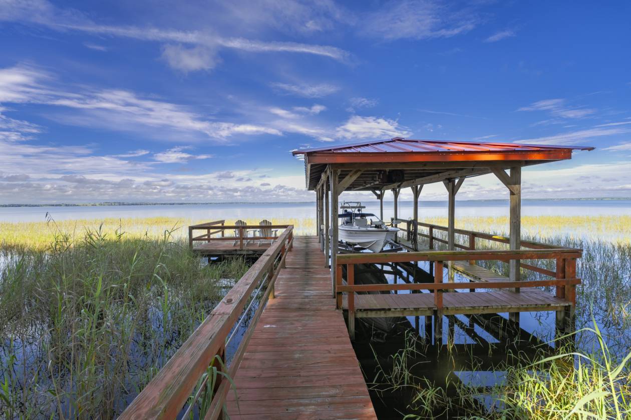 - A private dock on the estate parcel features new electrical wiring, decking, and a boat lift for direct access to Lake Harris and the full chain of lakes. Explore 75,000 acres of interconnected waterways renowned for their natural beauty, boating, and fishing opportunities.