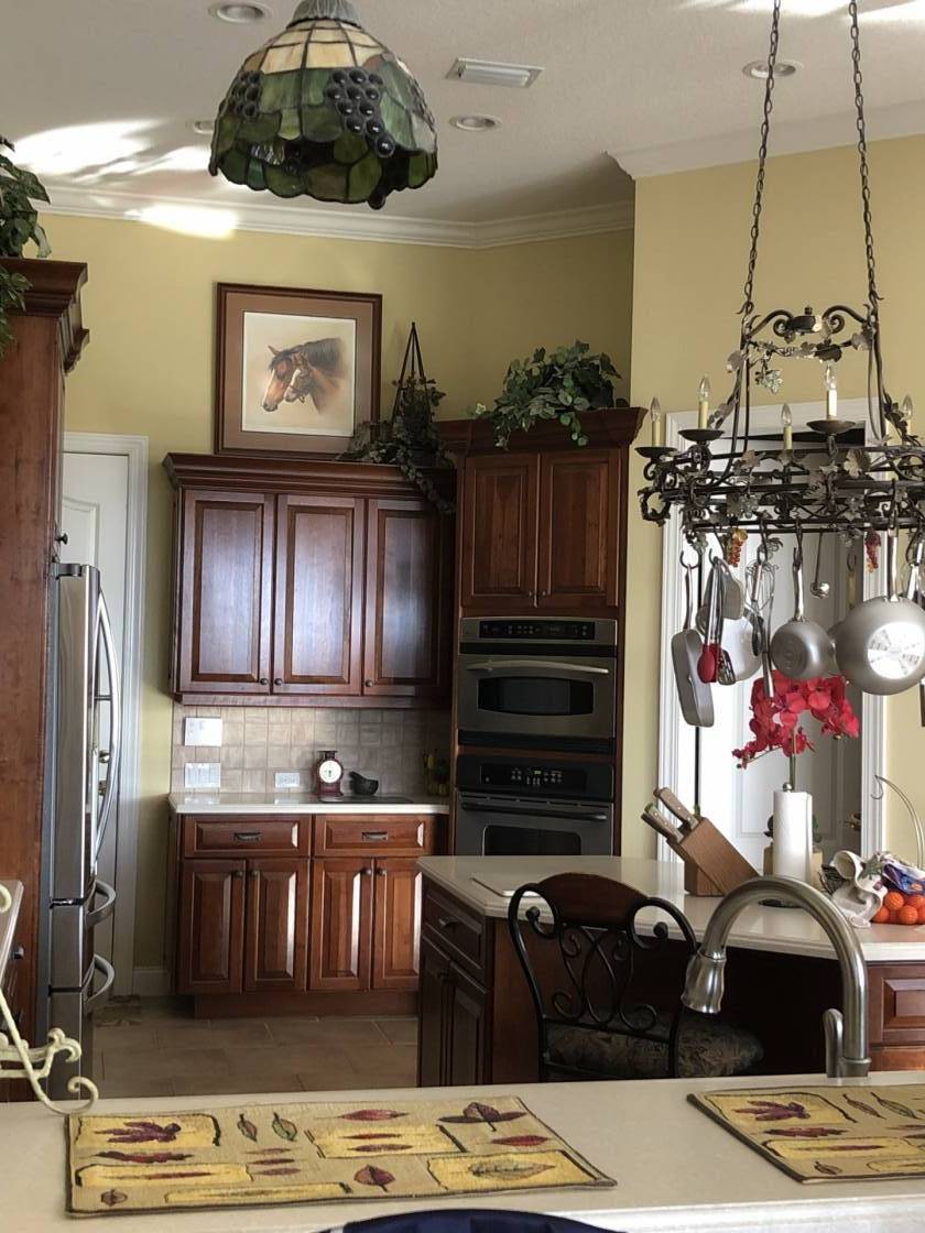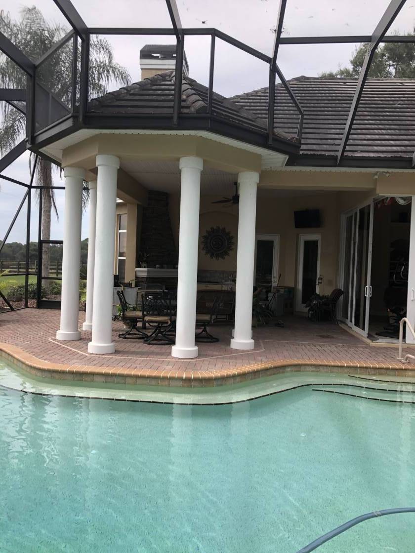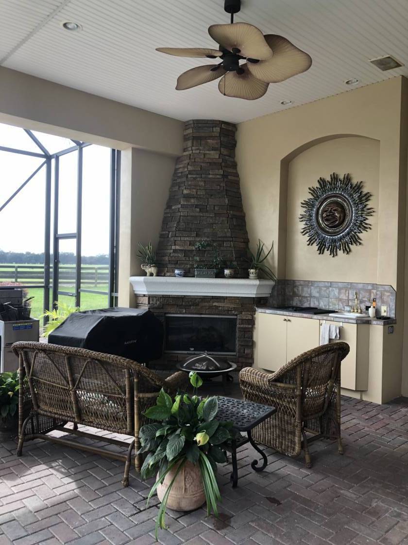 - Stunning Block custom 3/3 1/2 baths 4,304 sf pool/spa home, open eat in kitchen butler area with wet bar formal dining room, ceiling fans coffered ceilings with crown molding ,tile floor, marble and Corian counter tops carpet throughout bedrooms, game room and exercise room wood flooring in office with custom built in desk and shelving, central vacuum system, two Gas fireplaces one inside located in formal dining room one outside located under the gazebo next to the built-in outdoor grill/seating area/ with TV.