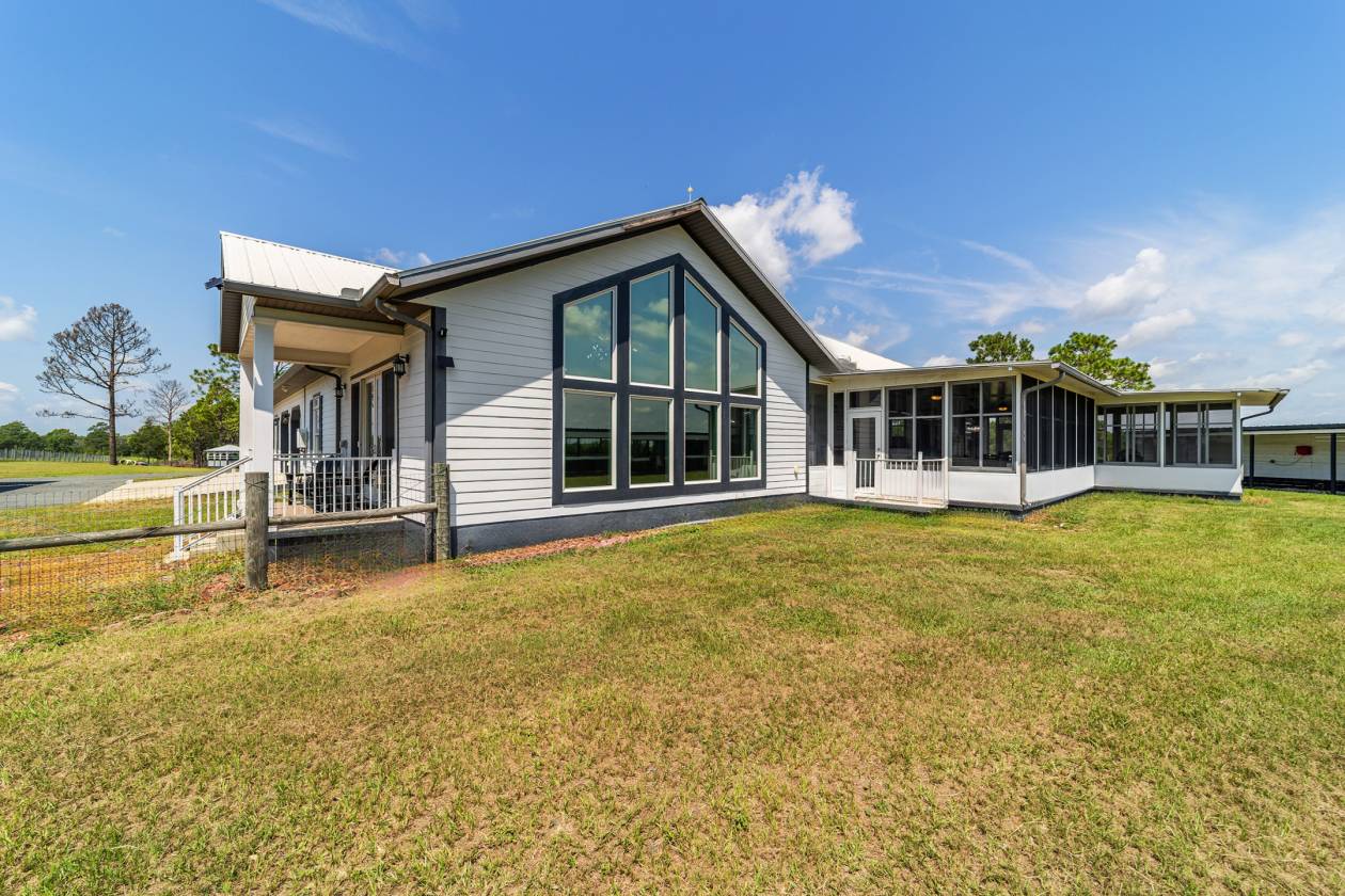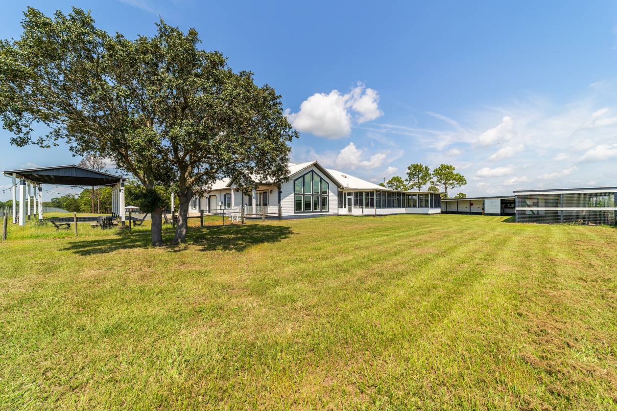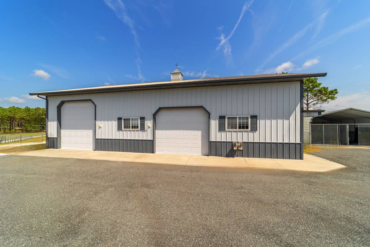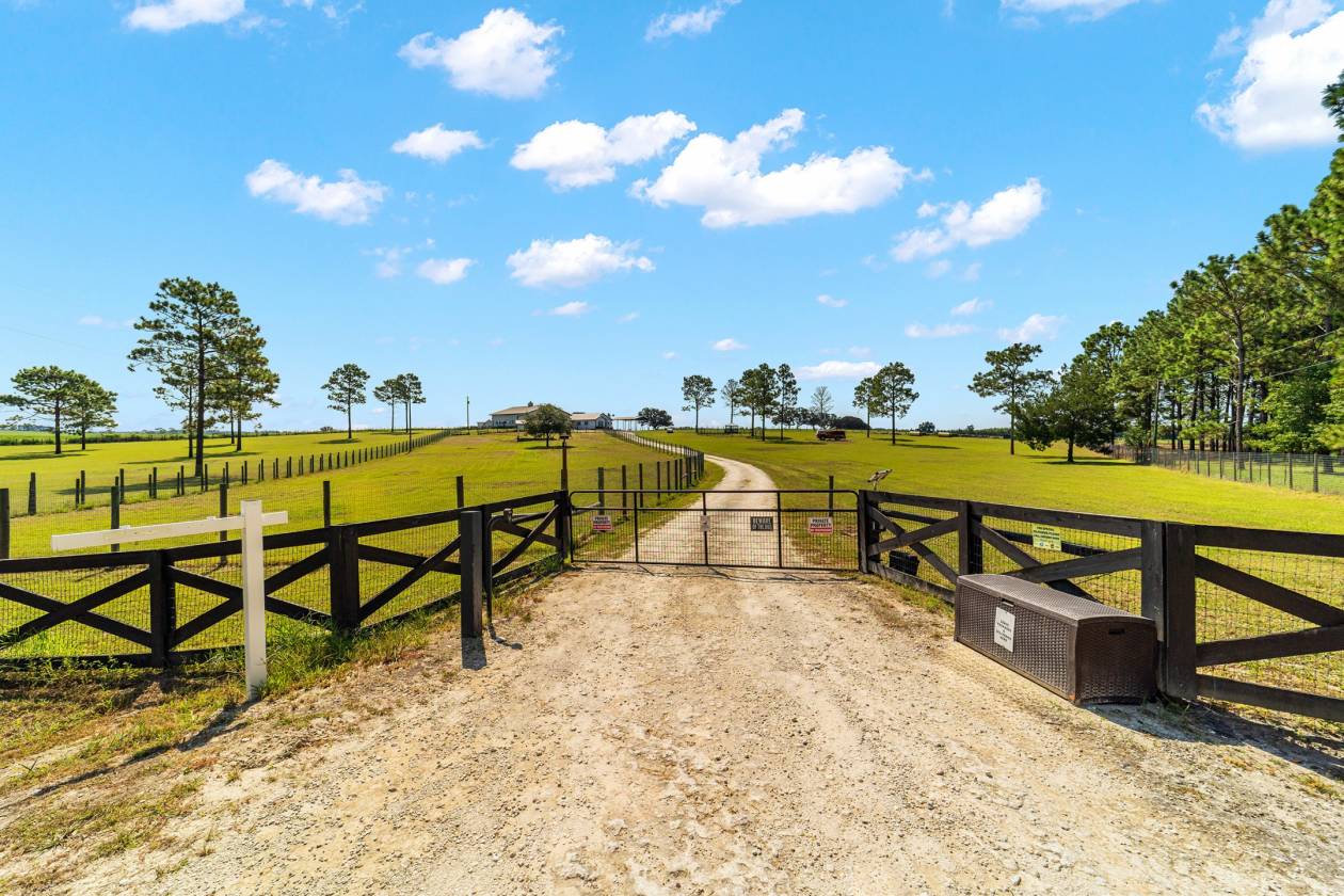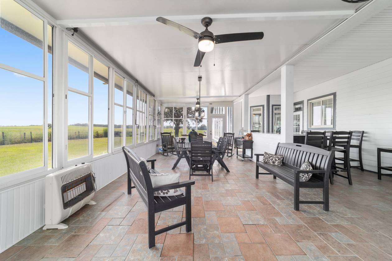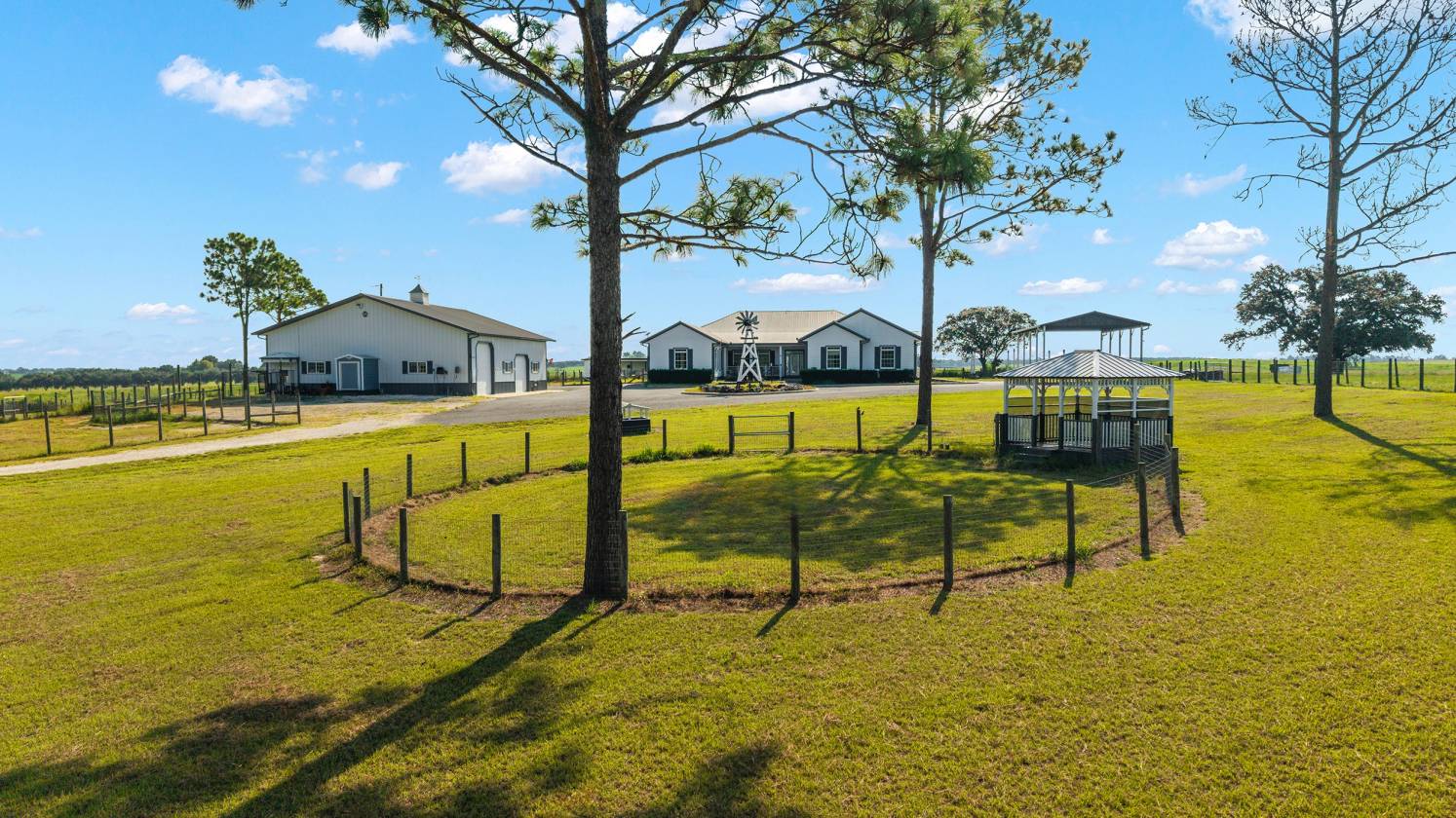Perched atop a scenic hill with breathtaking views of over 100 acres of rolling pastureland, this exceptional 5-acre farm offers the perfect blend of luxury, privacy, and rural charm. As you pass through the gated entrance, a limerock drive leads to a circular asphalt driveway that brings you to the heart of the property—where a 6,000+ sq ft modern farmhouse, striking windmill centerpiece, and a collection of thoughtfully designed outbuildings await. A wide wooden front deck offers the perfect perch to enjoy panoramic sunsets or toast marshmallows by the fire. Step up to the charming rocking-chair front porch and peaceful koi pond before entering a foyer that opens into the light-filled main living area. The living room features cathedral picture windows, a gas fireplace with tiled surround, and French doors that lead to a private side porch with firepit and fenced area—ideal for cozy evenings. Porcelain tile floors and elegant chandeliers flow throughout the home. The gourmet kitchen is a chef’s dream with custom white cabinetry, a center island, eat-in breakfast bar, quartz countertops, and top-of-the-line Sub-Zero and Viking stainless steel appliances. A large stainless sink overlooks the backyard, while the open design creates a perfect space for cooking, entertaining, or morning coffee. On the north wing, you'll find a dedicated office with built-in shelving, a stylish half bath for guests, and the luxurious primary suite. The suite includes porch access, a walk-through closet, and a spa-like bath with dual sinks and an expansive double-head tiled shower. An additional guest suite with full bath and a utility room with outdoor access are also located on this side. On the opposite wing, you'll find a laundry room with utility sink and cabinetry, which leads to an insulated, climate-controlled 2-car garage featuring built-in dog crates. A private bedroom is located just off the garage—perfect for guests or extended family—and on the south side of the home there is another full bedroom and bath. Built with durability and energy efficiency in mind, this home features 12-inch poured concrete walls, new hurricane-rated windows, Icynene spray foam insulation, a 27kW Generac generator with 1,000-gallon propane tank, metal roof, 3 new HVAC units, tankless water heaters, and a whole-house water filtration system. Outdoors, the amenities are unmatched. A large Morton 48’x60’ barn includes a climate-controlled room, RV garage with roll-up doors, 50-amp hook-up, reinforced slab for Class A motorhomes, and a half bath with exterior access—making it ideal for events, workshops, or large equipment. A 4-bay utility shed is connected to a spacious chicken coop with indoor/outdoor runs, and a 40-foot pole barn offers RV or trailer storage. The fully fenced acreage includes one large pasture with a pole barn ready for two stalls, round pen, dog pens, an additional 3-sided metal storage building, and manicured landscaping throughout. Located high and dry, every corner of this property has been carefully designed for comfort, functionality, and farm lifestyle excellence.