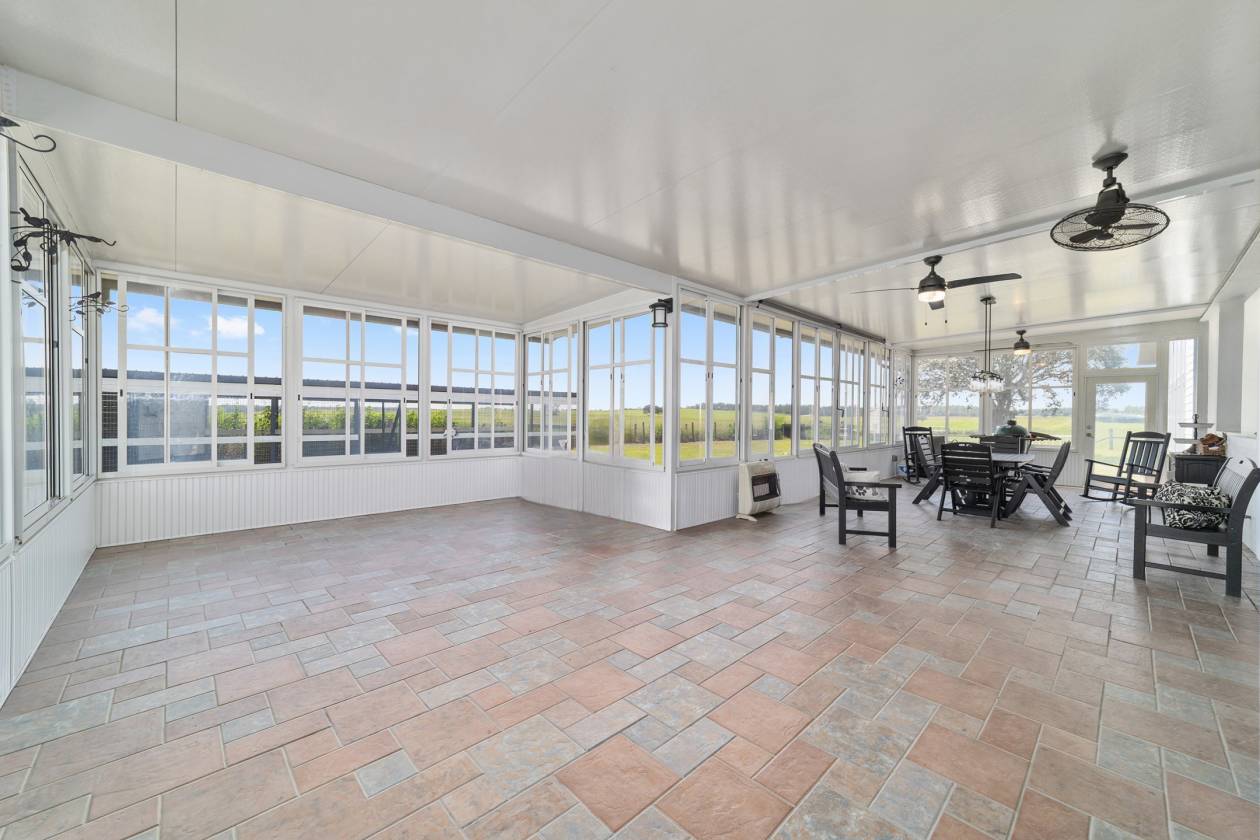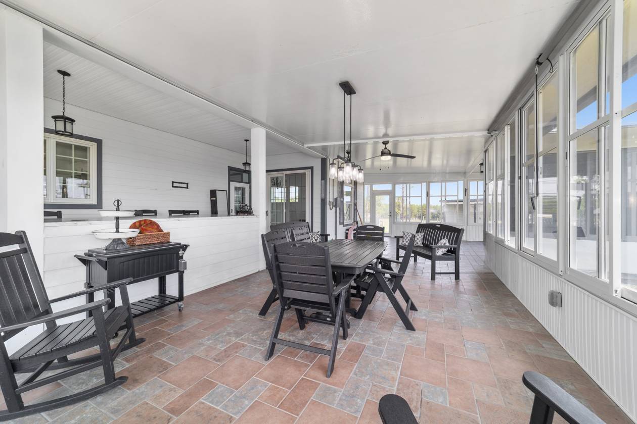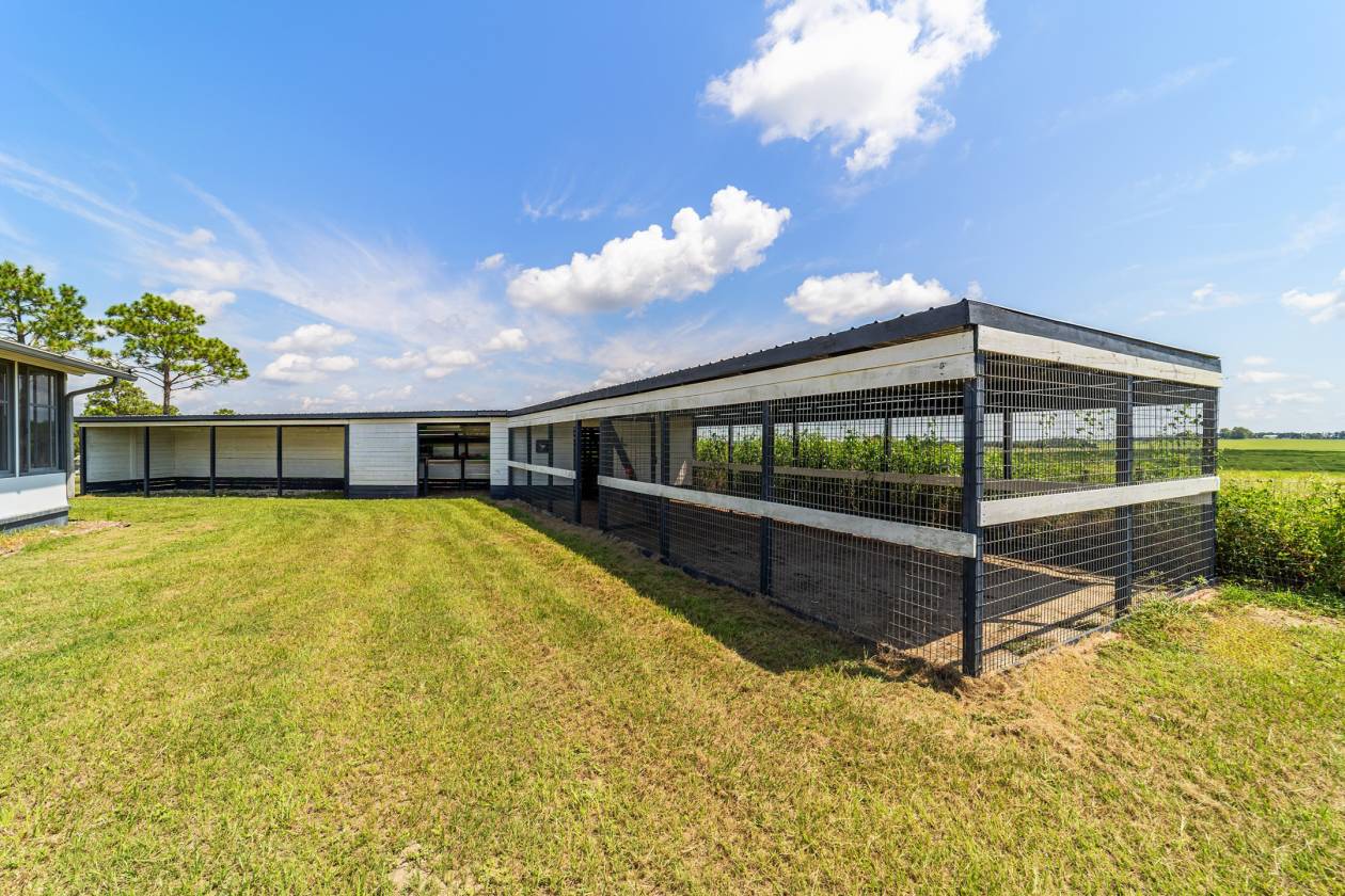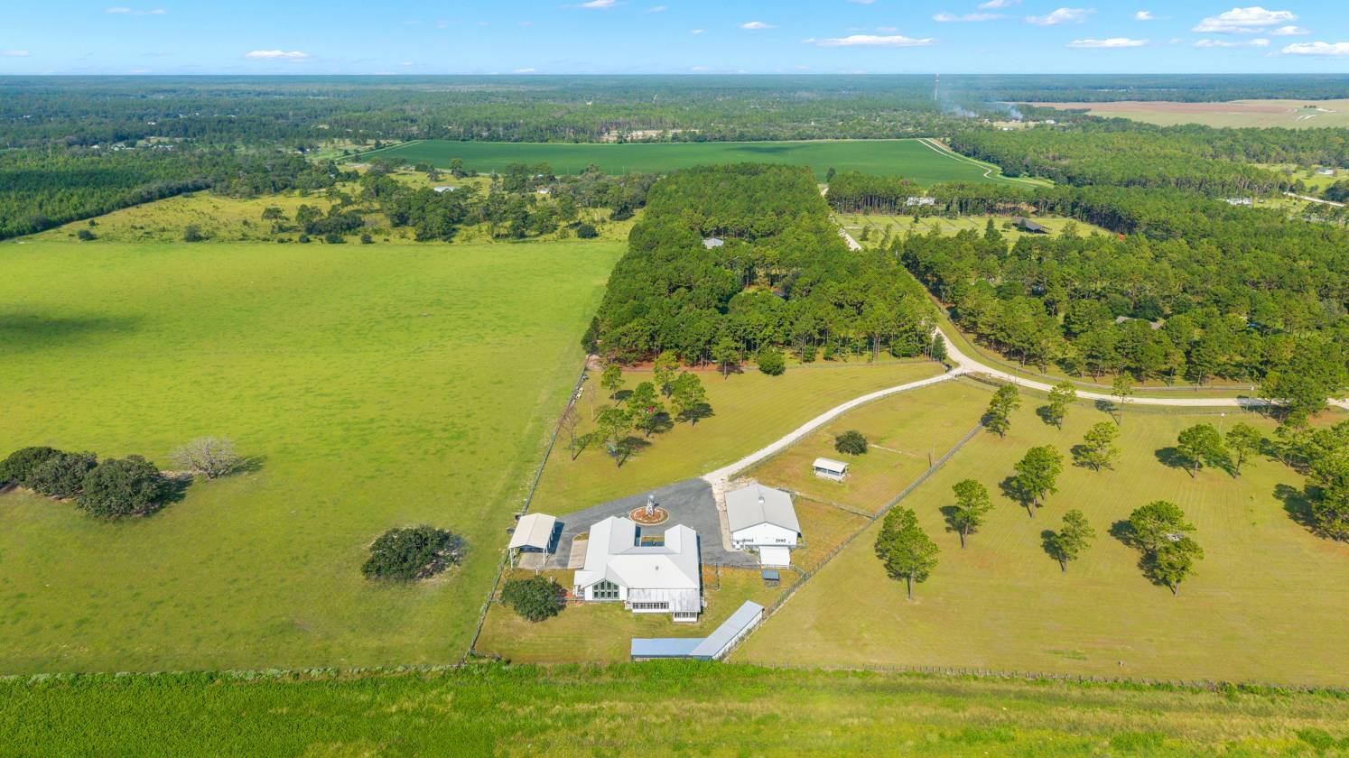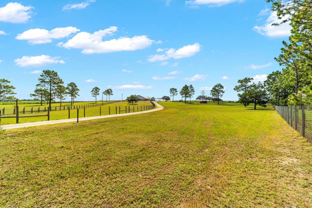 Perched atop a scenic hill with breathtaking views of over 100 acres of rolling pastureland, this exceptional 5-acre farm offers the perfect blend of luxury, privacy, and rural charm. As you pass through the gated entrance, a limerock drive leads to a circular asphalt driveway that brings you to the heart of the property—where a 6,000+ sq ft modern farmhouse, striking windmill centerpiece, and a collection of thoughtfully designed outbuildings await. A wide wooden front deck offers the perfect perch to enjoy panoramic sunsets or toast marshmallows by the fire. Step up to the charming rocking-chair front porch and peaceful koi pond before entering a foyer that opens into the light-filled main living area. The living room features cathedral picture windows, a gas fireplace with tiled surround, and French doors that lead to a private side porch with firepit and fenced area—ideal for cozy evenings. Porcelain tile floors and elegant chandeliers flow throughout the home. The gourmet kitchen is a chef’s dream with custom white cabinetry, a center island, eat-in breakfast bar, quartz countertops, and top-of-the-line Sub-Zero and Viking stainless steel appliances. A large stainless sink overlooks the backyard, while the open design creates a perfect space for cooking, entertaining, or morning coffee. On the north wing, you'll find a dedicated office with built-in shelving, a stylish half bath for guests, and the luxurious primary suite. The suite includes porch access, a walk-through closet, and a spa-like bath with dual sinks and an expansive double-head tiled shower. An additional guest suite with full bath and a utility room with outdoor access are also located on this side. On the opposite wing, you'll find a laundry room with utility sink and cabinetry, which leads to an insulated, climate-controlled 2-car garage featuring built-in dog crates. A private bedroom is located just off the garage—perfect for guests or extended family—and on the south side of the home there is another full bedroom and bath. Built with durability and energy efficiency in mind, this home features 12-inch poured concrete walls, new hurricane-rated windows, Icynene spray foam insulation, a 27kW Generac generator with 1,000-gallon propane tank, metal roof, 3 new HVAC units, tankless water heaters, and a whole-house water filtration system. Outdoors, the amenities are unmatched. A large Morton 48’x60’ barn includes a climate-controlled room, RV garage with roll-up doors, 50-amp hook-up, reinforced slab for Class A motorhomes, and a half bath with exterior access—making it ideal for events, workshops, or large equipment. A 4-bay utility shed is connected to a spacious chicken coop with indoor/outdoor runs, and a 40-foot pole barn offers RV or trailer storage. The fully fenced acreage includes one large pasture with a pole barn ready for two stalls, round pen, dog pens, an additional 3-sided metal storage building, and manicured landscaping throughout. Located high and dry, every corner of this property has been carefully designed for comfort, functionality, and farm lifestyle excellence.