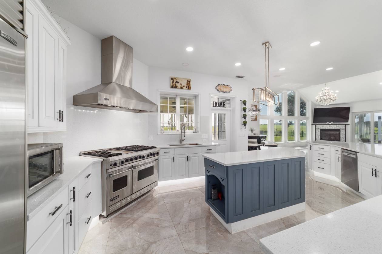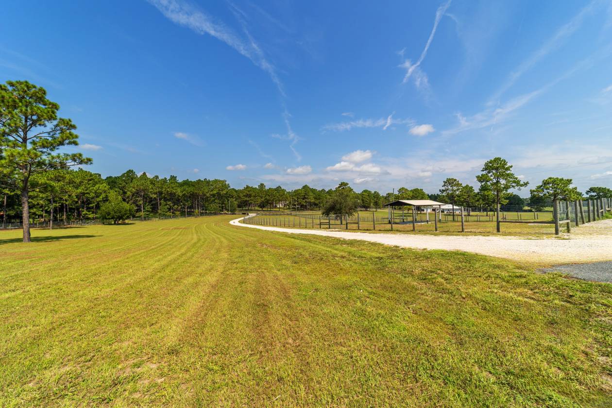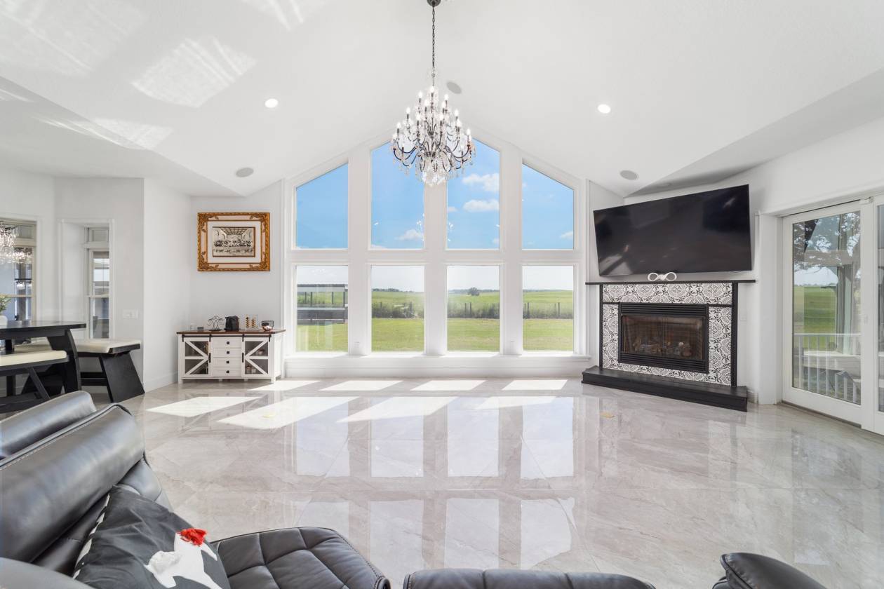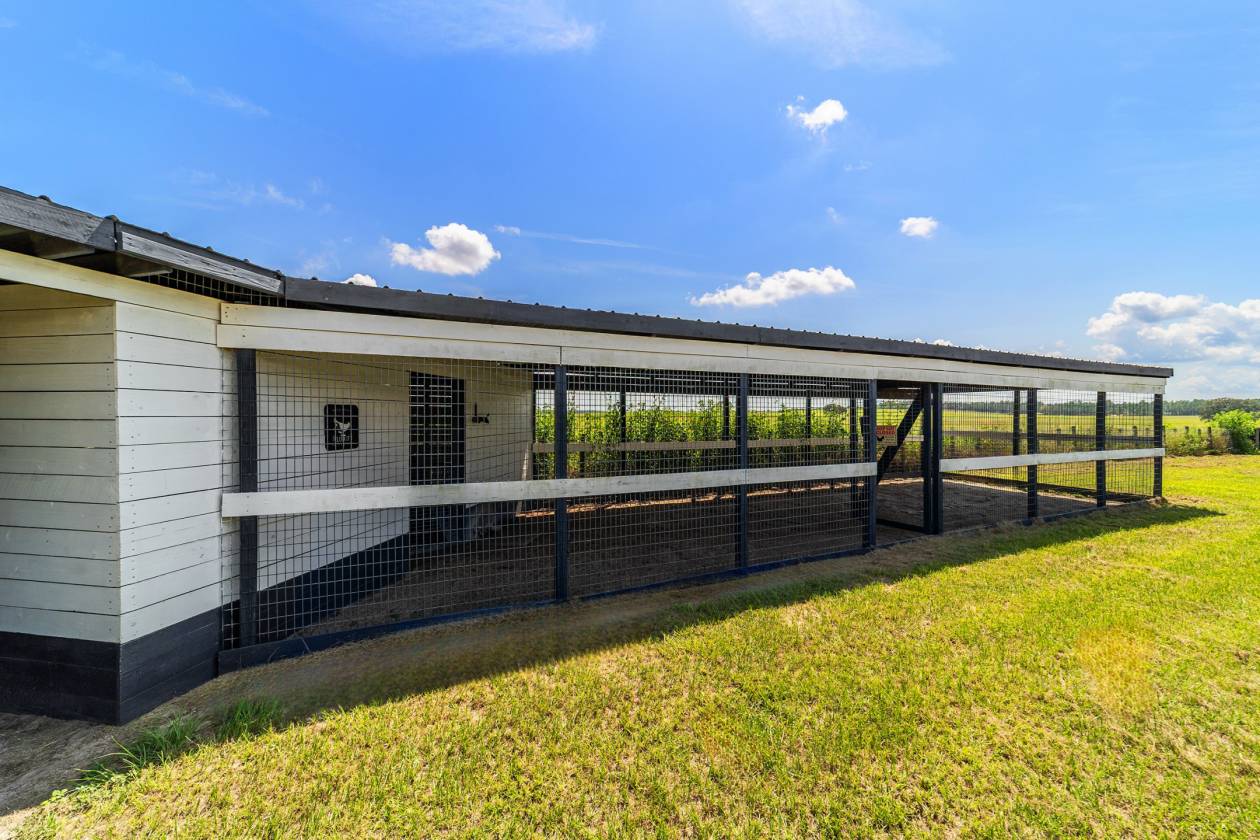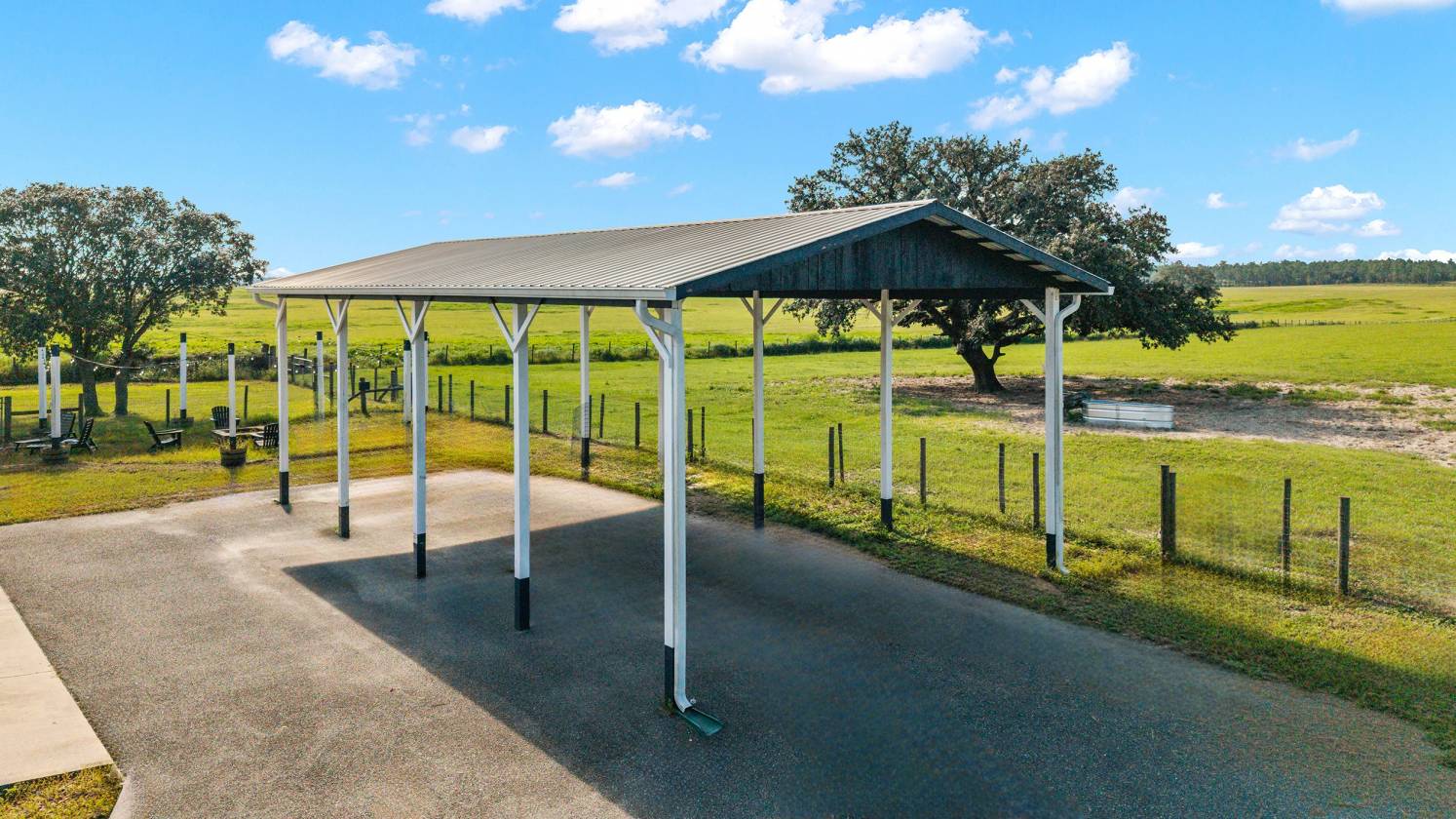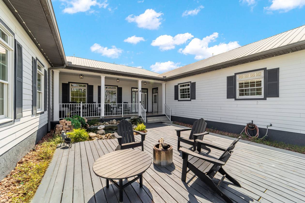 Perched atop a scenic hill with breathtaking views of over 100 acres of rolling pastureland, this exceptional 5-acre farm offers the perfect blend of luxury, privacy, and rural charm. As you pass through the gated entrance, a limerock drive leads to a circular asphalt driveway that brings you to the heart of the property—where a 6,000+ sq ft modern farmhouse, striking windmill centerpiece, and a collection of thoughtfully designed outbuildings await. A wide wooden front deck offers the perfect perch to enjoy panoramic sunsets or toast marshmallows by the fire. Step up to the charming rocking-chair front porch and peaceful koi pond before entering a foyer that opens into the light-filled main living area. The living room features cathedral picture windows, a gas fireplace with tiled surround, and French doors that lead to a private side porch with firepit and fenced area—ideal for cozy evenings. Porcelain tile floors and elegant chandeliers flow throughout the home. The gourmet kitchen is a chef’s dream with custom white cabinetry, a center island, eat-in breakfast bar, quartz countertops, and top-of-the-line Sub-Zero and Viking stainless steel appliances. A large stainless sink overlooks the backyard, while the open design creates a perfect space for cooking, entertaining, or morning coffee. On the north wing, you'll find a dedicated office with built-in shelving, a stylish half bath for guests, and the luxurious primary suite. The suite includes porch access, a walk-through closet, and a spa-like bath with dual sinks and an expansive double-head tiled shower. An additional guest suite with full bath and a utility room with outdoor access are also located on this side. On the opposite wing, you'll find a laundry room with utility sink and cabinetry, which leads to an insulated, climate-controlled 2-car garage featuring built-in dog crates. A private bedroom is located just off the garage—perfect for guests or extended family—and on the south side of the home there is another full bedroom and bath. Built with durability and energy efficiency in mind, this home features 12-inch poured concrete walls, new hurricane-rated windows, Icynene spray foam insulation, a 27kW Generac generator with 1,000-gallon propane tank, metal roof, 3 new HVAC units, tankless water heaters, and a whole-house water filtration system. Outdoors, the amenities are unmatched. A large Morton 48’x60’ barn includes a climate-controlled room, RV garage with roll-up doors, 50-amp hook-up, reinforced slab for Class A motorhomes, and a half bath with exterior access—making it ideal for events, workshops, or large equipment. A 4-bay utility shed is connected to a spacious chicken coop with indoor/outdoor runs, and a 40-foot pole barn offers RV or trailer storage. The fully fenced acreage includes one large pasture with a pole barn ready for two stalls, round pen, dog pens, an additional 3-sided metal storage building, and manicured landscaping throughout. Located high and dry, every corner of this property has been carefully designed for comfort, functionality, and farm lifestyle excellence.