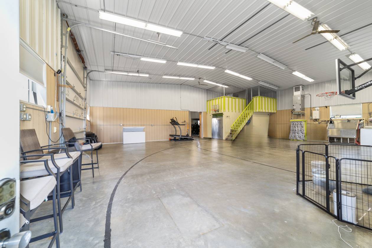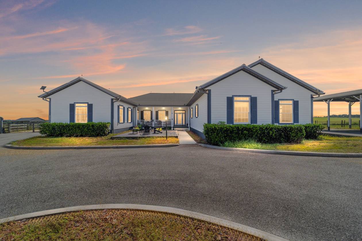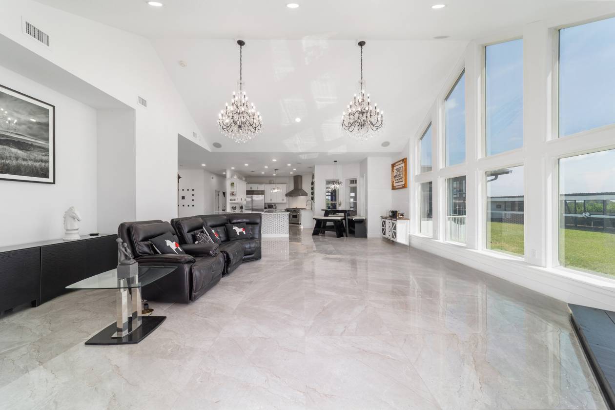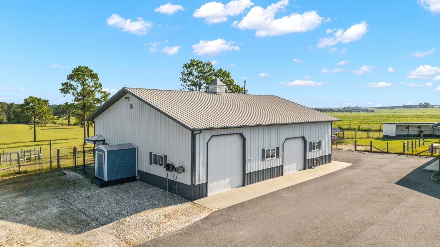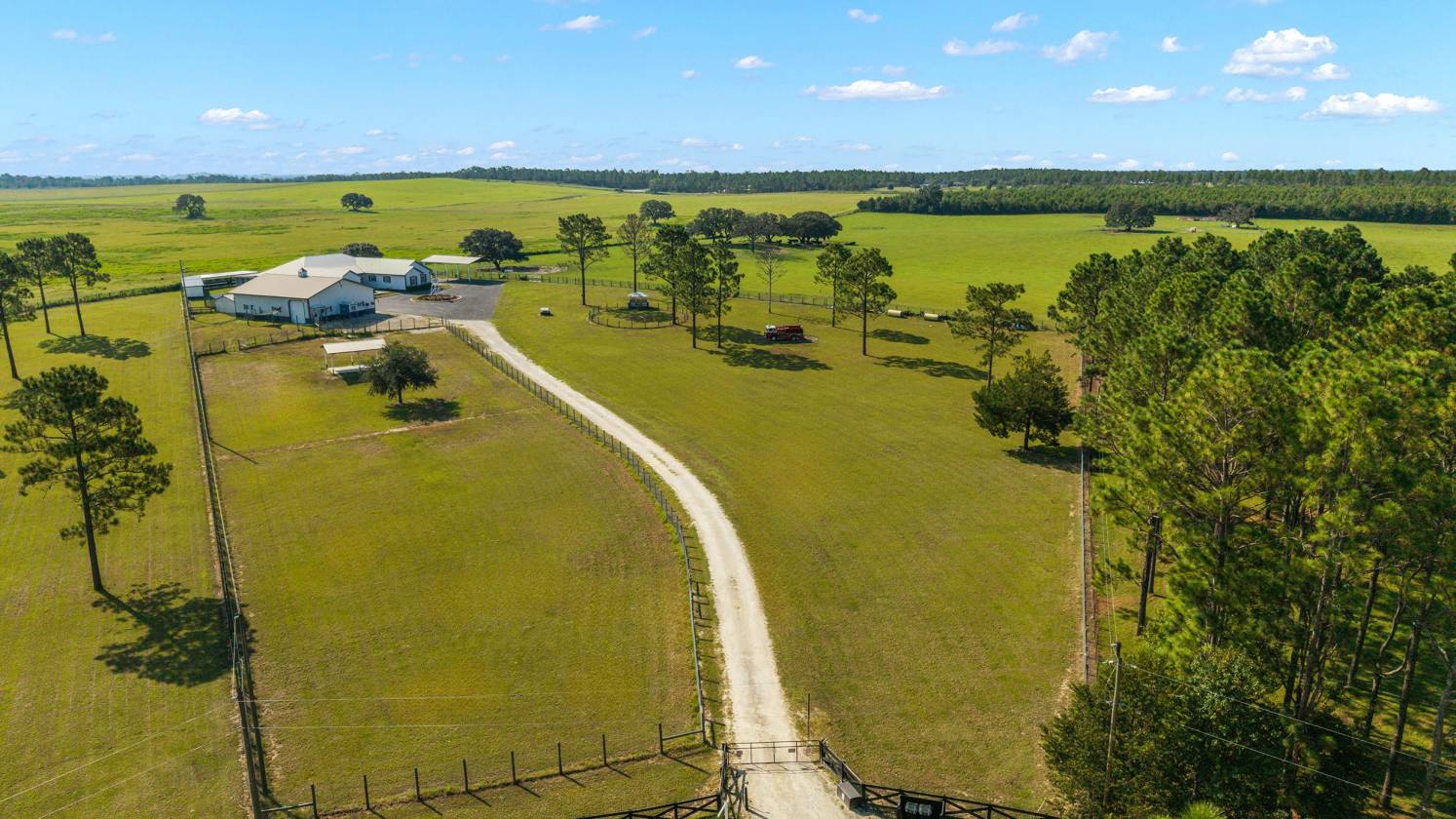 Perched atop a scenic hill with breathtaking views of over 100 acres of rolling pastureland, this exceptional 5-acre farm offers the perfect blend of luxury, privacy, and rural charm. As you pass through the gated entrance, a limerock drive leads to a circular asphalt driveway that brings you to the heart of the property—where a 6,000+ sq ft modern farmhouse, striking windmill centerpiece, and a collection of thoughtfully designed outbuildings await. A wide wooden front deck offers the perfect perch to enjoy panoramic sunsets or toast marshmallows by the fire. Step up to the charming rocking-chair front porch and peaceful koi pond before entering a foyer that opens into the light-filled main living area. The living room features cathedral picture windows, a gas fireplace with tiled surround, and French doors that lead to a private side porch with firepit and fenced area—ideal for cozy evenings. Porcelain tile floors and elegant chandeliers flow throughout the home. The gourmet kitchen is a chef’s dream with custom white cabinetry, a center island, eat-in breakfast bar, quartz countertops, and top-of-the-line Sub-Zero and Viking stainless steel appliances. A large stainless sink overlooks the backyard, while the open design creates a perfect space for cooking, entertaining, or morning coffee. On the north wing, you'll find a dedicated office with built-in shelving, a stylish half bath for guests, and the luxurious primary suite. The suite includes porch access, a walk-through closet, and a spa-like bath with dual sinks and an expansive double-head tiled shower. An additional guest suite with full bath and a utility room with outdoor access are also located on this side. On the opposite wing, you'll find a laundry room with utility sink and cabinetry, which leads to an insulated, climate-controlled 2-car garage featuring built-in dog crates. A private bedroom is located just off the garage—perfect for guests or extended family—and on the south side of the home there is another full bedroom and bath. Built with durability and energy efficiency in mind, this home features 12-inch poured concrete walls, new hurricane-rated windows, Icynene spray foam insulation, a 27kW Generac generator with 1,000-gallon propane tank, metal roof, 3 new HVAC units, tankless water heaters, and a whole-house water filtration system. Outdoors, the amenities are unmatched. A large Morton 48’x60’ barn includes a climate-controlled room, RV garage with roll-up doors, 50-amp hook-up, reinforced slab for Class A motorhomes, and a half bath with exterior access—making it ideal for events, workshops, or large equipment. A 4-bay utility shed is connected to a spacious chicken coop with indoor/outdoor runs, and a 40-foot pole barn offers RV or trailer storage. The fully fenced acreage includes one large pasture with a pole barn ready for two stalls, round pen, dog pens, an additional 3-sided metal storage building, and manicured landscaping throughout. Located high and dry, every corner of this property has been carefully designed for comfort, functionality, and farm lifestyle excellence.