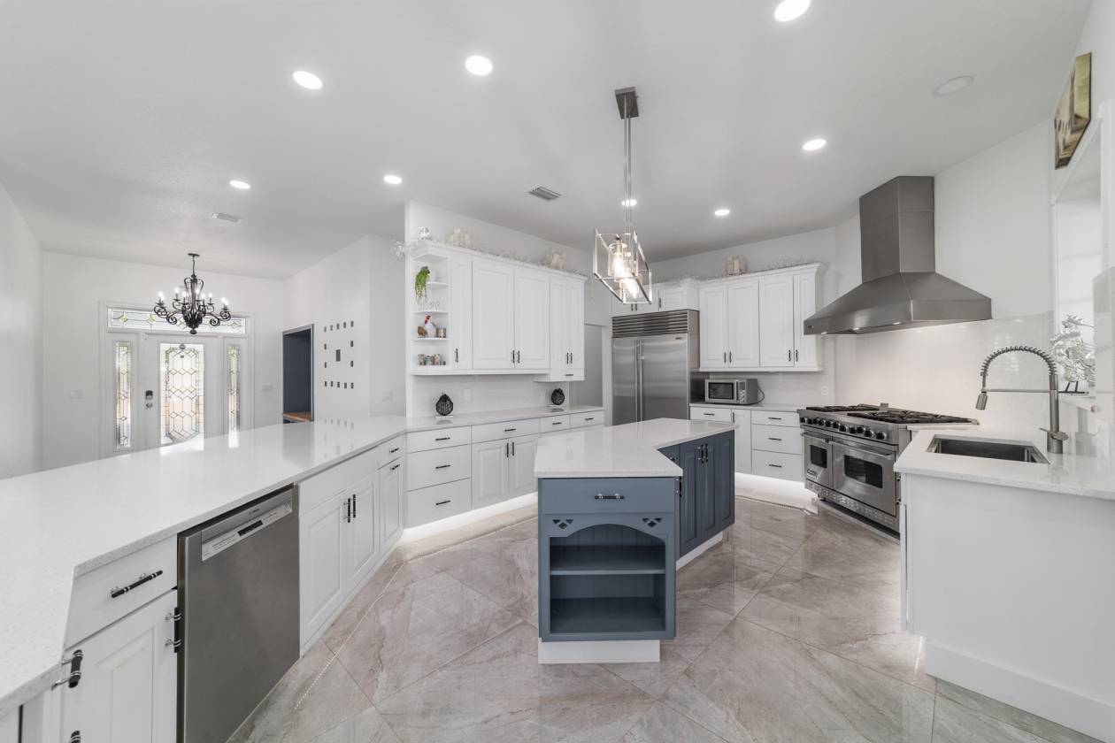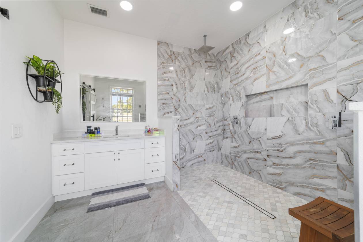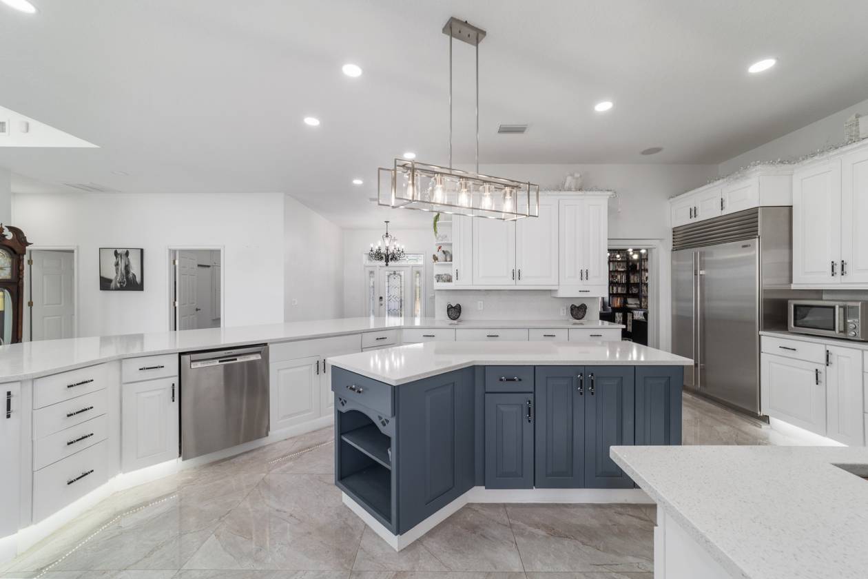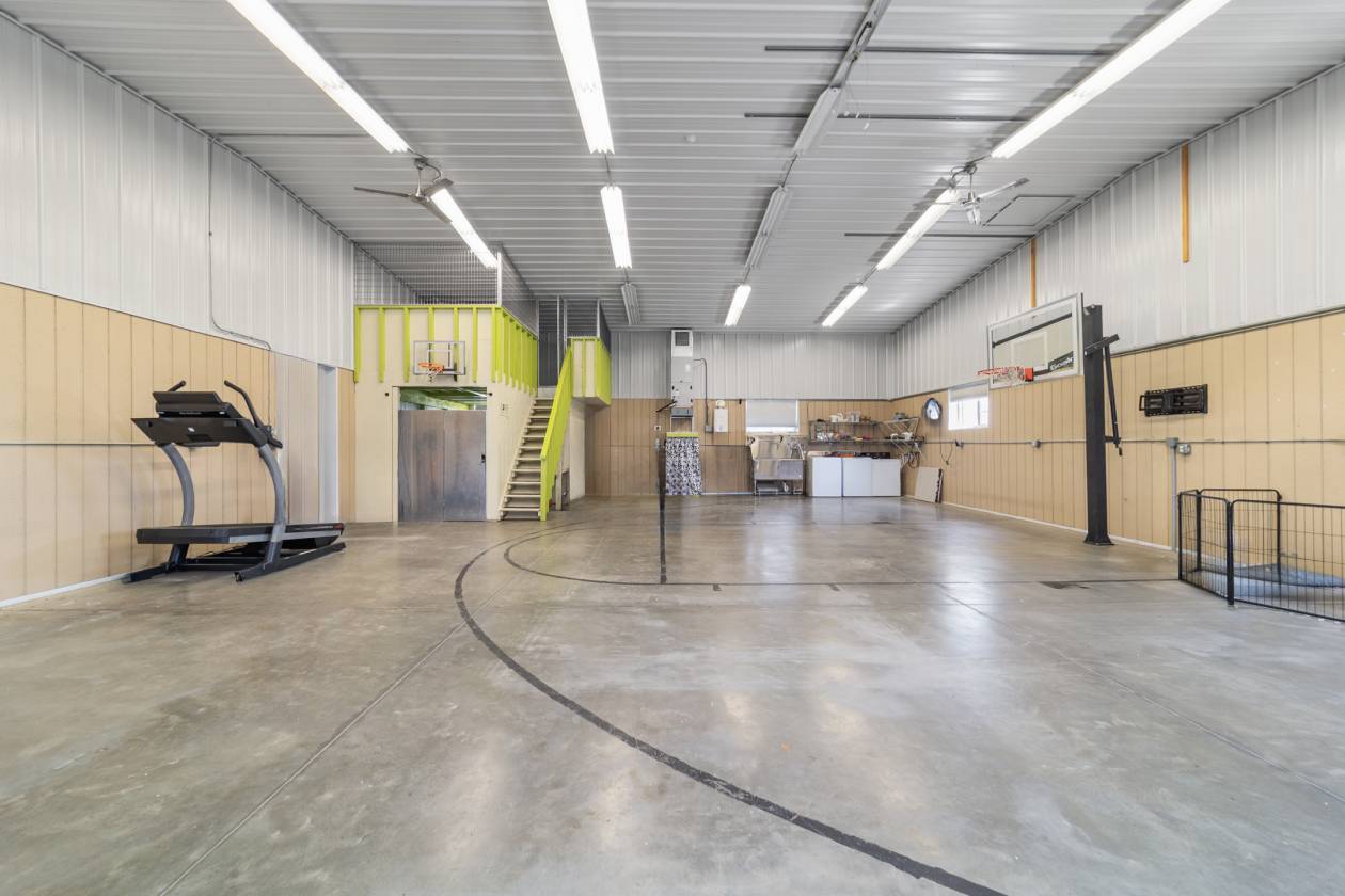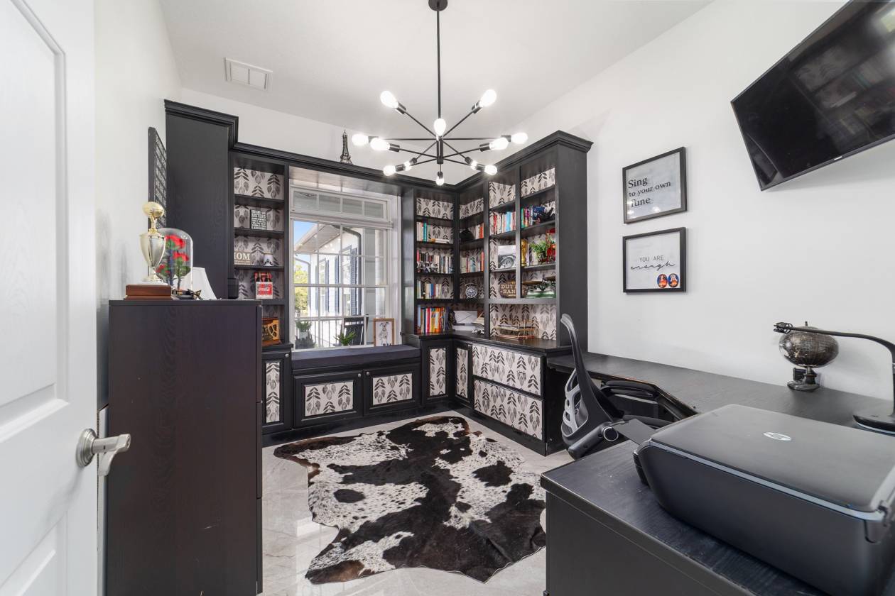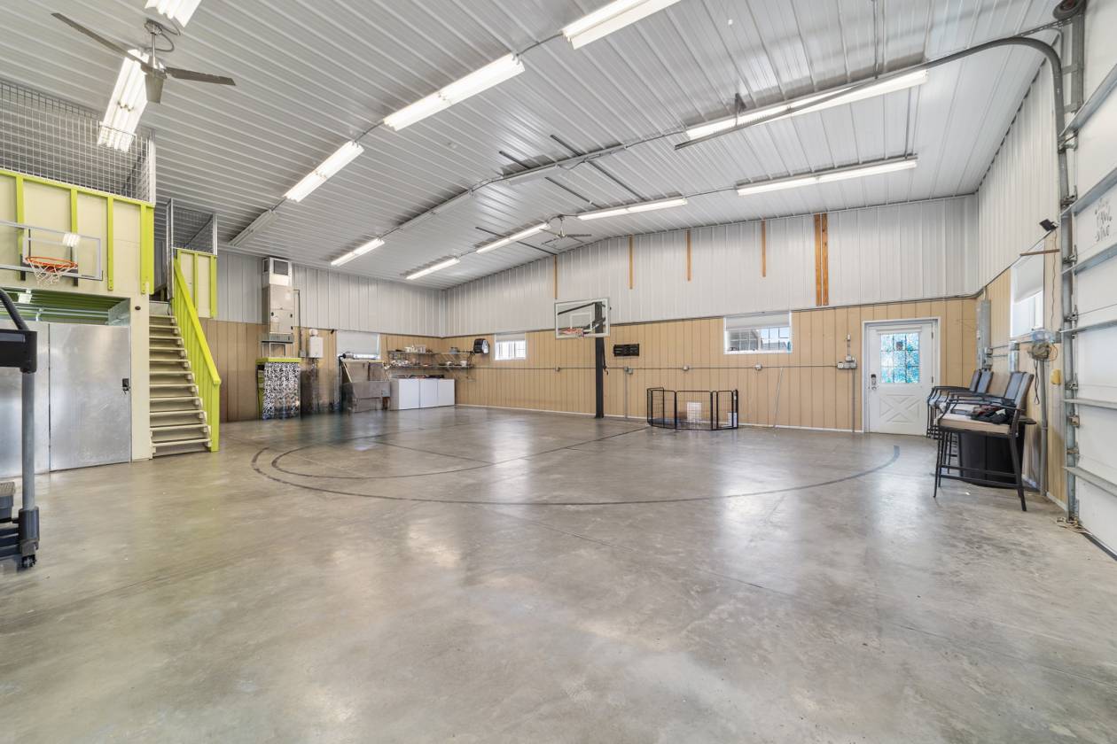 Perched atop a scenic hill with breathtaking views of over 100 acres of rolling pastureland, this exceptional 5-acre farm offers the perfect blend of luxury, privacy, and rural charm. As you pass through the gated entrance, a limerock drive leads to a circular asphalt driveway that brings you to the heart of the property—where a 6,000+ sq ft modern farmhouse, striking windmill centerpiece, and a collection of thoughtfully designed outbuildings await. A wide wooden front deck offers the perfect perch to enjoy panoramic sunsets or toast marshmallows by the fire. Step up to the charming rocking-chair front porch and peaceful koi pond before entering a foyer that opens into the light-filled main living area. The living room features cathedral picture windows, a gas fireplace with tiled surround, and French doors that lead to a private side porch with firepit and fenced area—ideal for cozy evenings. Porcelain tile floors and elegant chandeliers flow throughout the home. The gourmet kitchen is a chef’s dream with custom white cabinetry, a center island, eat-in breakfast bar, quartz countertops, and top-of-the-line Sub-Zero and Viking stainless steel appliances. A large stainless sink overlooks the backyard, while the open design creates a perfect space for cooking, entertaining, or morning coffee. On the north wing, you'll find a dedicated office with built-in shelving, a stylish half bath for guests, and the luxurious primary suite. The suite includes porch access, a walk-through closet, and a spa-like bath with dual sinks and an expansive double-head tiled shower. An additional guest suite with full bath and a utility room with outdoor access are also located on this side. On the opposite wing, you'll find a laundry room with utility sink and cabinetry, which leads to an insulated, climate-controlled 2-car garage featuring built-in dog crates. A private bedroom is located just off the garage—perfect for guests or extended family—and on the south side of the home there is another full bedroom and bath. Built with durability and energy efficiency in mind, this home features 12-inch poured concrete walls, new hurricane-rated windows, Icynene spray foam insulation, a 27kW Generac generator with 1,000-gallon propane tank, metal roof, 3 new HVAC units, tankless water heaters, and a whole-house water filtration system. Outdoors, the amenities are unmatched. A large Morton 48’x60’ barn includes a climate-controlled room, RV garage with roll-up doors, 50-amp hook-up, reinforced slab for Class A motorhomes, and a half bath with exterior access—making it ideal for events, workshops, or large equipment. A 4-bay utility shed is connected to a spacious chicken coop with indoor/outdoor runs, and a 40-foot pole barn offers RV or trailer storage. The fully fenced acreage includes one large pasture with a pole barn ready for two stalls, round pen, dog pens, an additional 3-sided metal storage building, and manicured landscaping throughout. Located high and dry, every corner of this property has been carefully designed for comfort, functionality, and farm lifestyle excellence.