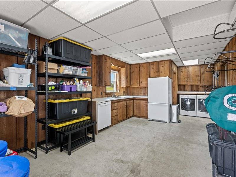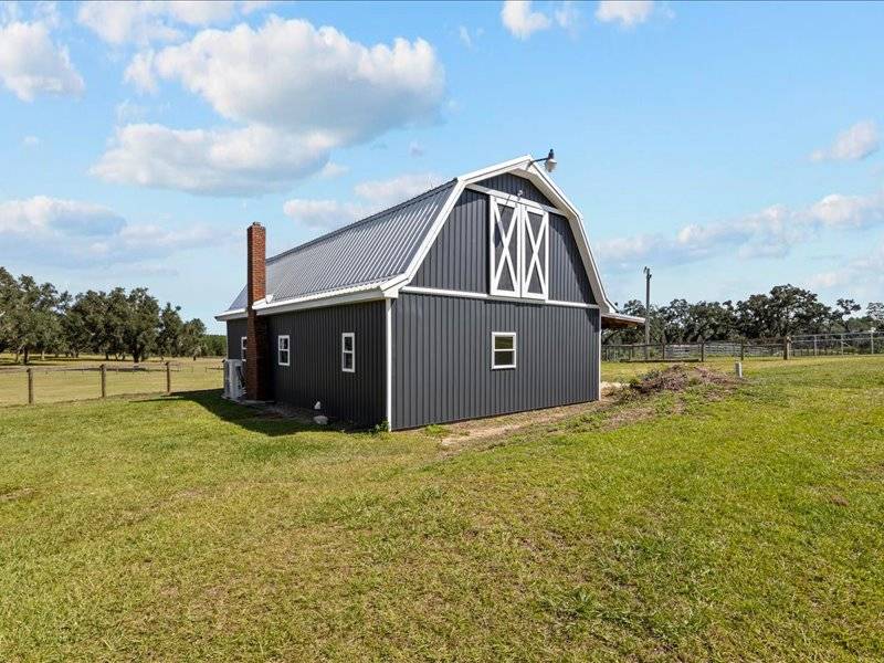 - • Main barn with 2x6 construction, full bathroom, kitchen, laundry, large garage, and upstairs loft with mini-split heating/cooling — adaptable for equestrian use