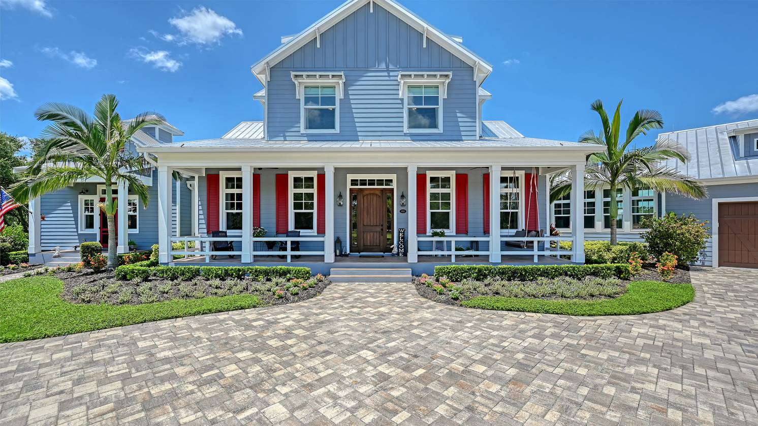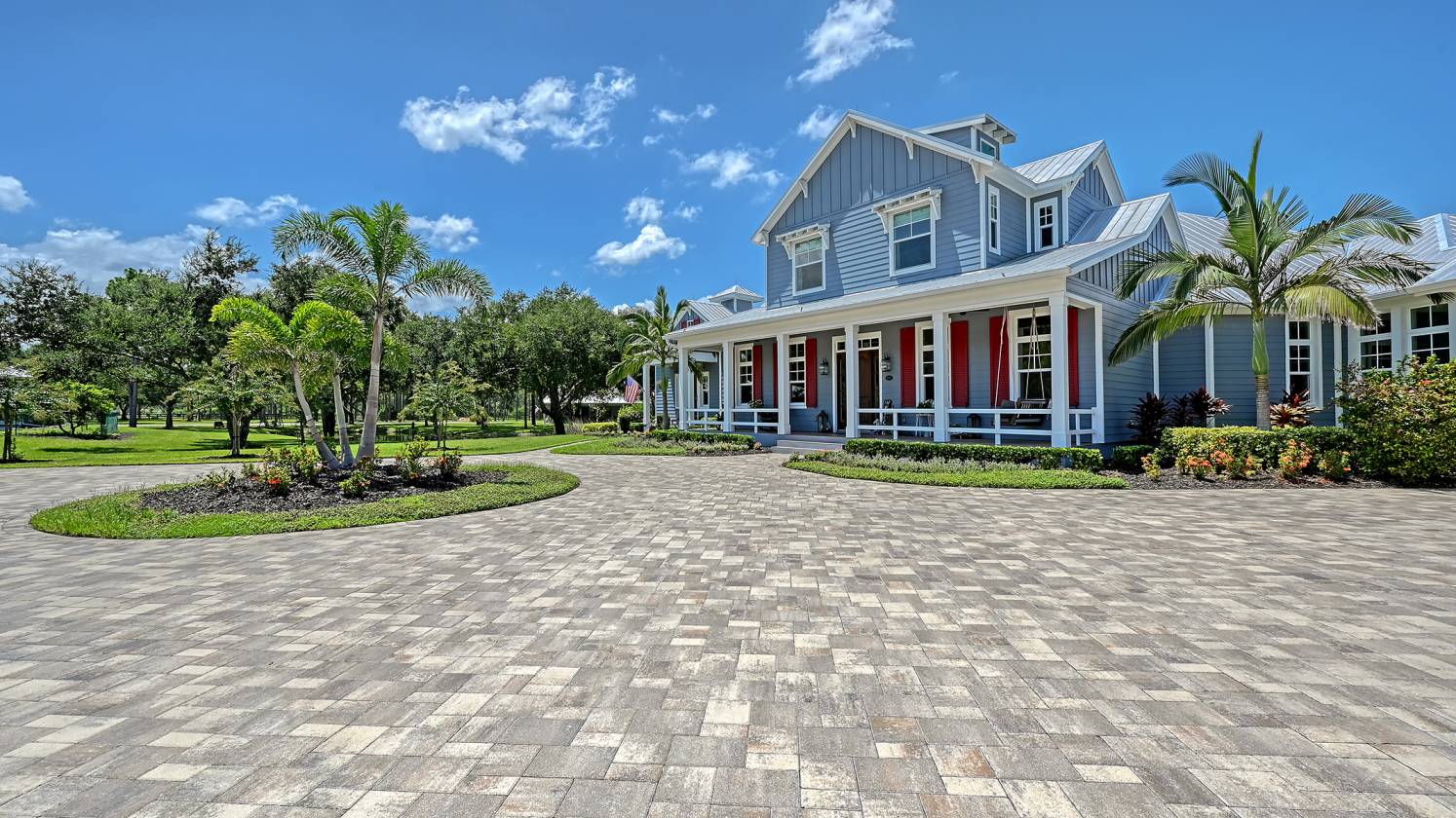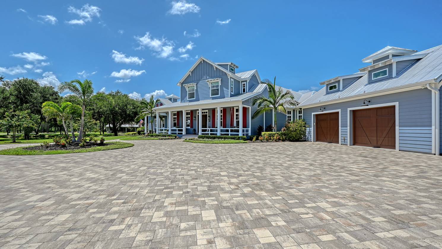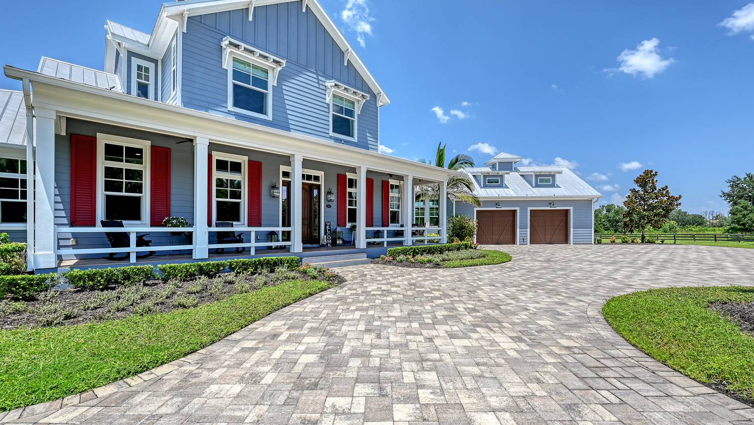 - Driveway & Walkways: A12’ wide paver driveway in a Patriot-style straight T pattern (Red/Tan/Charcoal) connects to a circular parking area and 4’ wide walkways to the front and master entry porches. Smooth-finish concrete graces the entry porch, lanai, and garage, with a full flake epoxy finish in the garage.