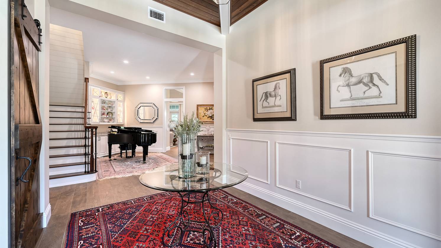 - Flooring: 2– Haven Barrel 8"x40" porcelain tile in a random pattern graces the foyer, kitchen, living room, vestibule, storage closet, dining room, wet bar, pantry, A/C closet, hallway, laundry, and mud room, with two inlay transition borders off the kitchen.– Naturally Aged Medallion Collection wire-brushed oak (5/8" thick, Maui Brown) in Her/His Master suites, hallways, walk-in closets, stairs, second-floor landing, hallway, Bedrooms #2 & #3, and storage closet, installed with moisture glue adhesive and varied-shade stair nose moldings.– Abound carpet runner adorns the stairs with painted risers and a flared bottom tread.